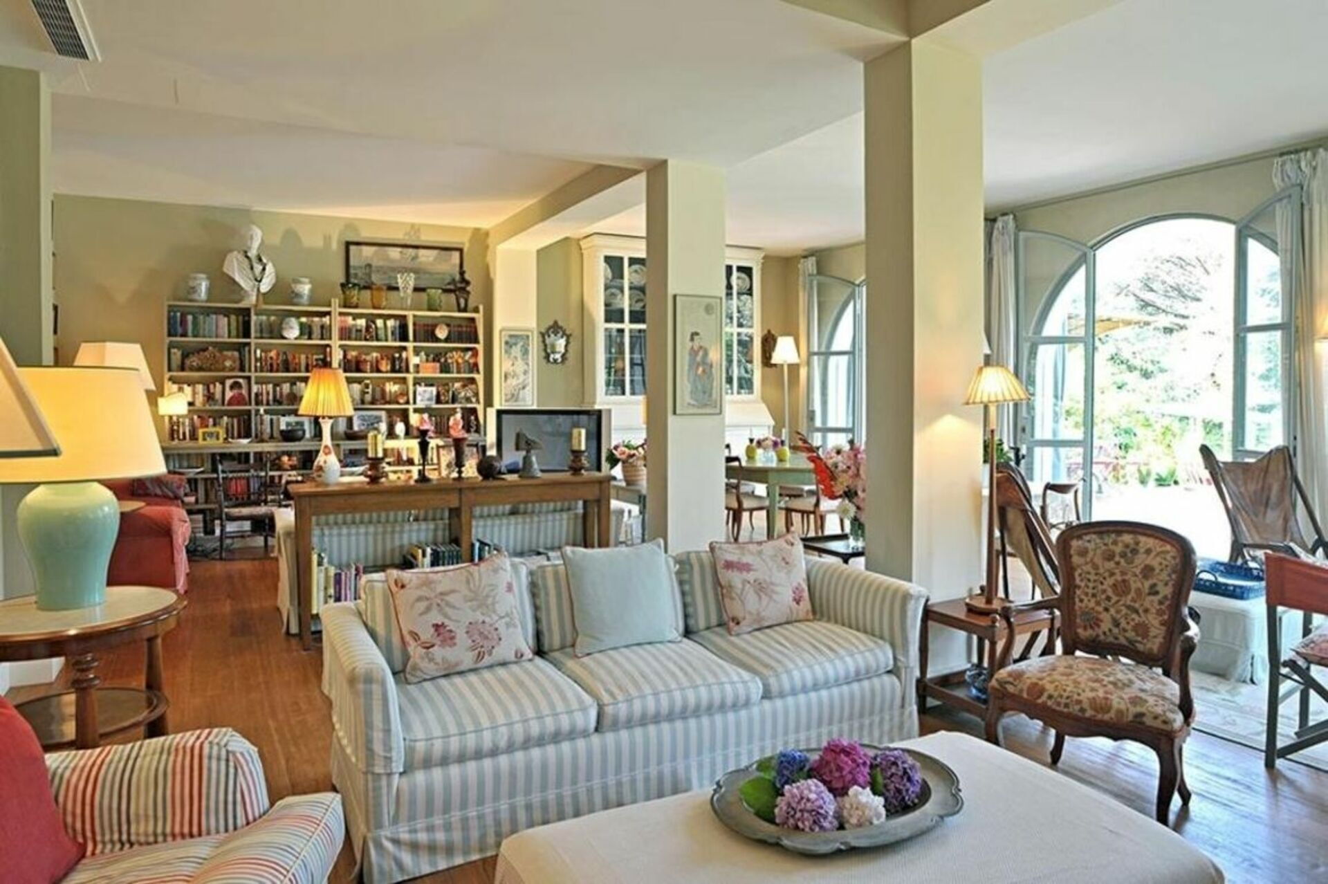 Ampio soggiorno con divani, poltrone, tavolo da pranzo e caminetto, con uscita sulla veranda arredata per pasti all'aperto.