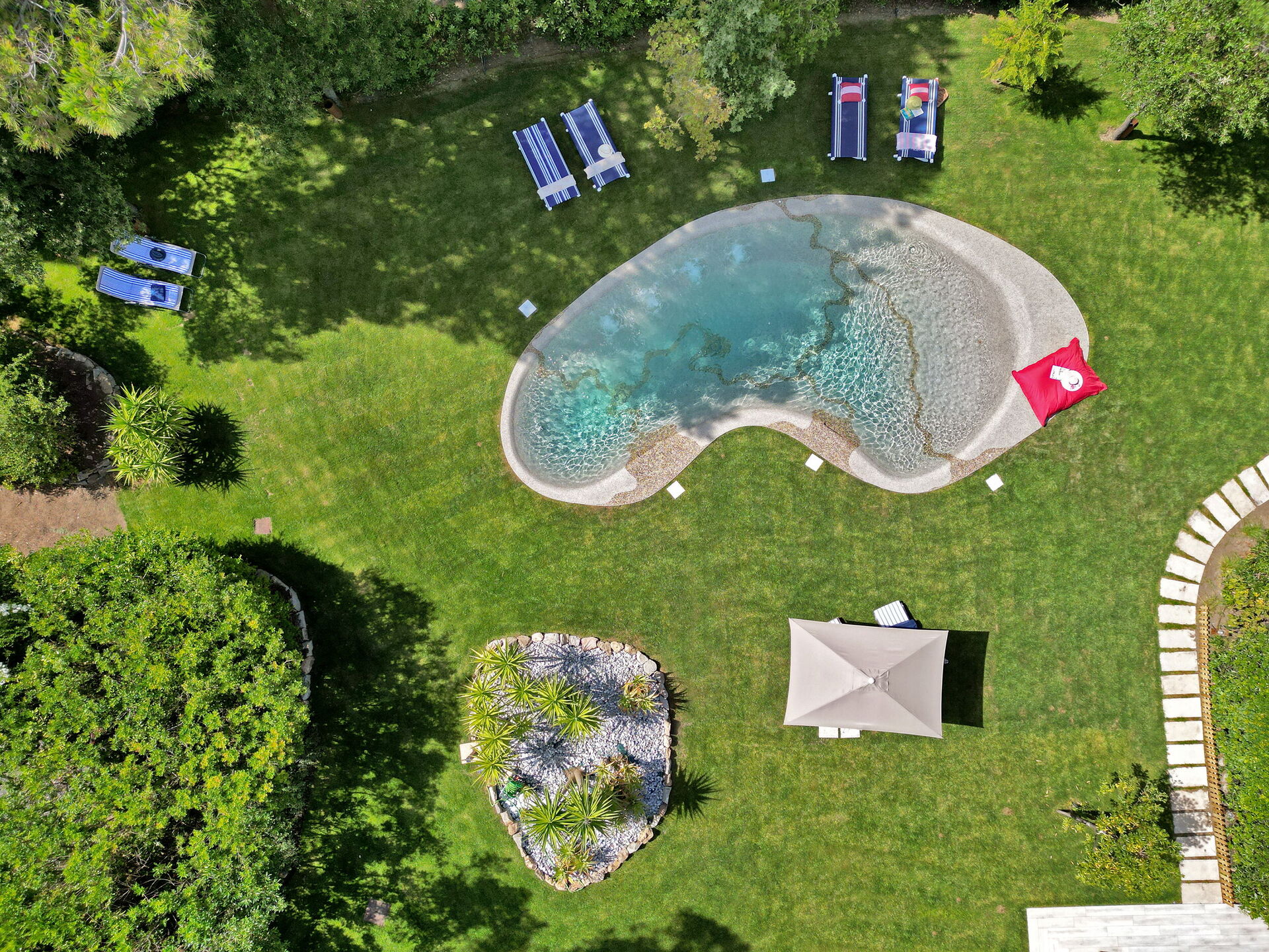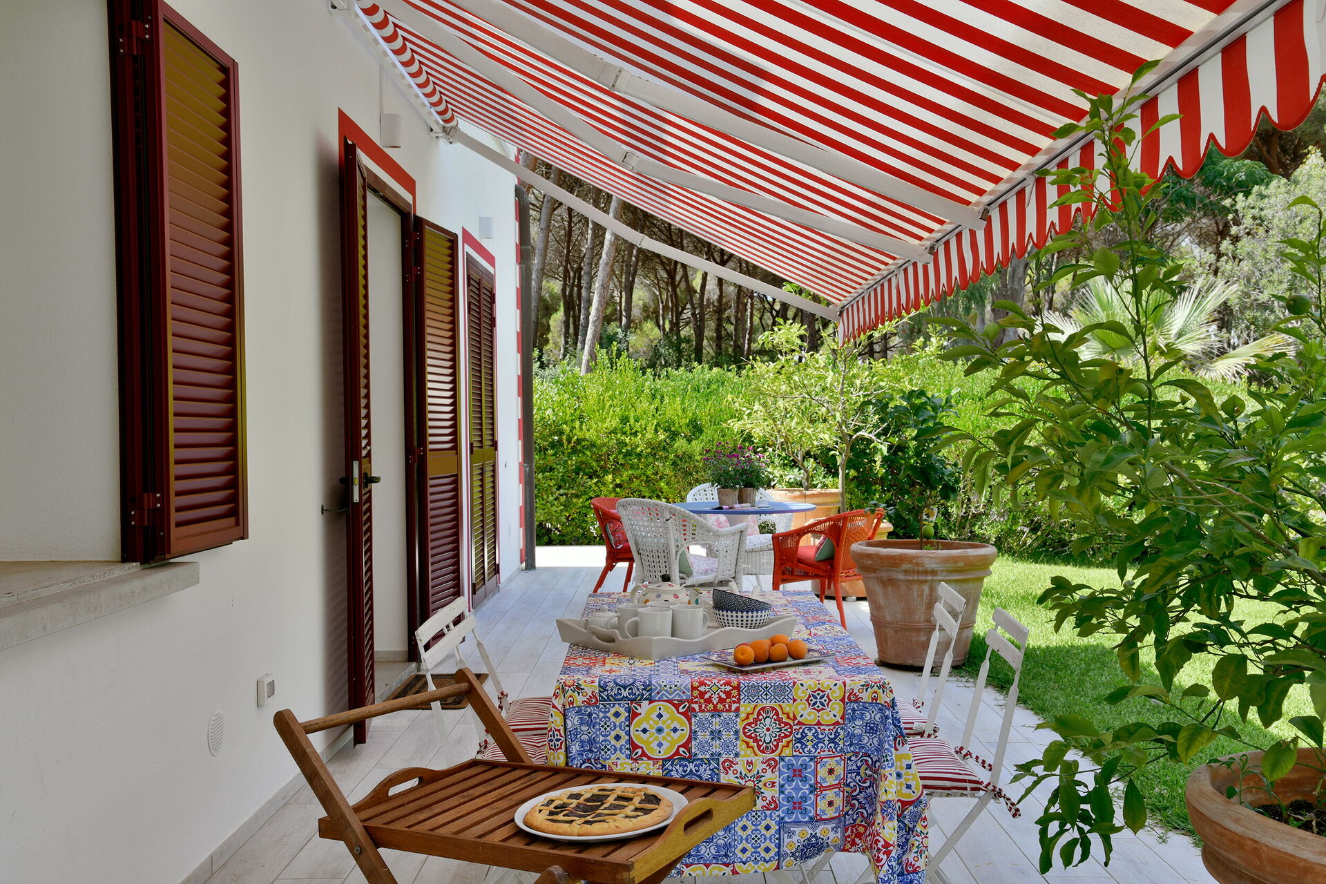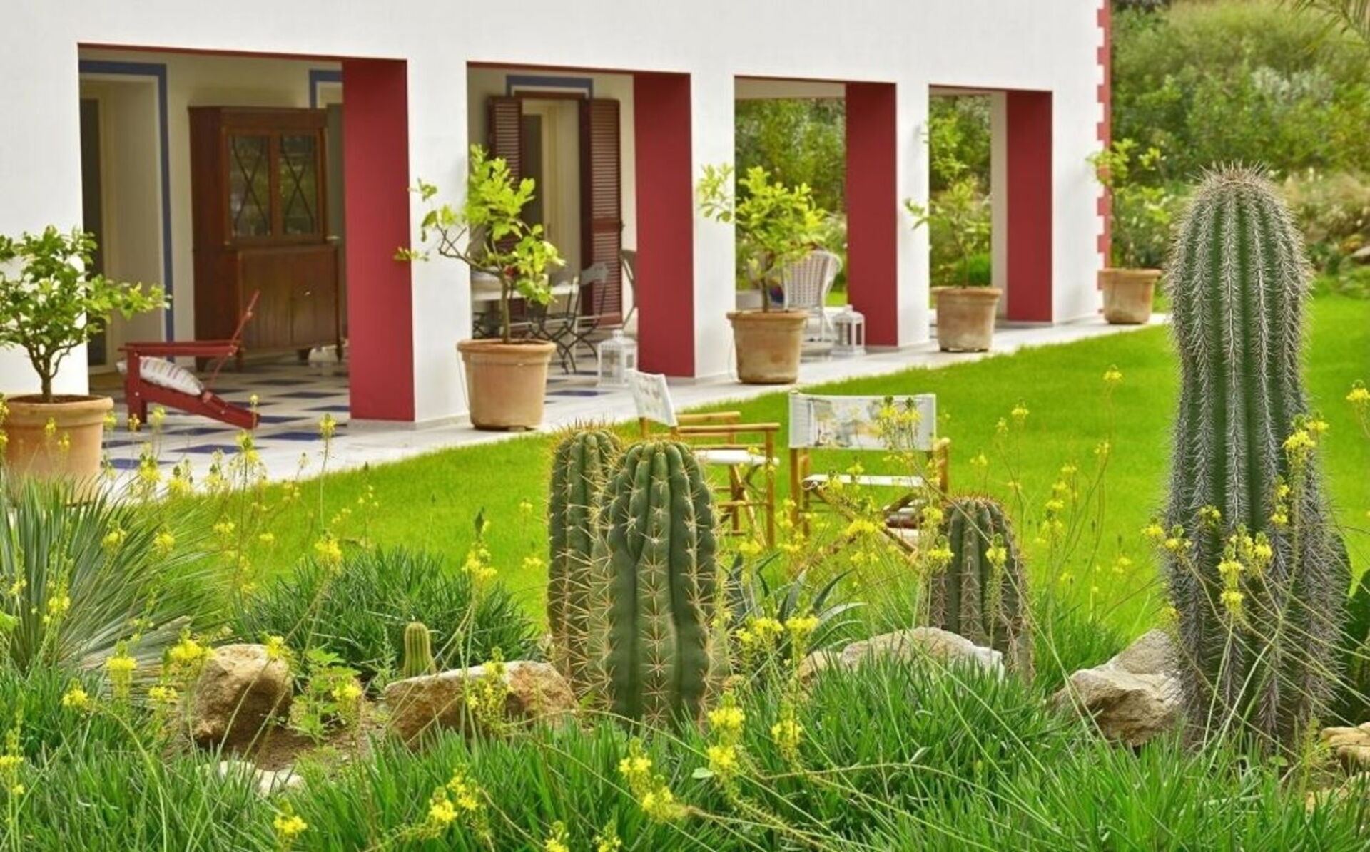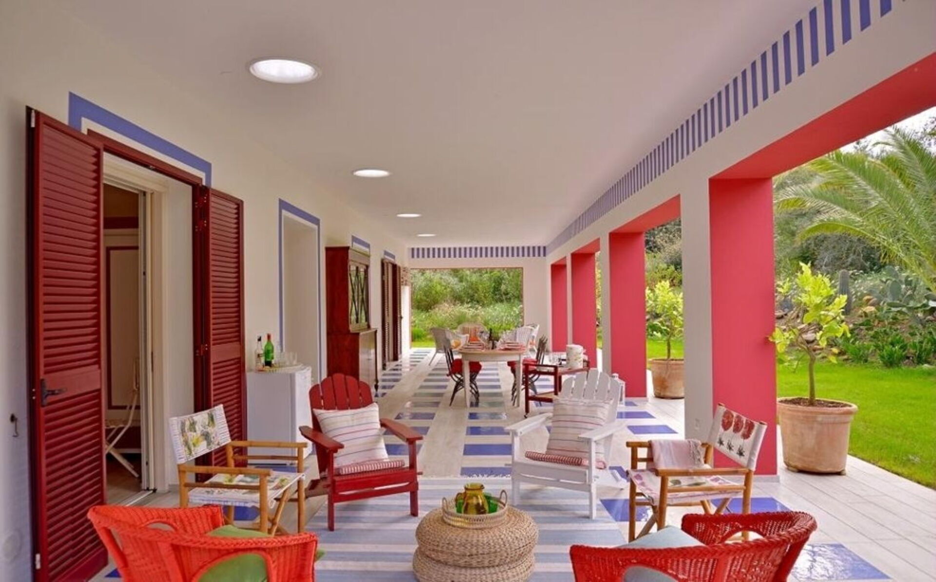 Beach Front Casa Rossa è circondata da un giardino ben curato con prato, cactus, palme e limoni, capace di regalare un'atmosfera esotica al paesaggio. Il giardino è accessibile da ogni stanza della villa attraverso delle porte-finestre.Sotto il grande portico troviamo un tavolo da pranzo per 8 persone e un'area lounge per rilassarsi dopo una giornata al mare.