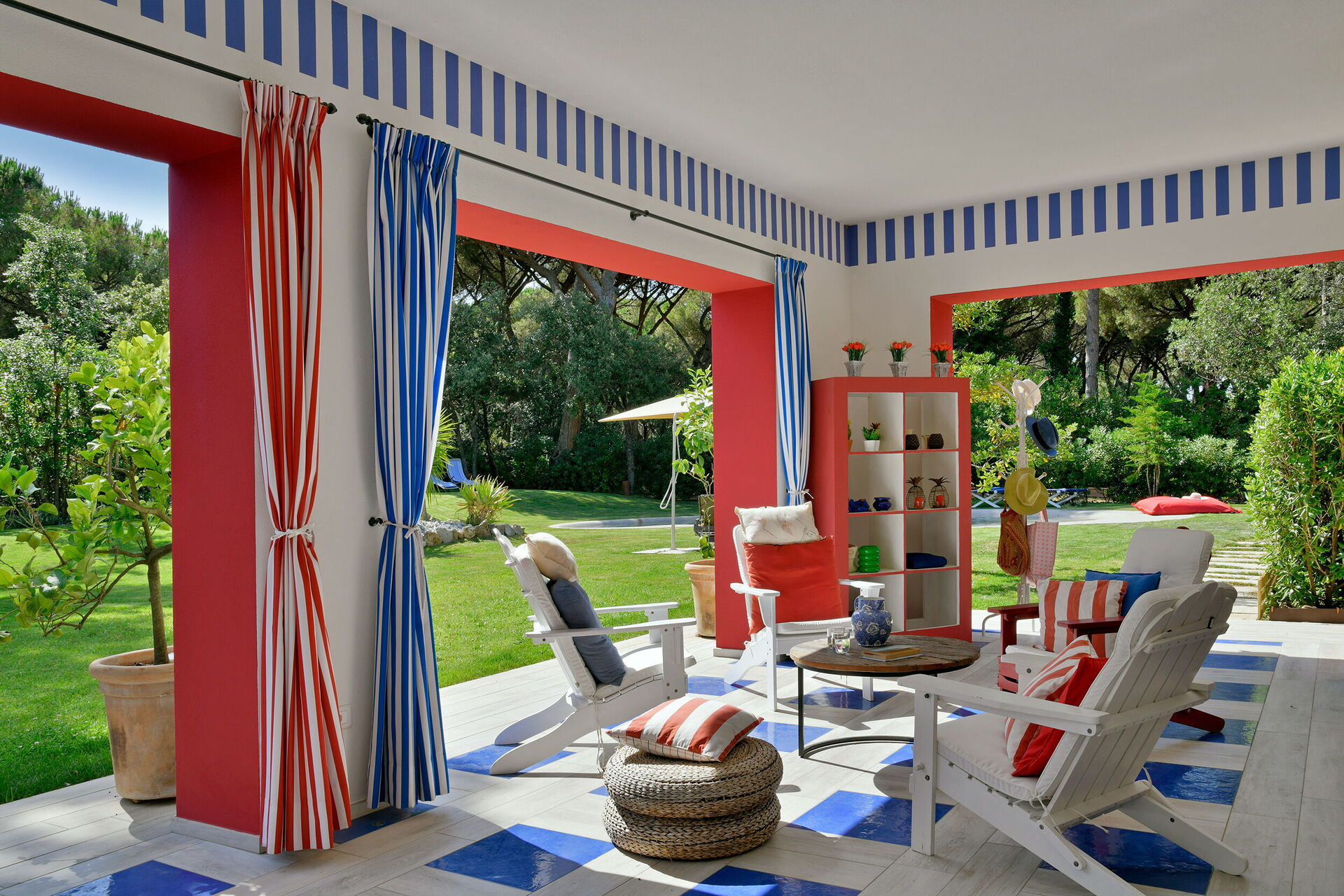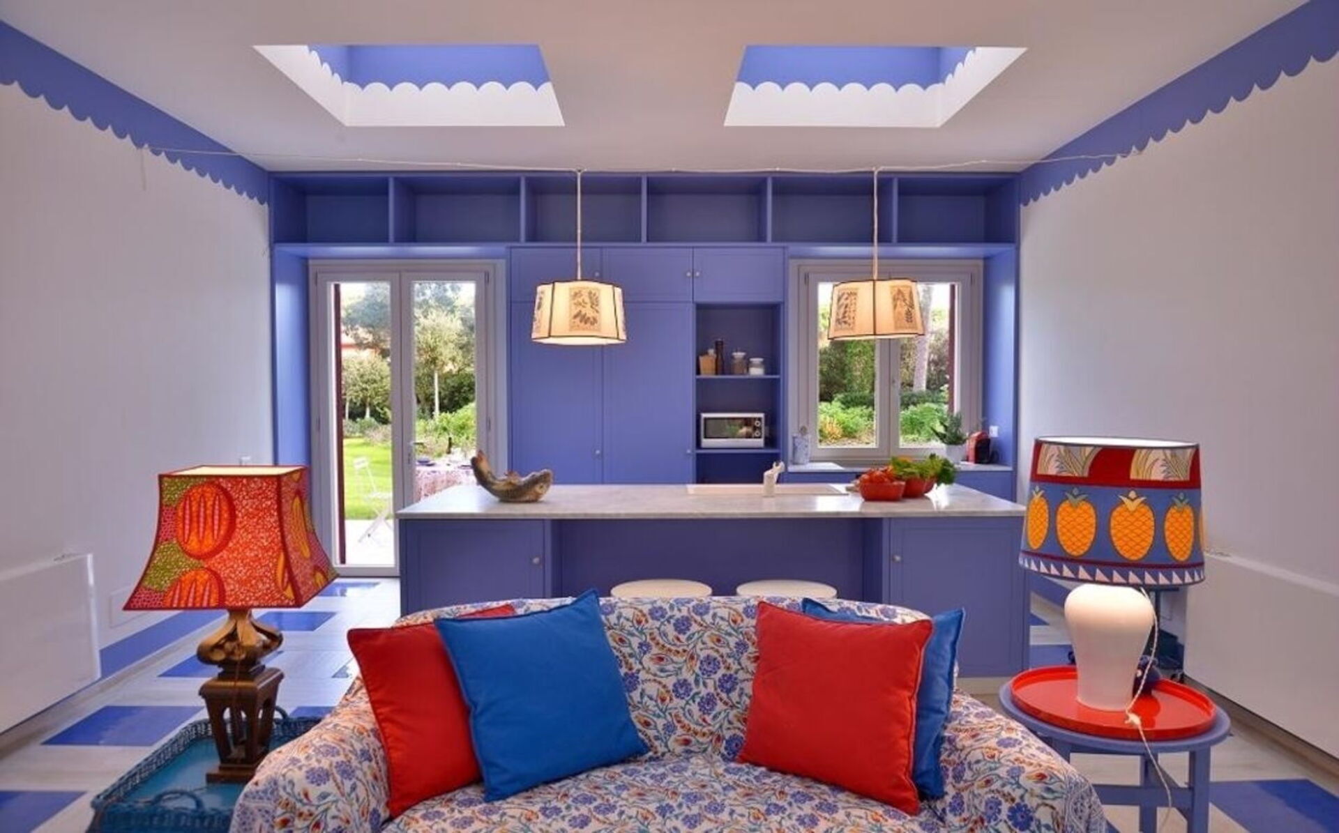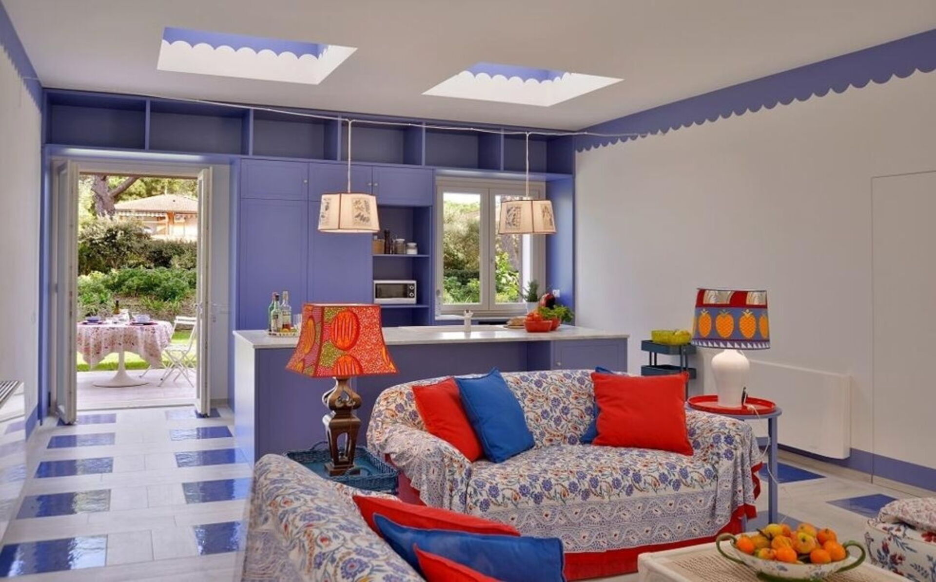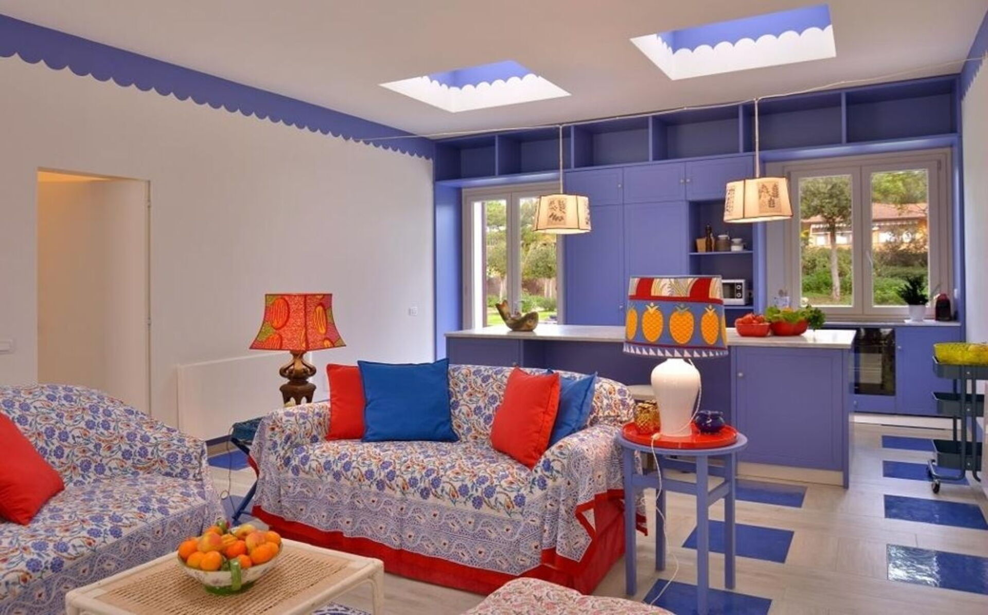 La proprietà - disposta su un unico piano e arredata in stile moderno nei colori rosso acceso, blu e bianco - può ospitare fino a 8 persone per un totale di 4 camere da letto e 4 bagni.