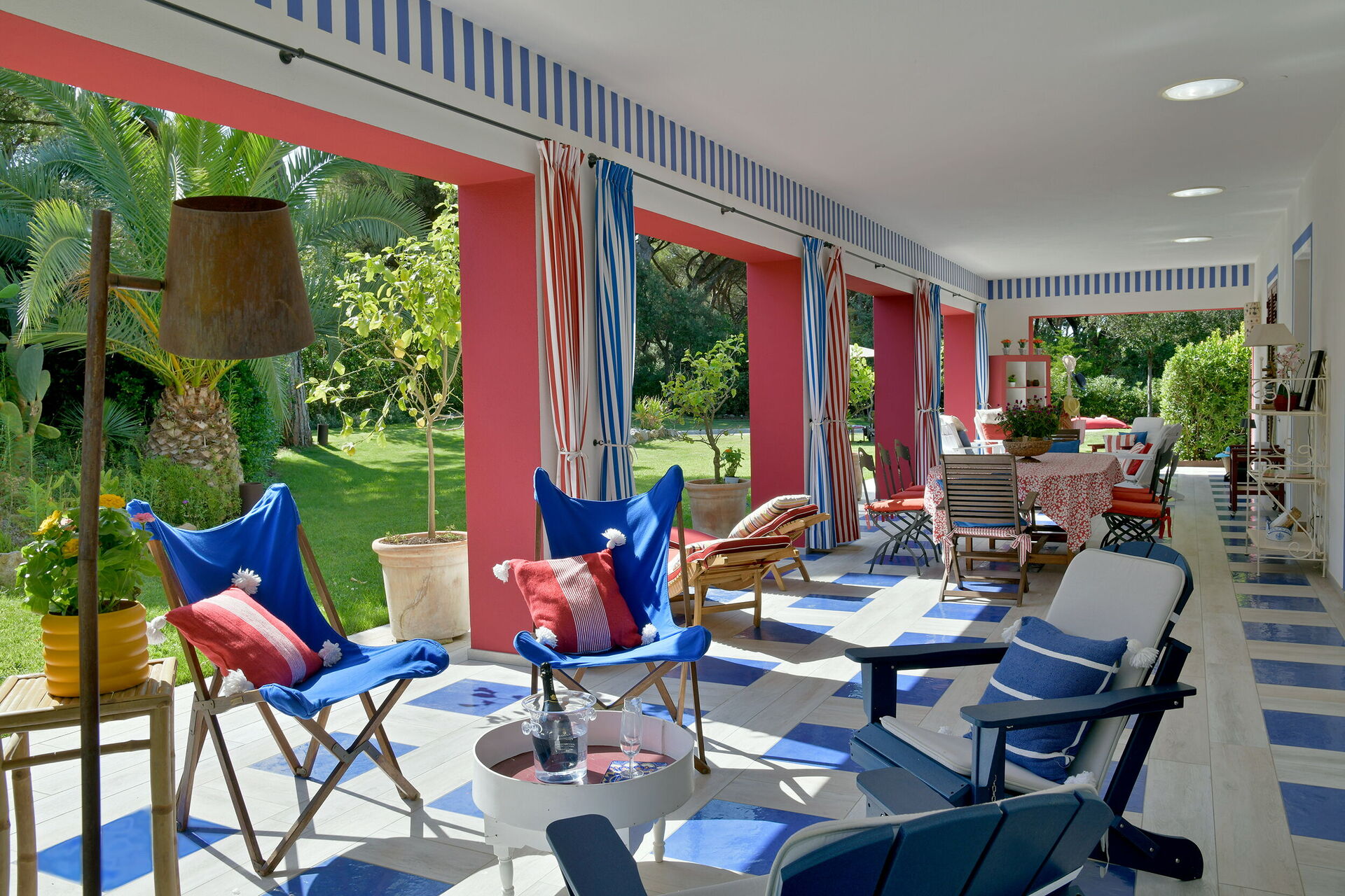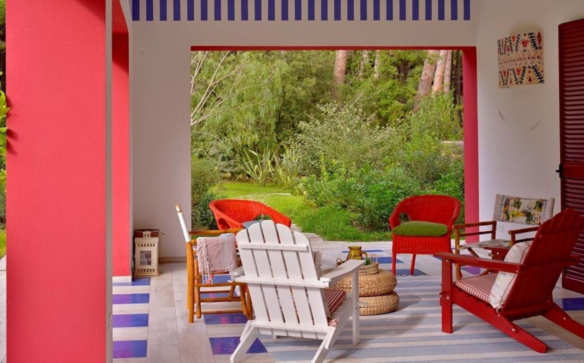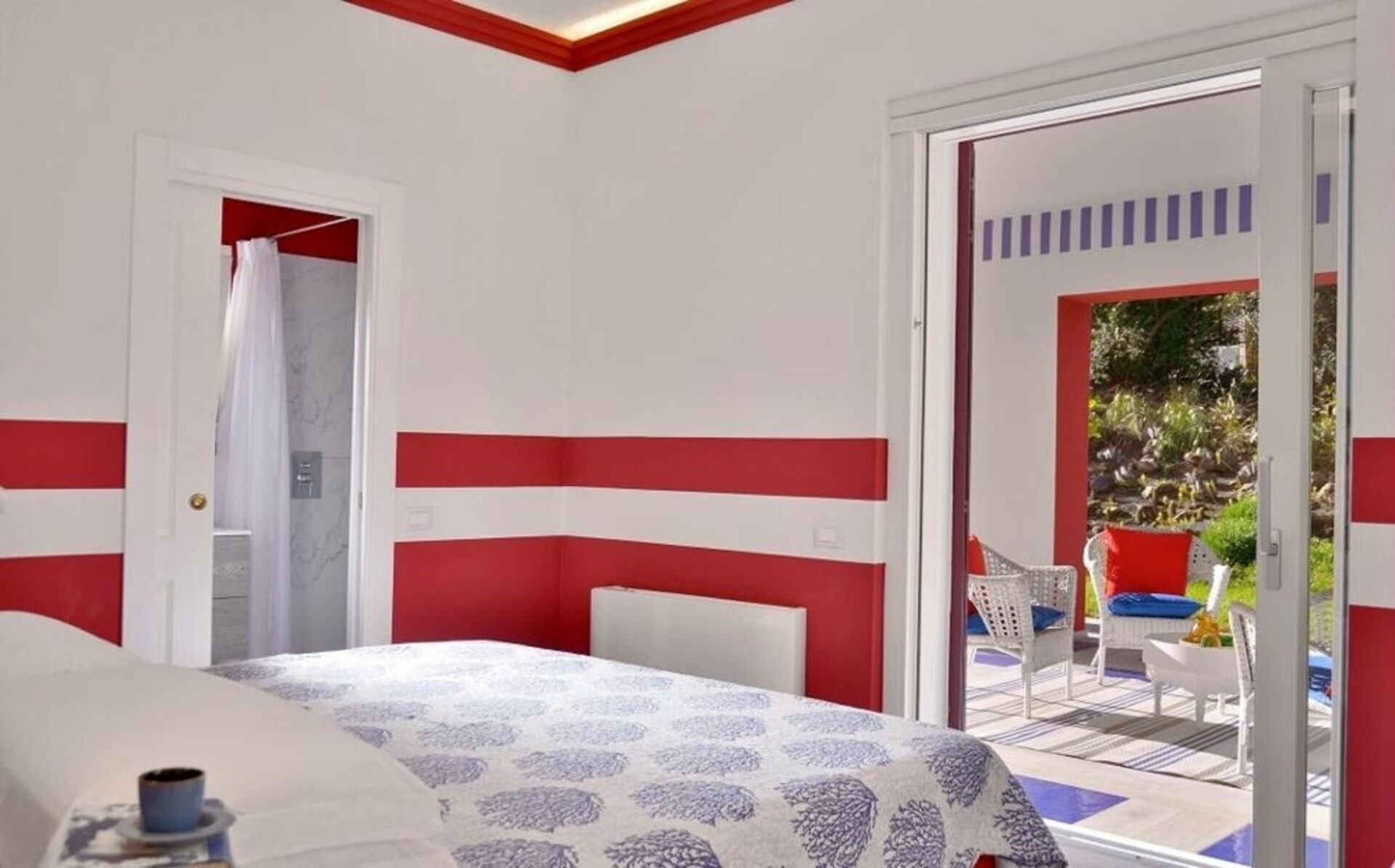 La proprietà - disposta su un unico piano e arredata in stile moderno nei colori rosso acceso, blu e bianco - può ospitare fino a 8 persone per un totale di 4 camere da letto e 4 bagni.
