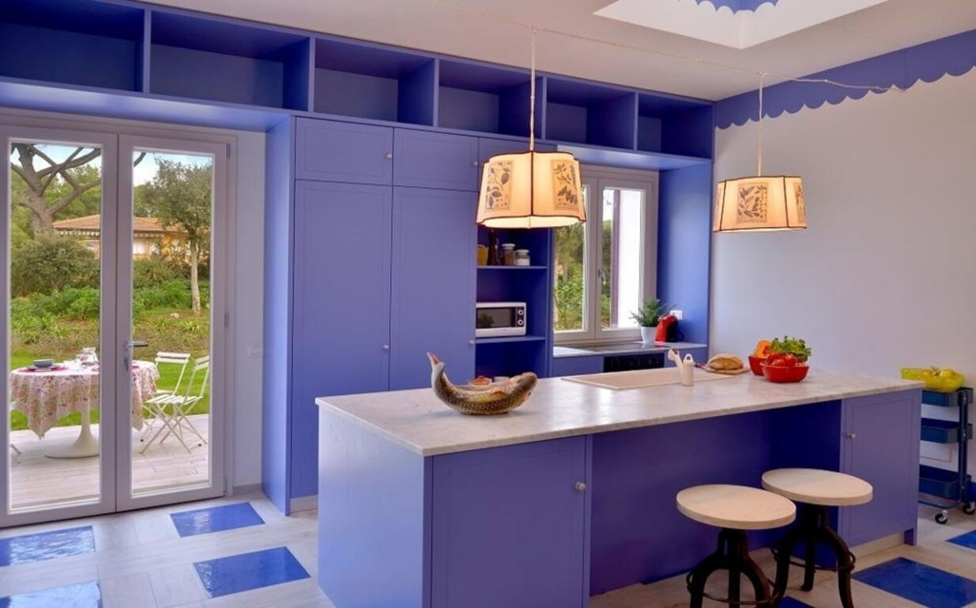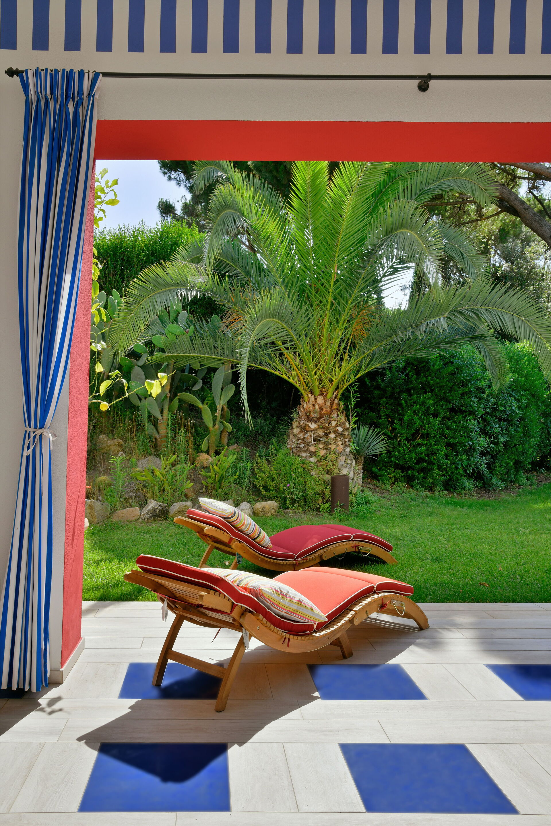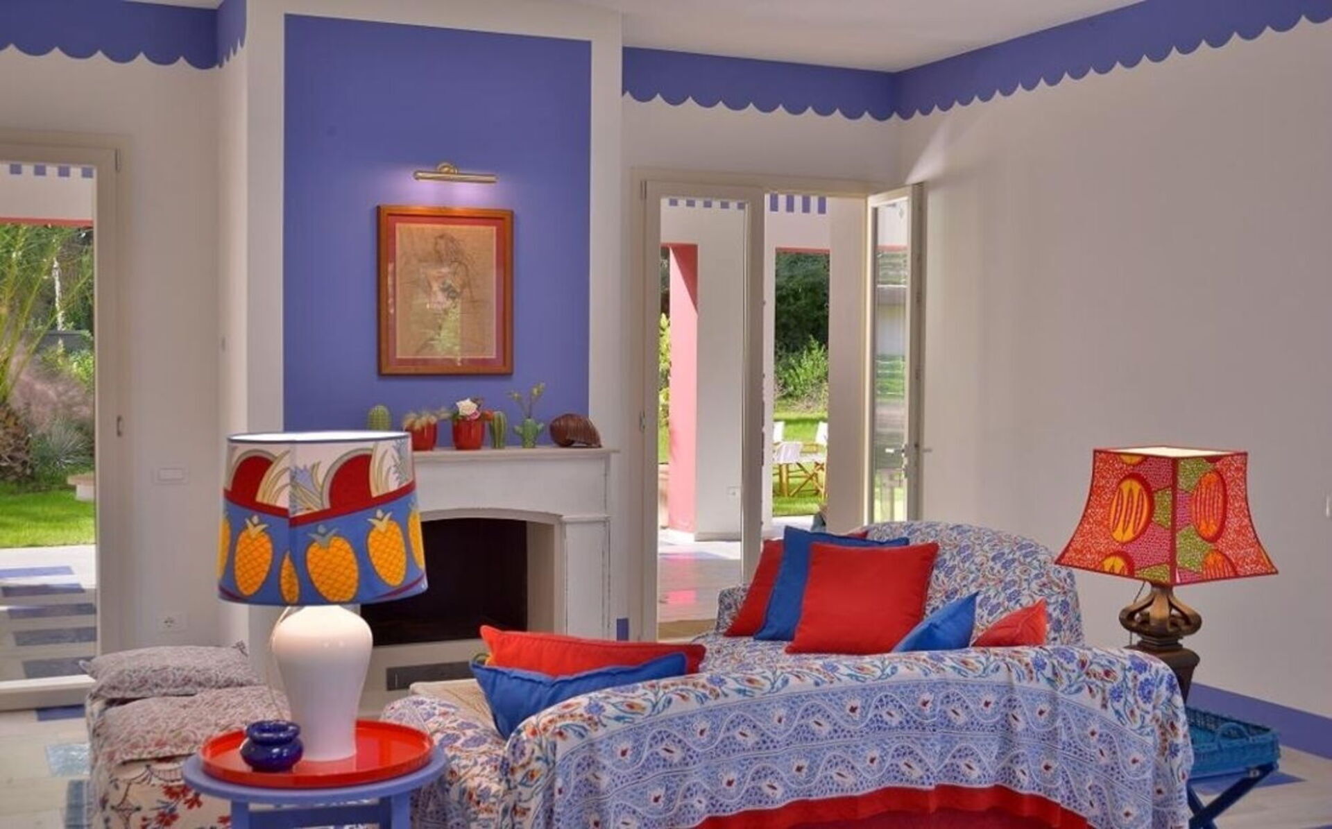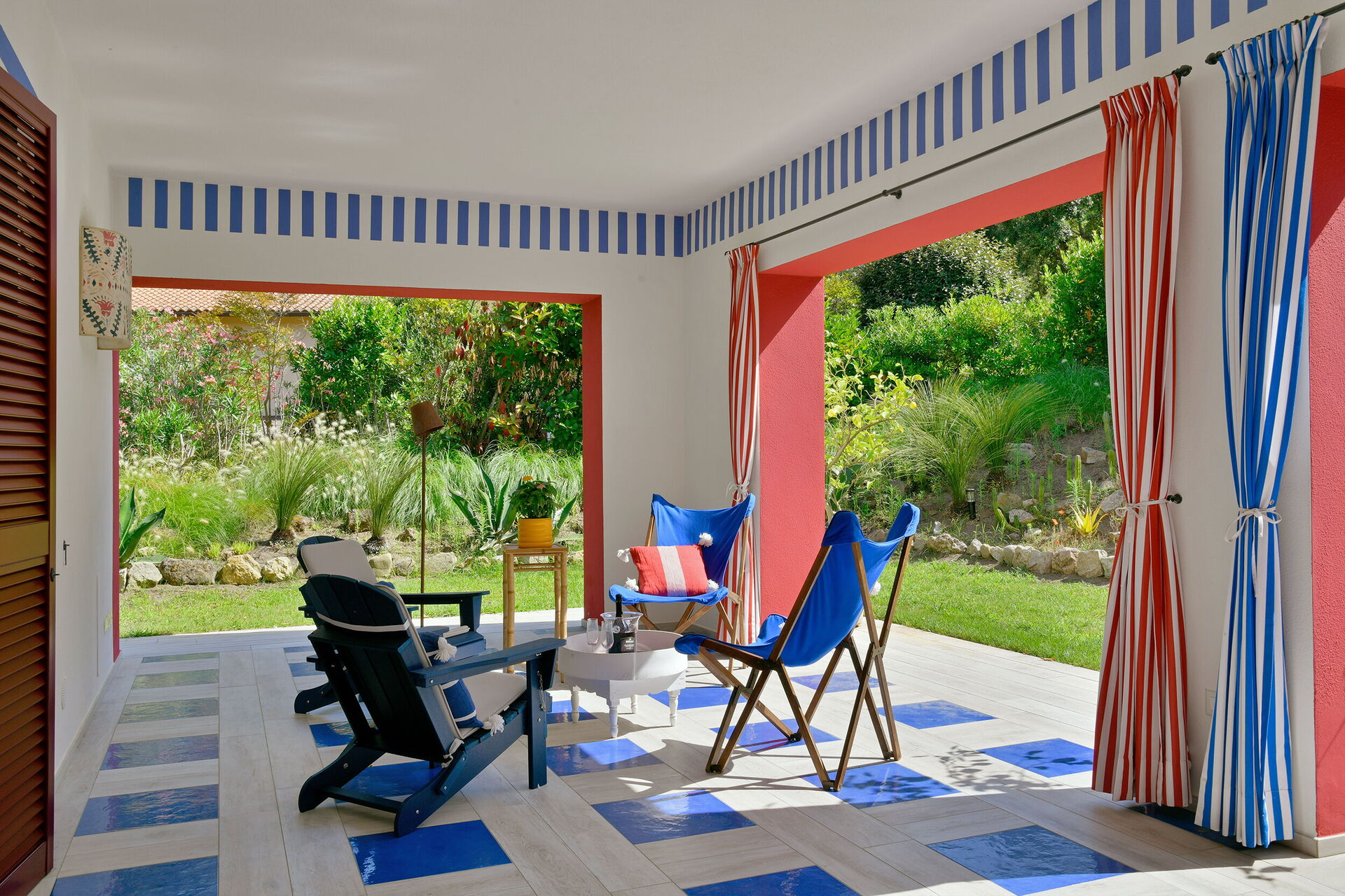 La proprietà - disposta su un unico piano e arredata in stile moderno nei colori rosso acceso, blu e bianco - può ospitare fino a 8 persone per un totale di 4 camere da letto e 4 bagni.