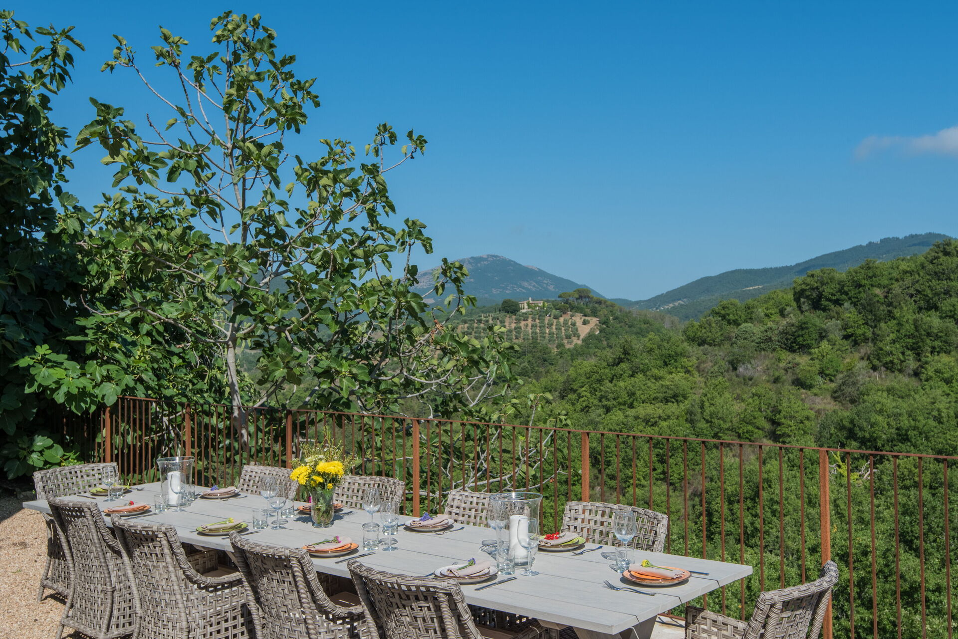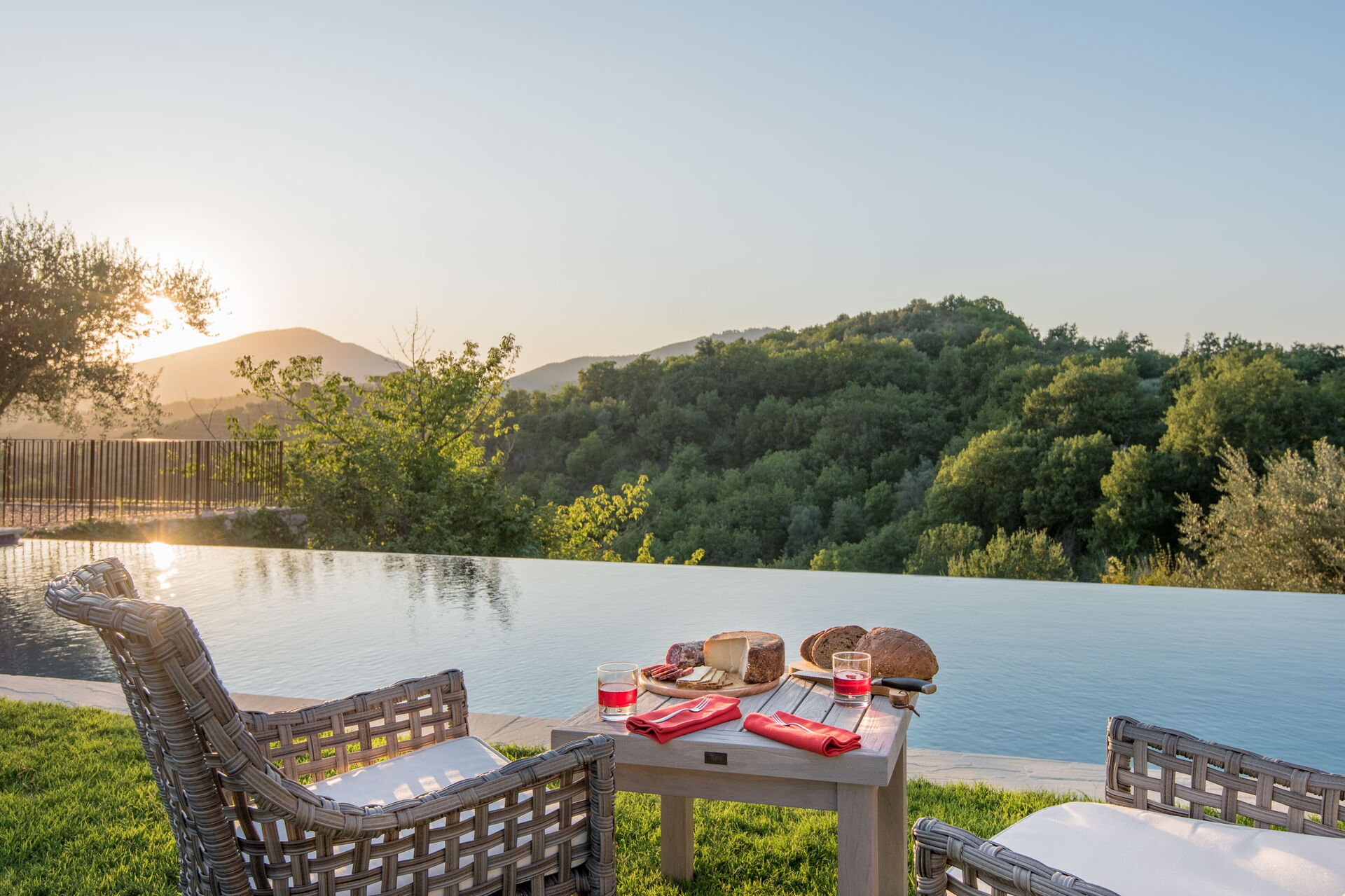 Sul lato sinistro della Villa si trova un giardino d'inverno, ombreggiato dal vento, dove è possibile fare colazione, pranzare e cenare in piena stagione. Appena sopra questo giardino d'inverno, accessibile dal retro della Villa e dalla terrazza principale anteriore, si trovano un roseto ombreggiato, diverse terrazze e il nostro orto, che produce verdure fresche pronte per essere servite dal nostro chef durante i pasti. L'area della piscina è accessibile anche dal lato sinistro della Villa. Si trova a circa 100 metri di distanza, garantendo la privacy sia della Villa che degli ospiti della piscina. La piscina a sfioro è lunga 18,8 metri e larga 4 metri, attrezzata con 20 lettini e 10 ombrelloni. Un'area lounge esterna è disponibile presso il bar/piscina, dove si trova anche uno spogliatoio.