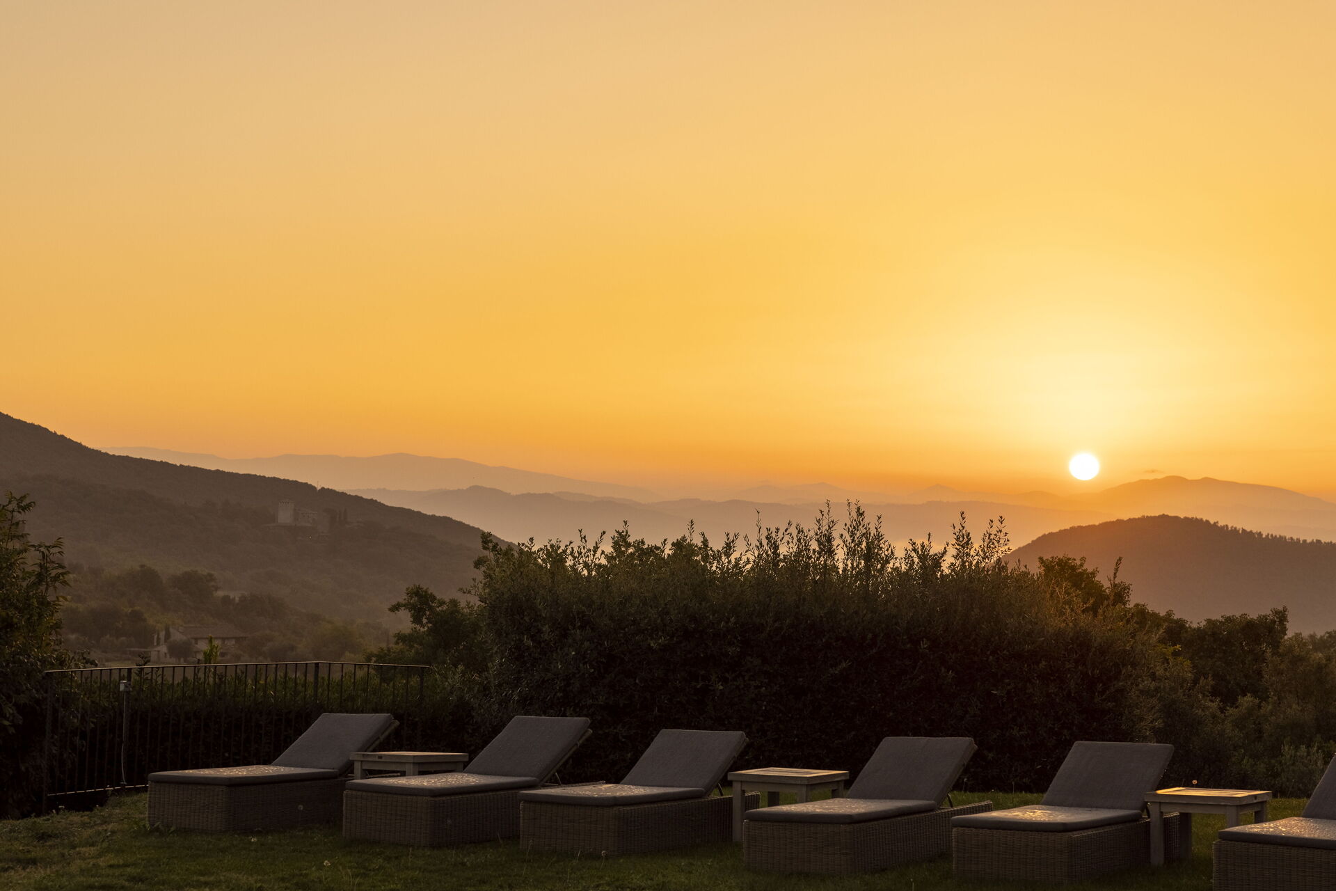Il giardino della Villa ha una superficie di circa 4,6 ettari e comprende la terrazza principale di fronte alla Villa, ombreggiata da pini maturi, palme e ulivi selvatici. All'ombra e nella brezza si può pranzare o cenare con tavoli di prima classe per un massimo di 29 persone, mentre sotto gli ulivi ci sono due salotti all'aperto collegati tra loro, ideali per rilassarsi durante il giorno e per gustare meravigliosi aperitivi al tramonto con vista sulle antiche colline umbre.