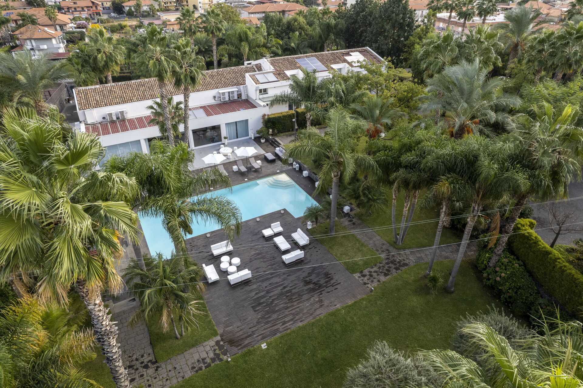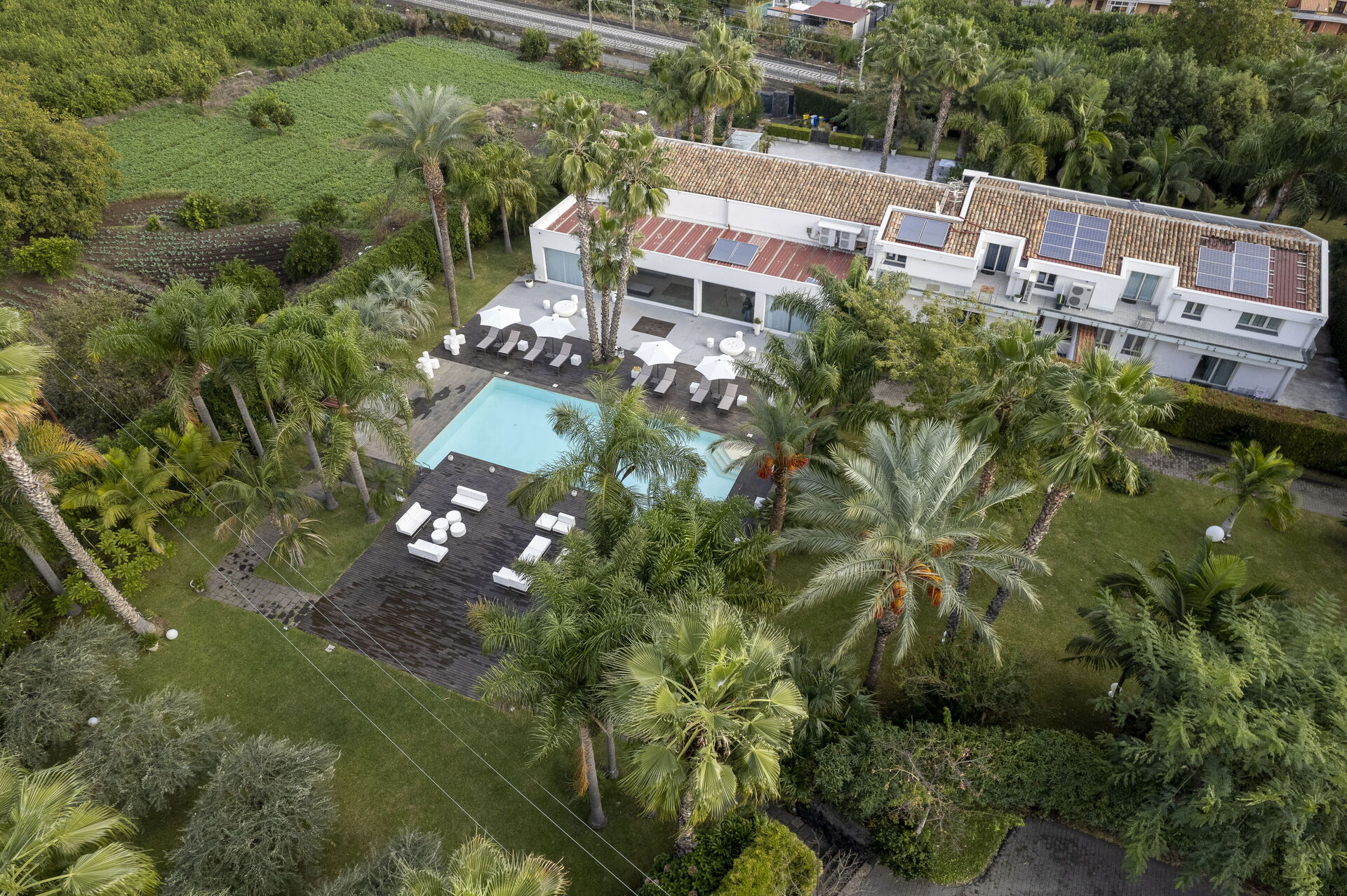 Mediterranean and exotic plants, this estate features a swimming pool and large green spaces, with a breathtaking view of Etna and the Gulf of Taormina - the solarium faces the eastern side of Etna, in fact, with a unique view. The estate is composed by four independent apartments, each with independent entrance and a large outdoor patio. The home design, approached with research in the historical context, results in a contemporary style with quality wooden and resin floors.