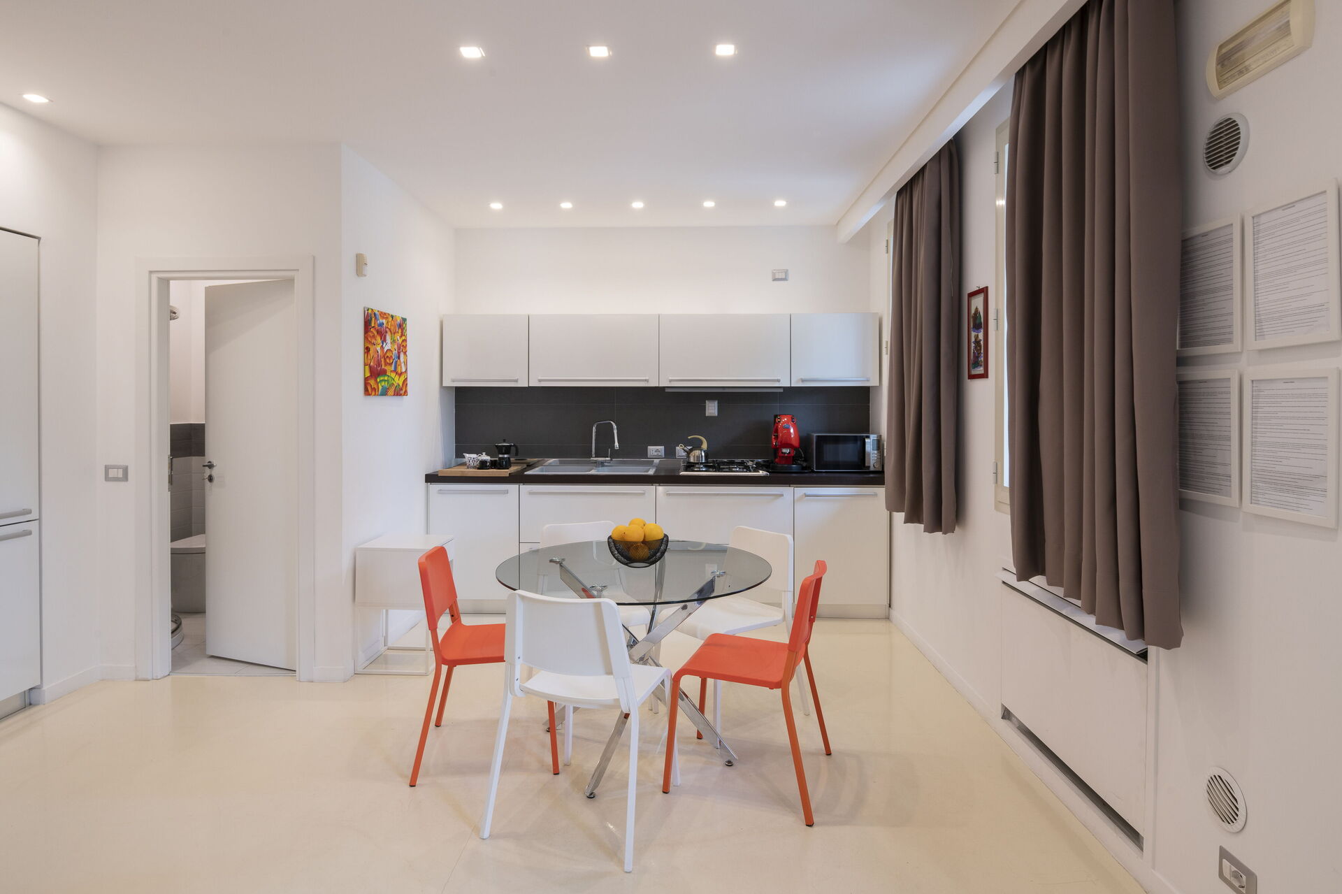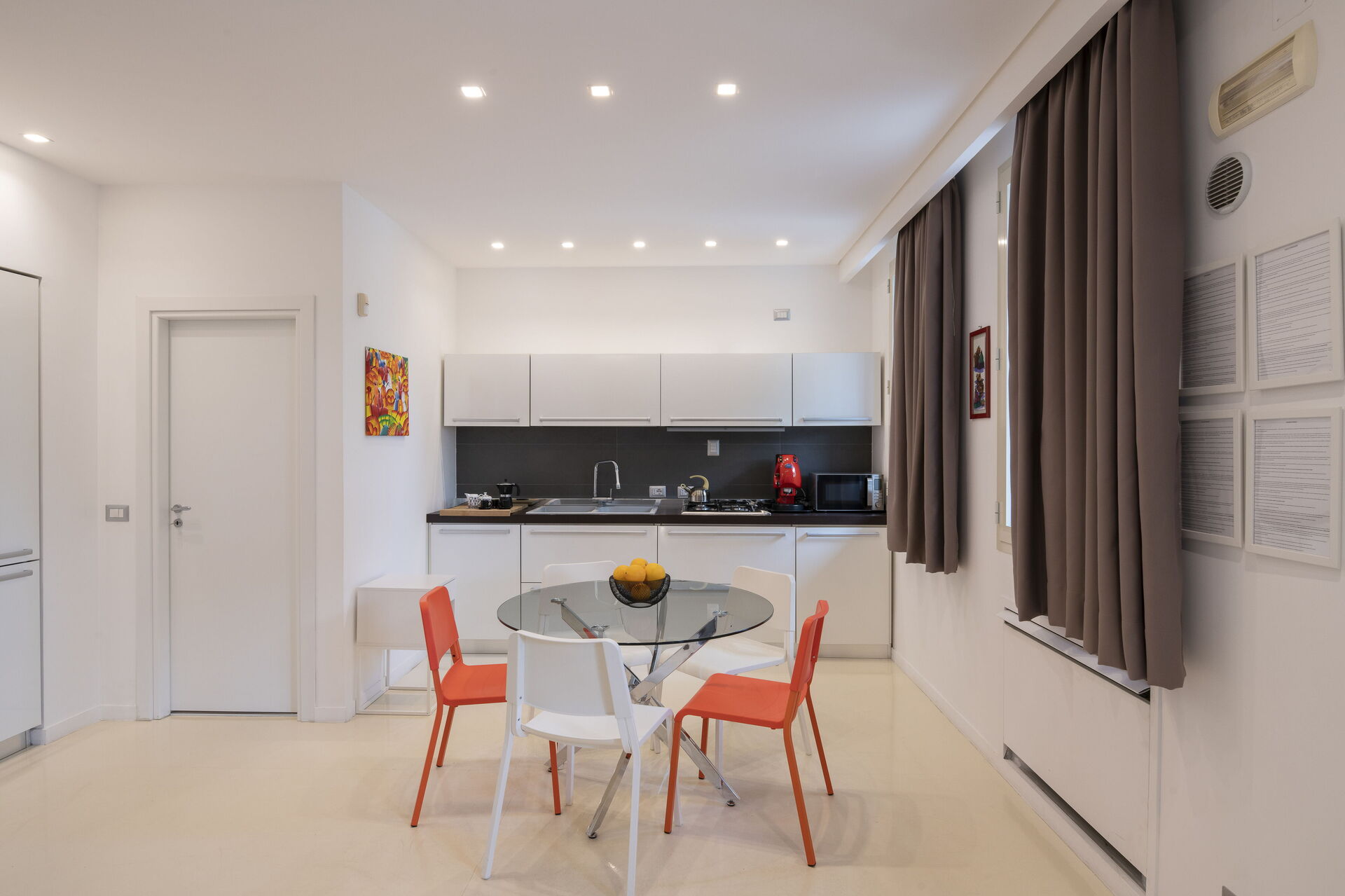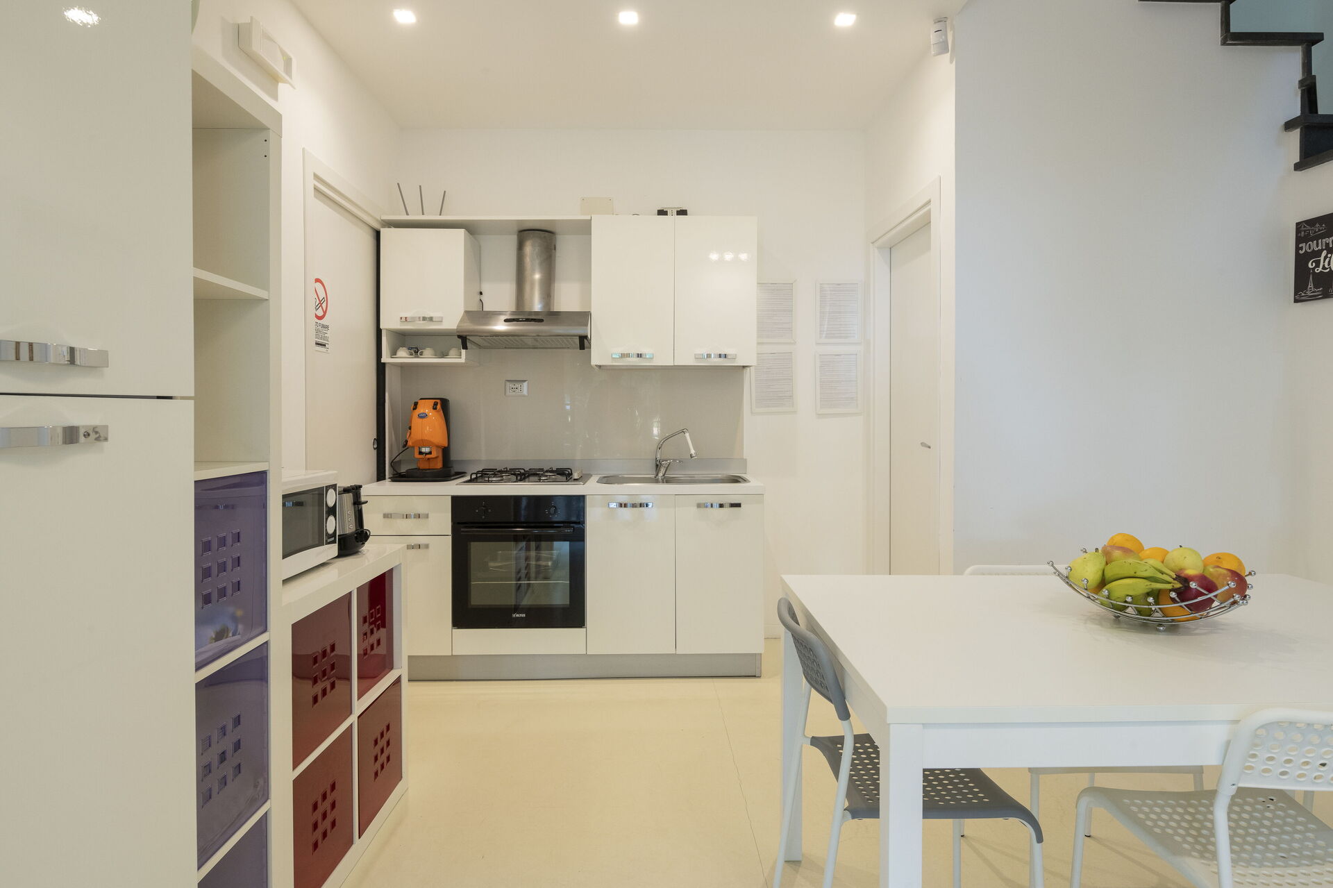 ‣ Each of the four kitchens features a four-gas burner, a fridge with an integrated freezer, a pods coffee machine, a microwave, an electric oven, a kettle, a toaster and in the Kitchen o
