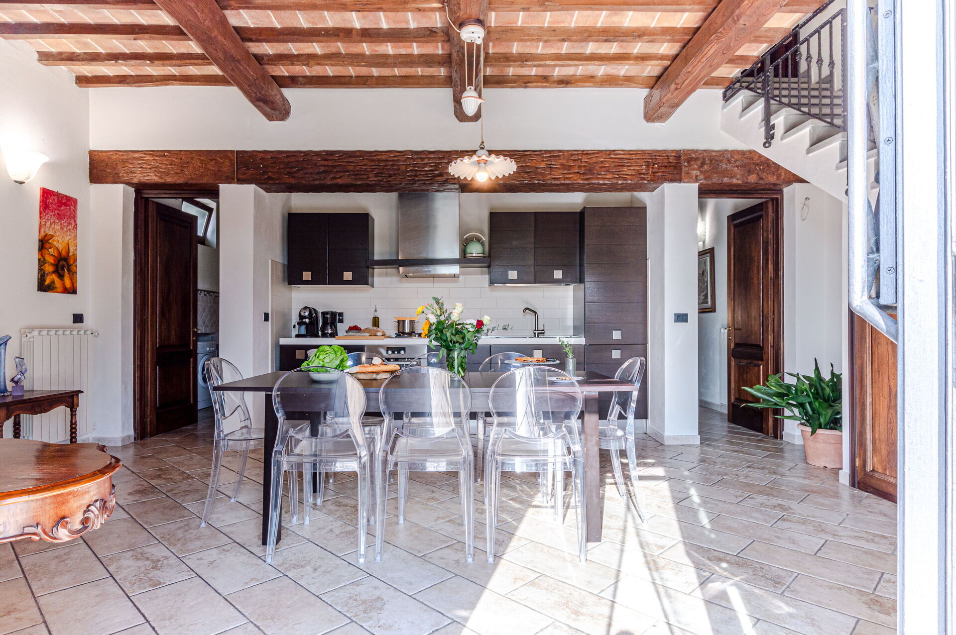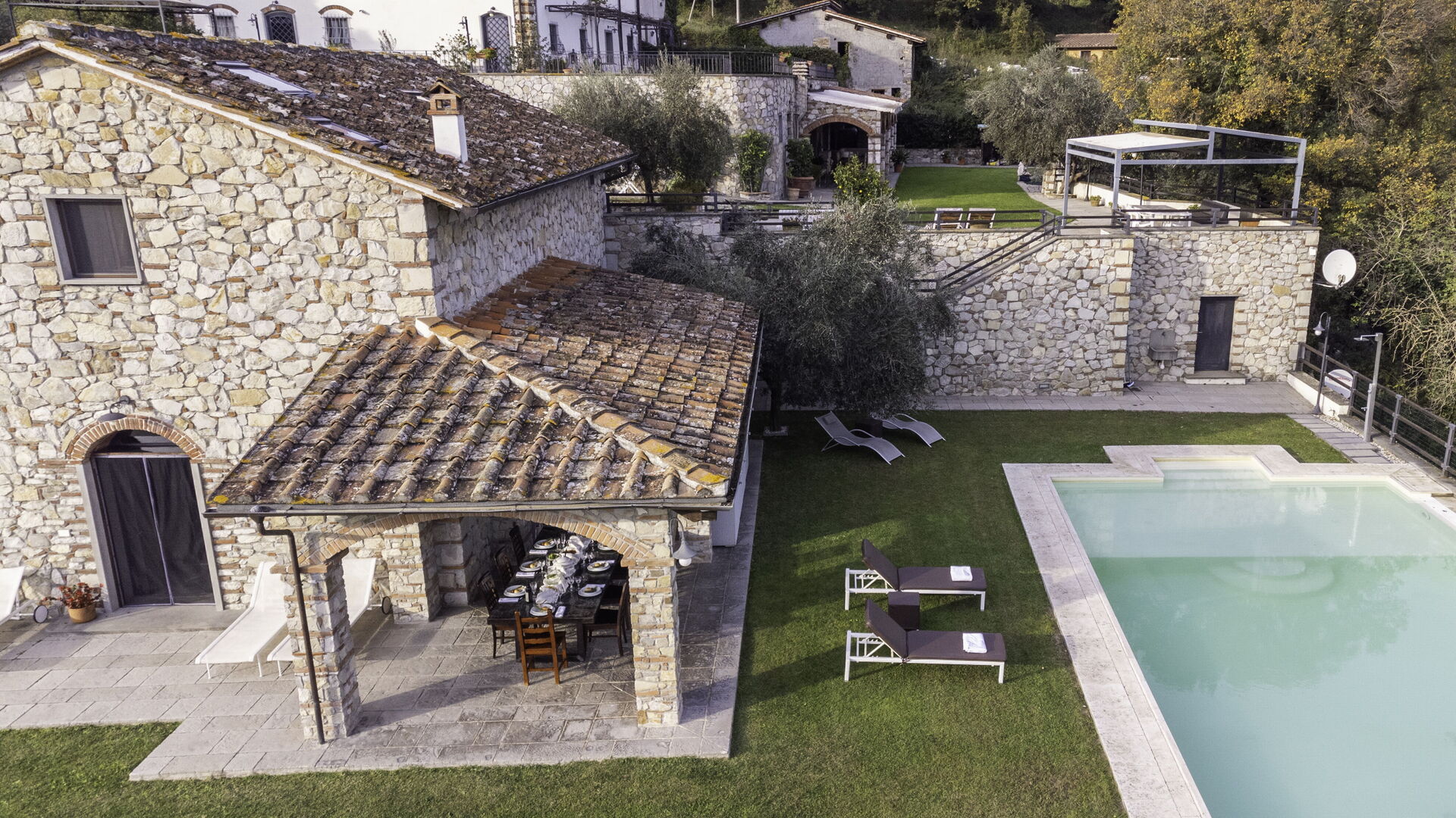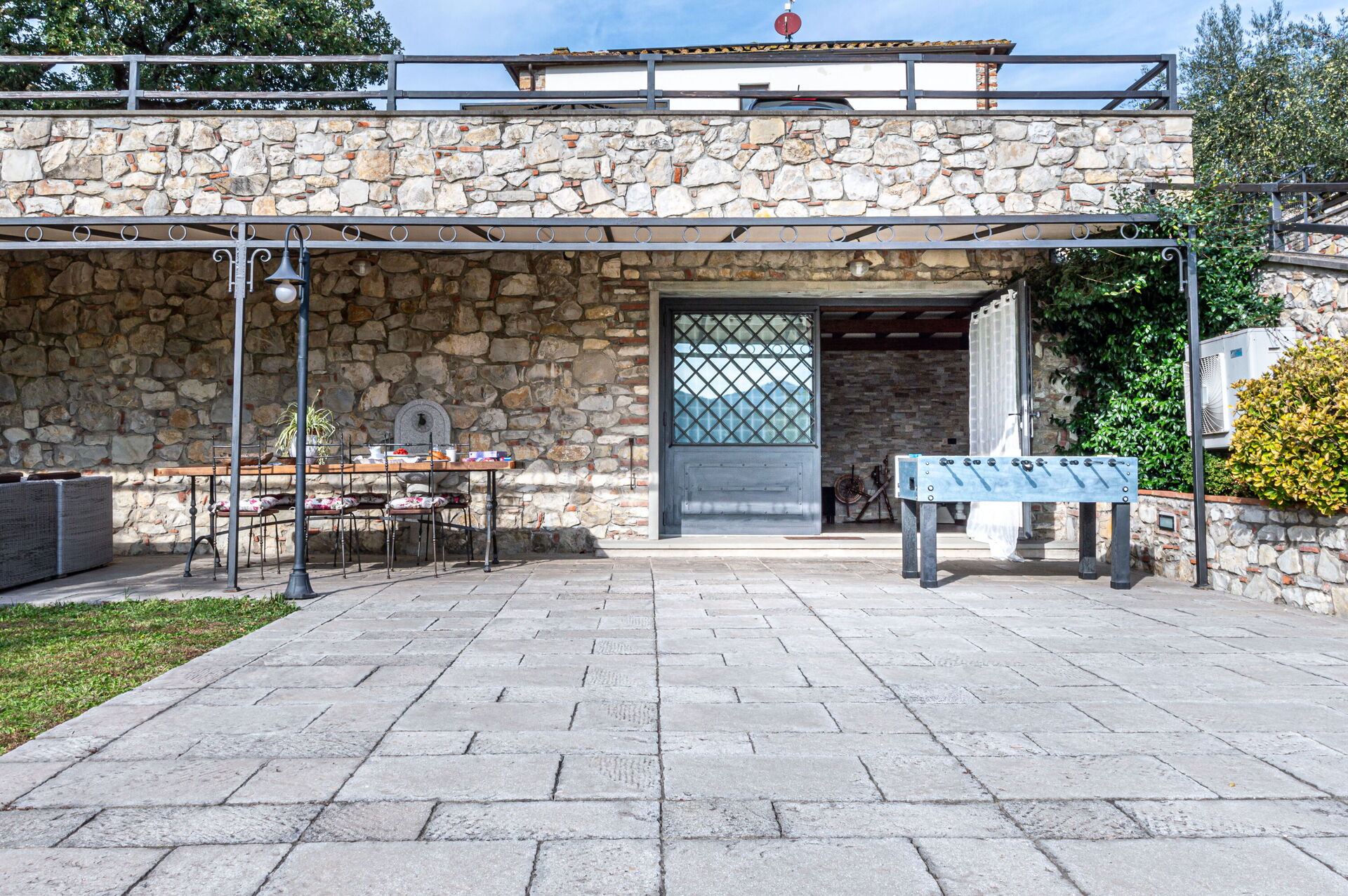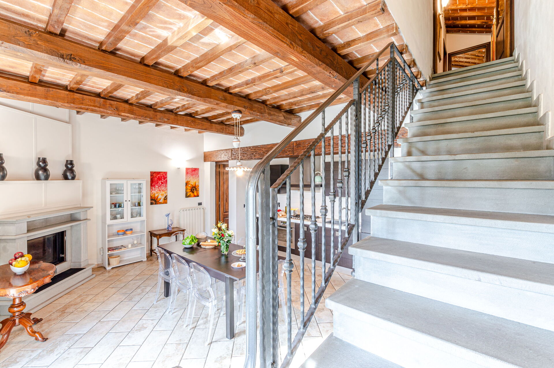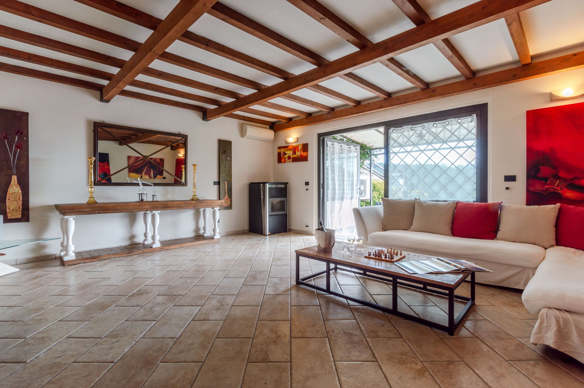 Villa Le Croci (220 m²) has been renovated, but many of the original decorations and materials have been retained, such as natural stone, beamed ceilings, and terracotta tiles.
