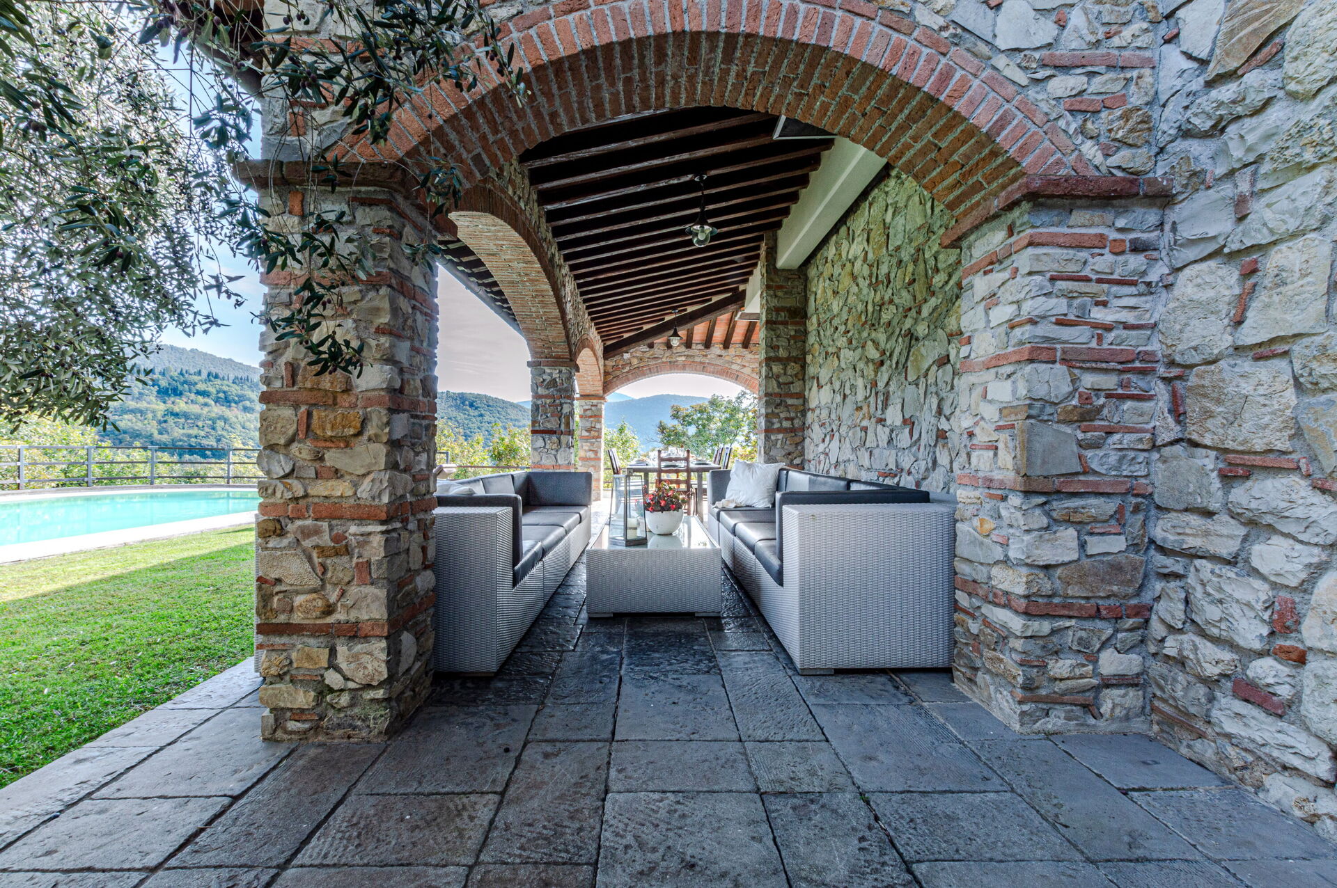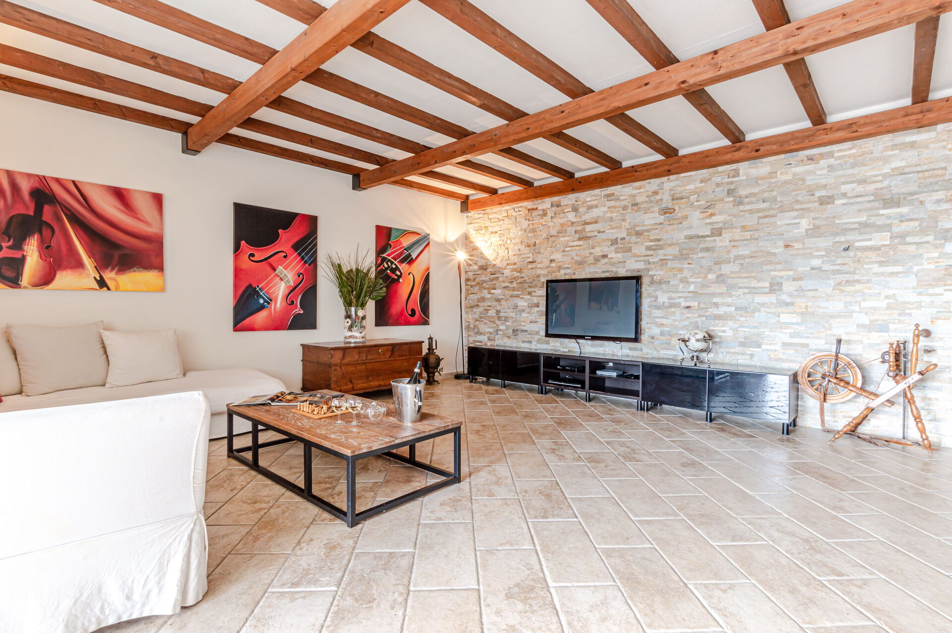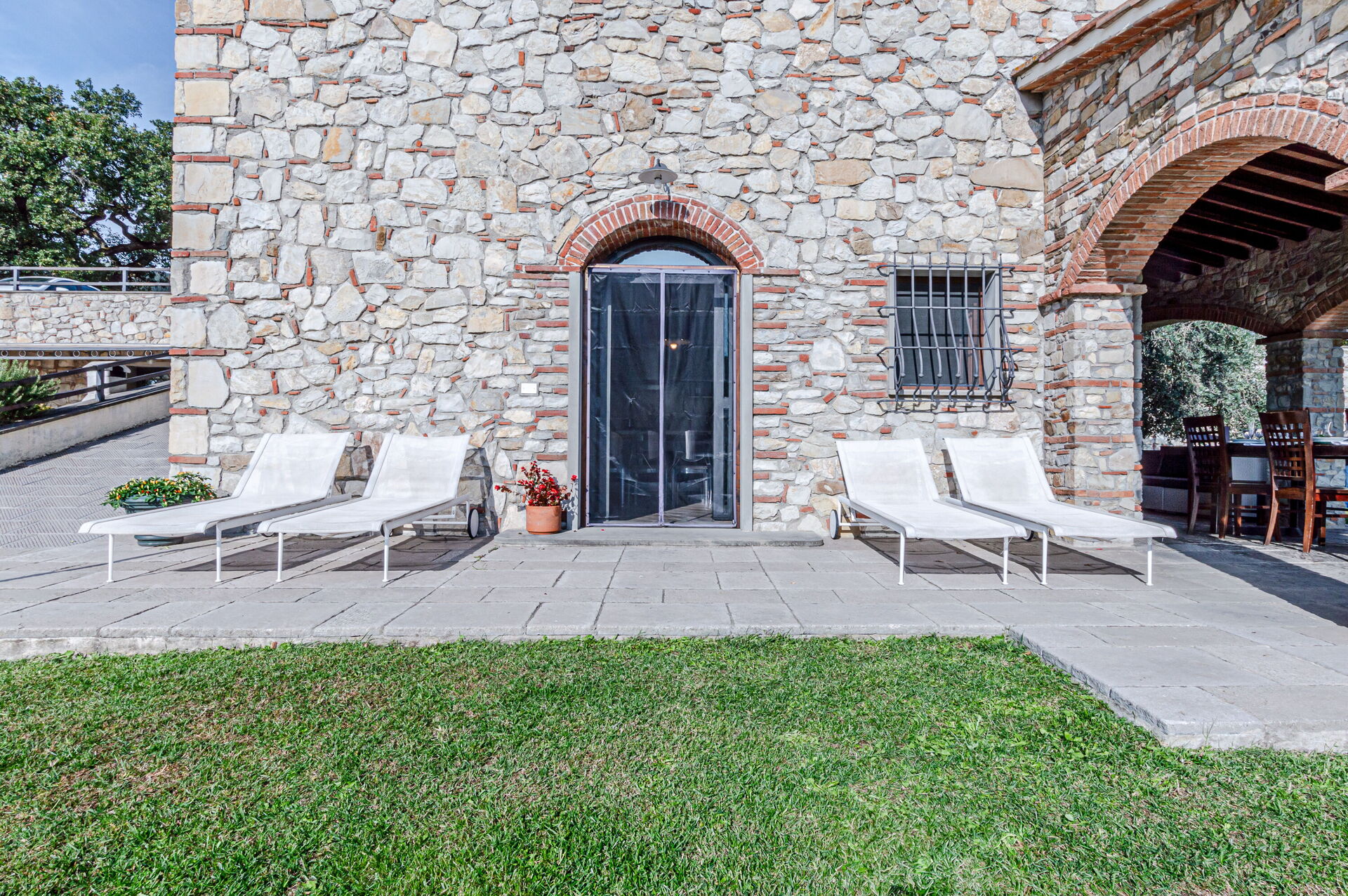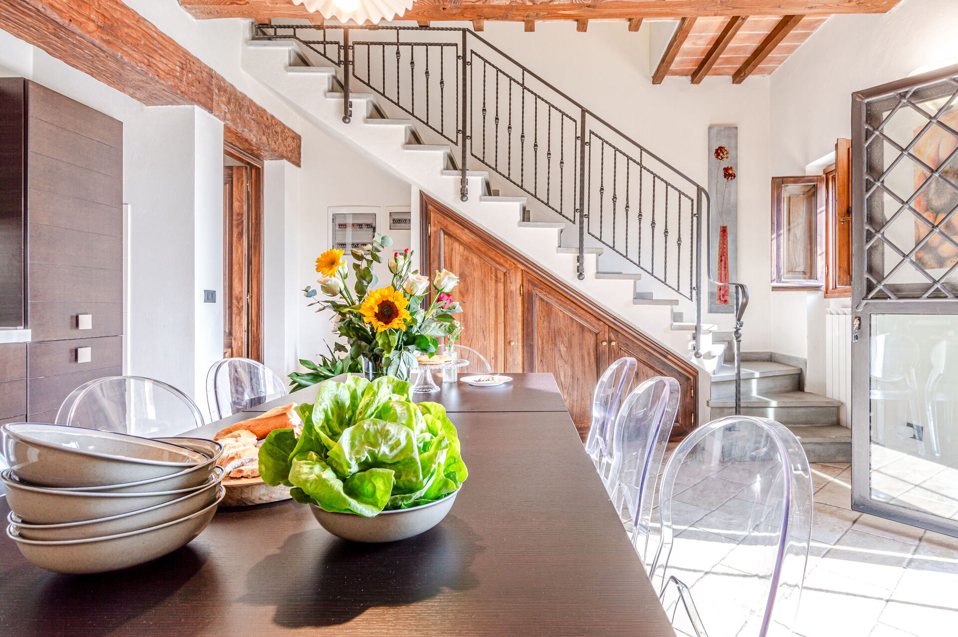 Villa Le Croci (220 m²) has been renovated, but many of the original decorations and materials have been retained, such as natural stone, beamed ceilings, and terracotta tiles.
