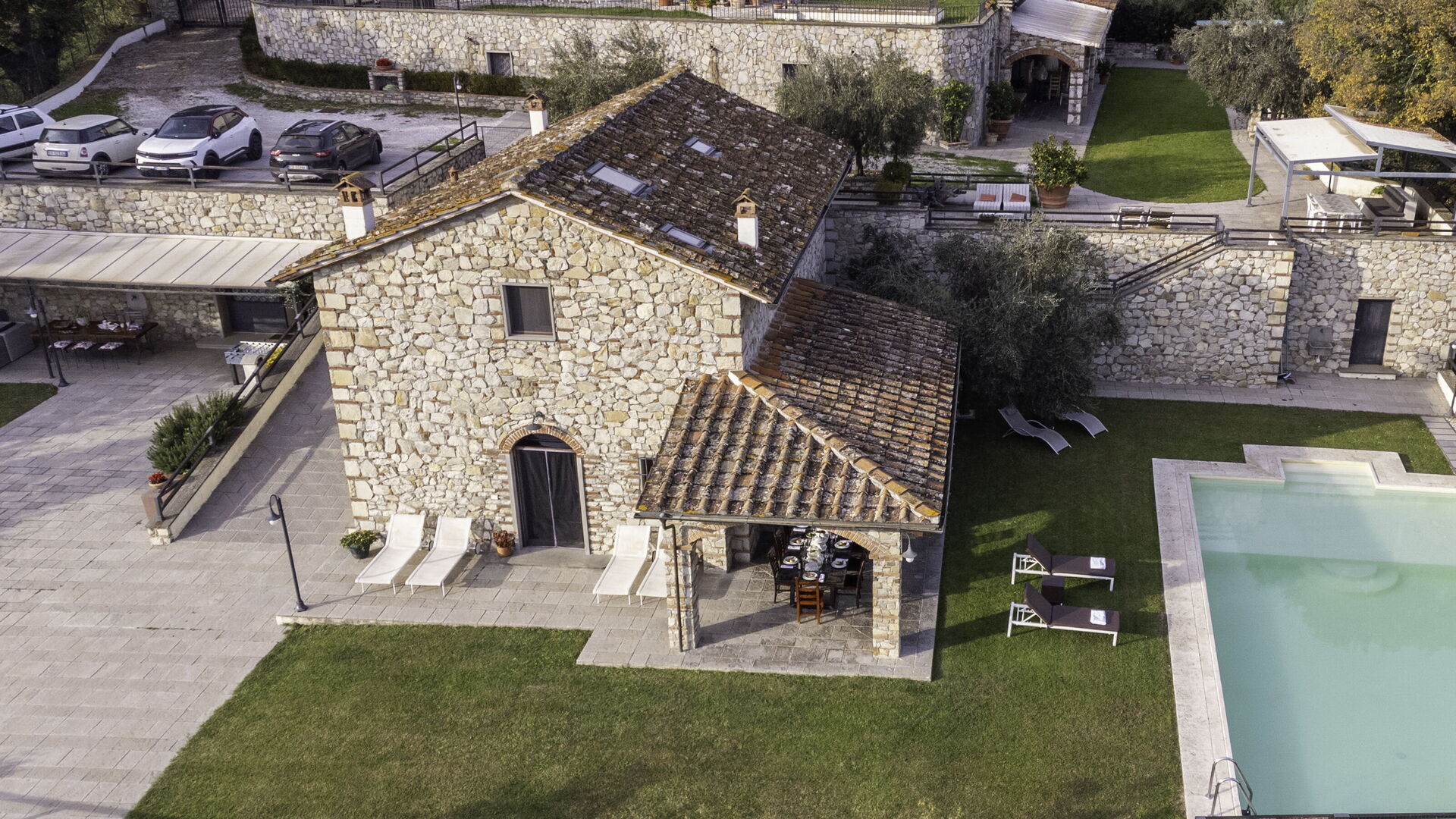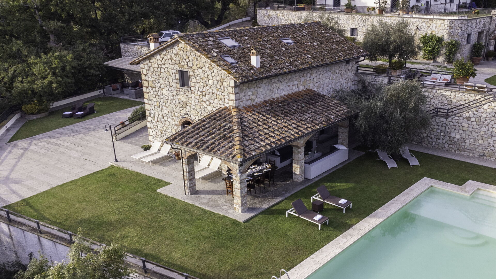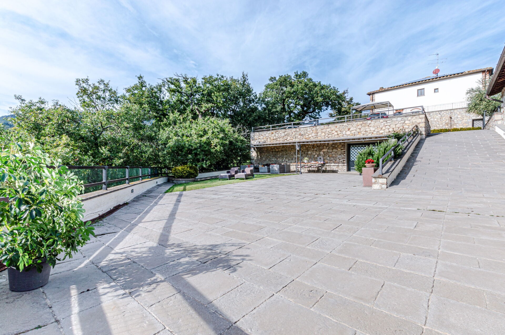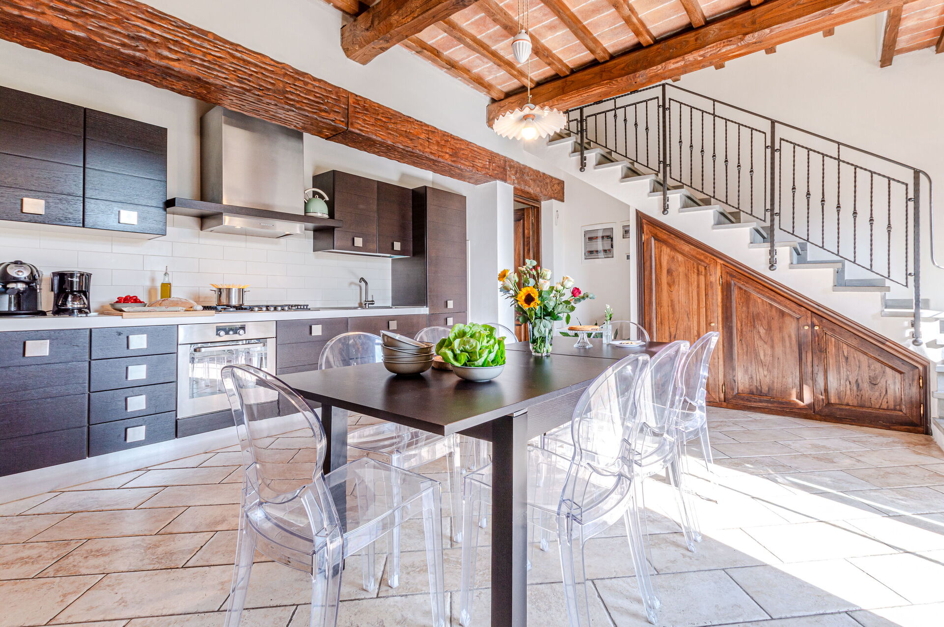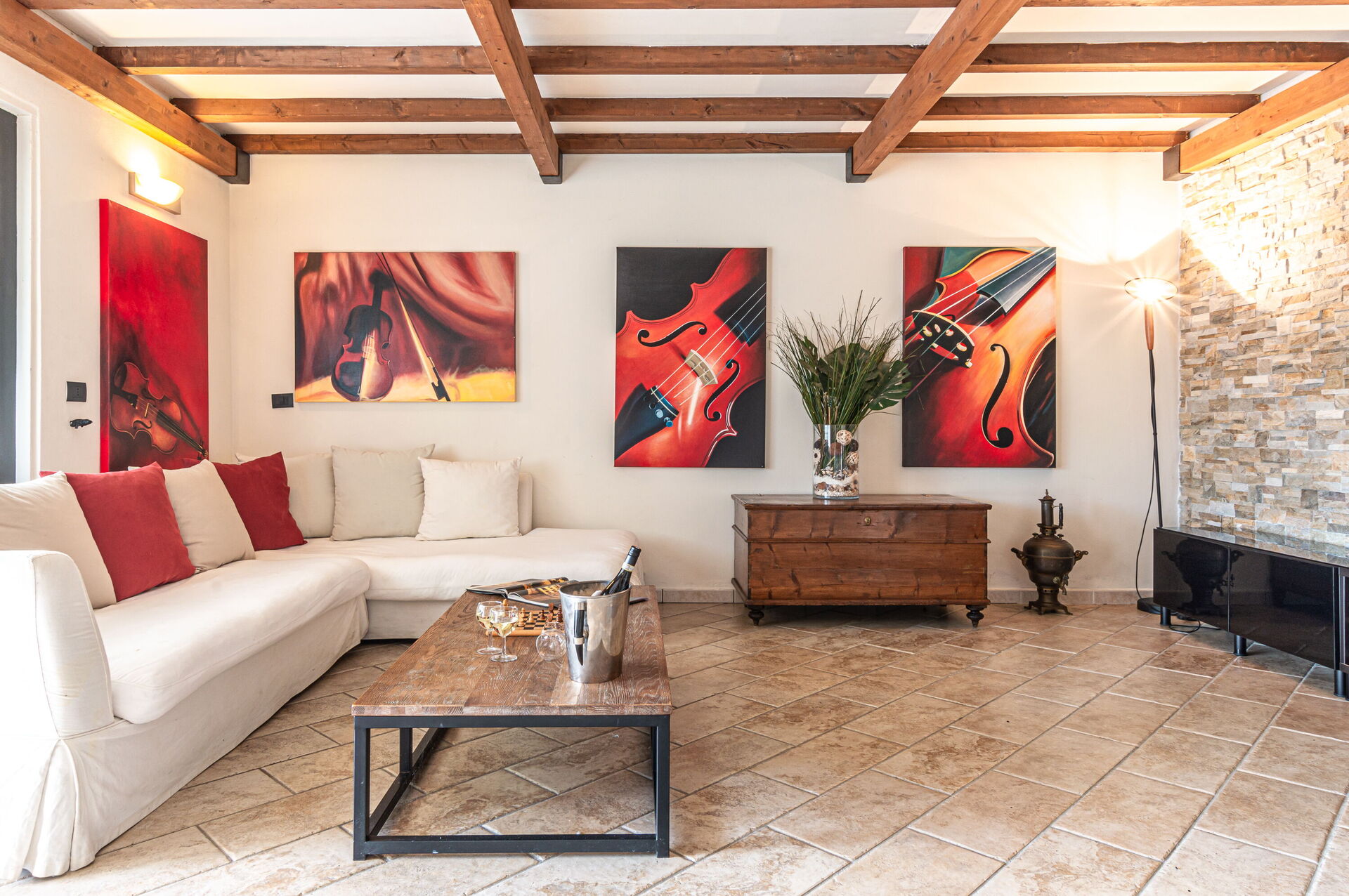 Villa Le Croci (220 m²) has been renovated, but many of the original decorations and materials have been retained, such as natural stone, beamed ceilings, and terracotta tiles.