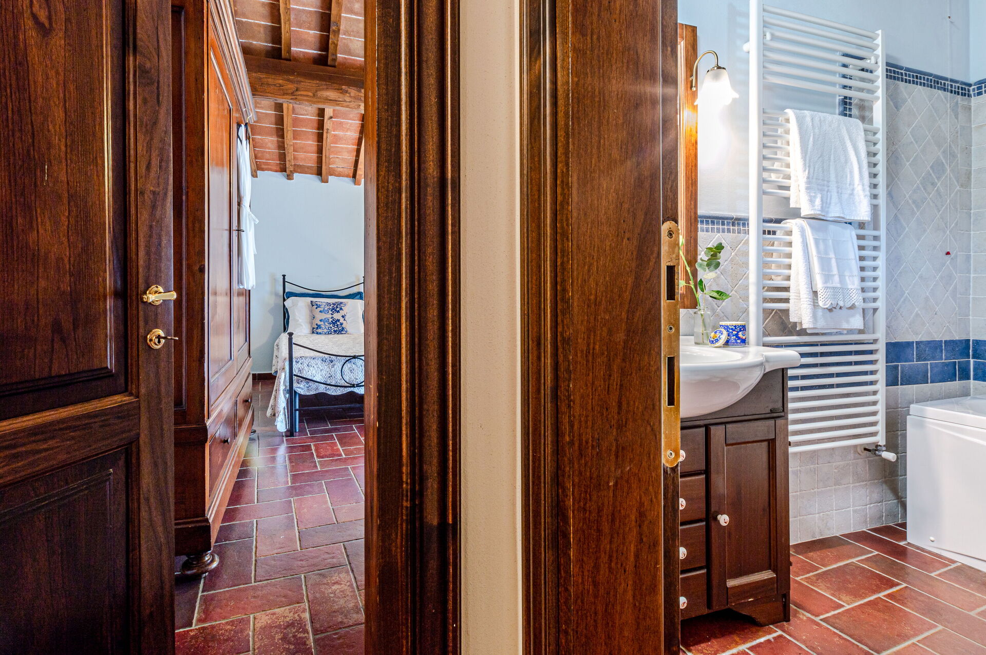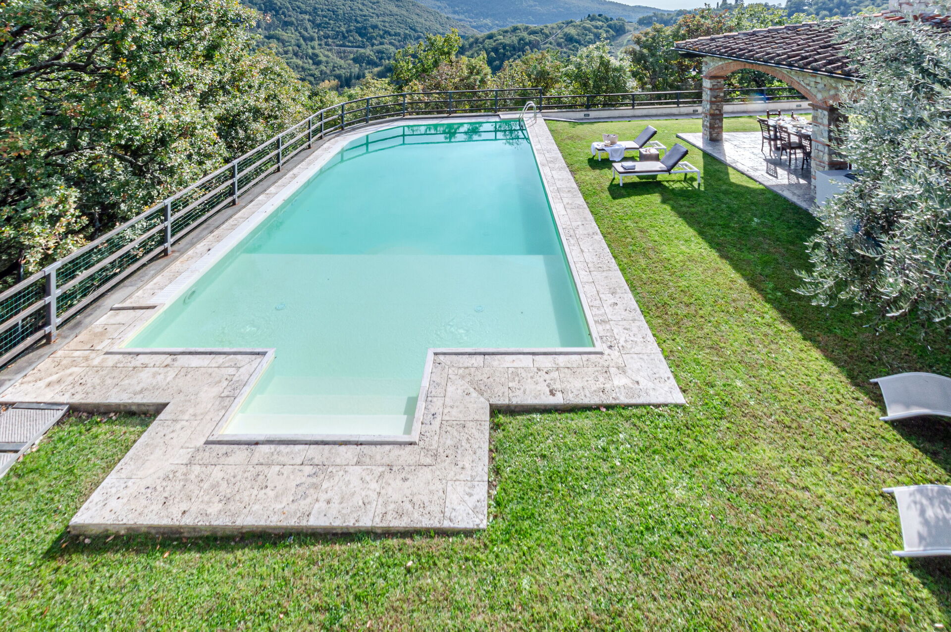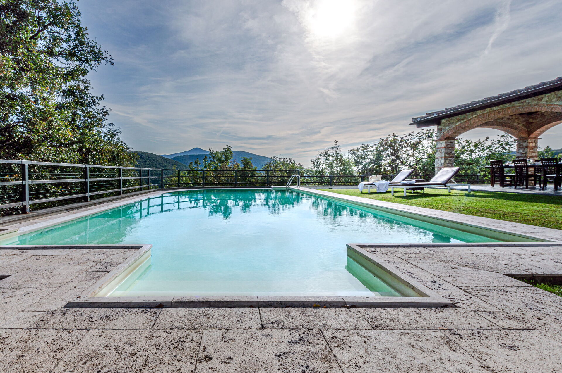 Under the reassuring shade of the portico, an elegant table for eight is ready to host breakfasts and lunches during the hot Tuscan days. Last but not least, the swimming pool (14 x 7m) is an oasis of coolness, crowned with sun loungers and sofas.