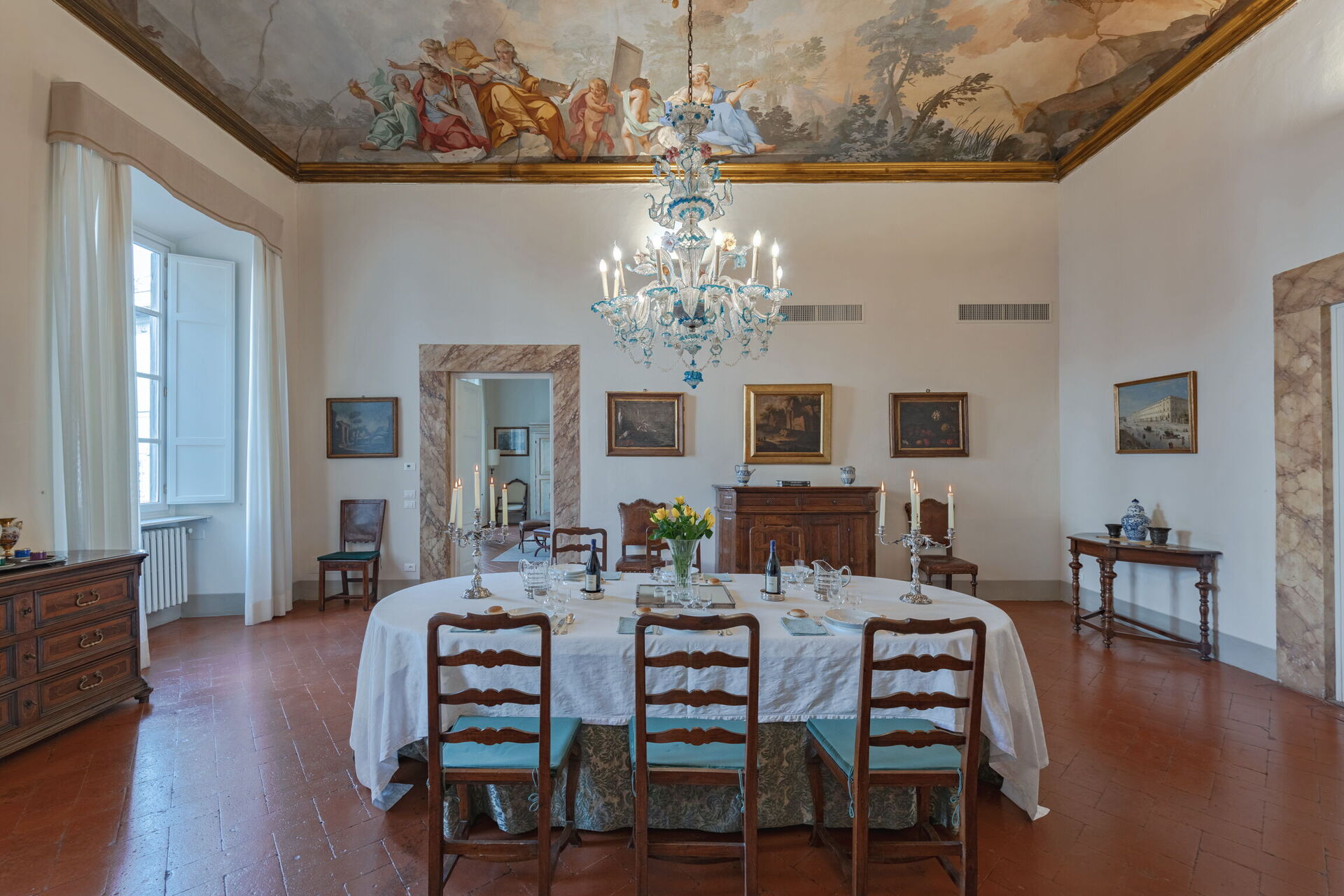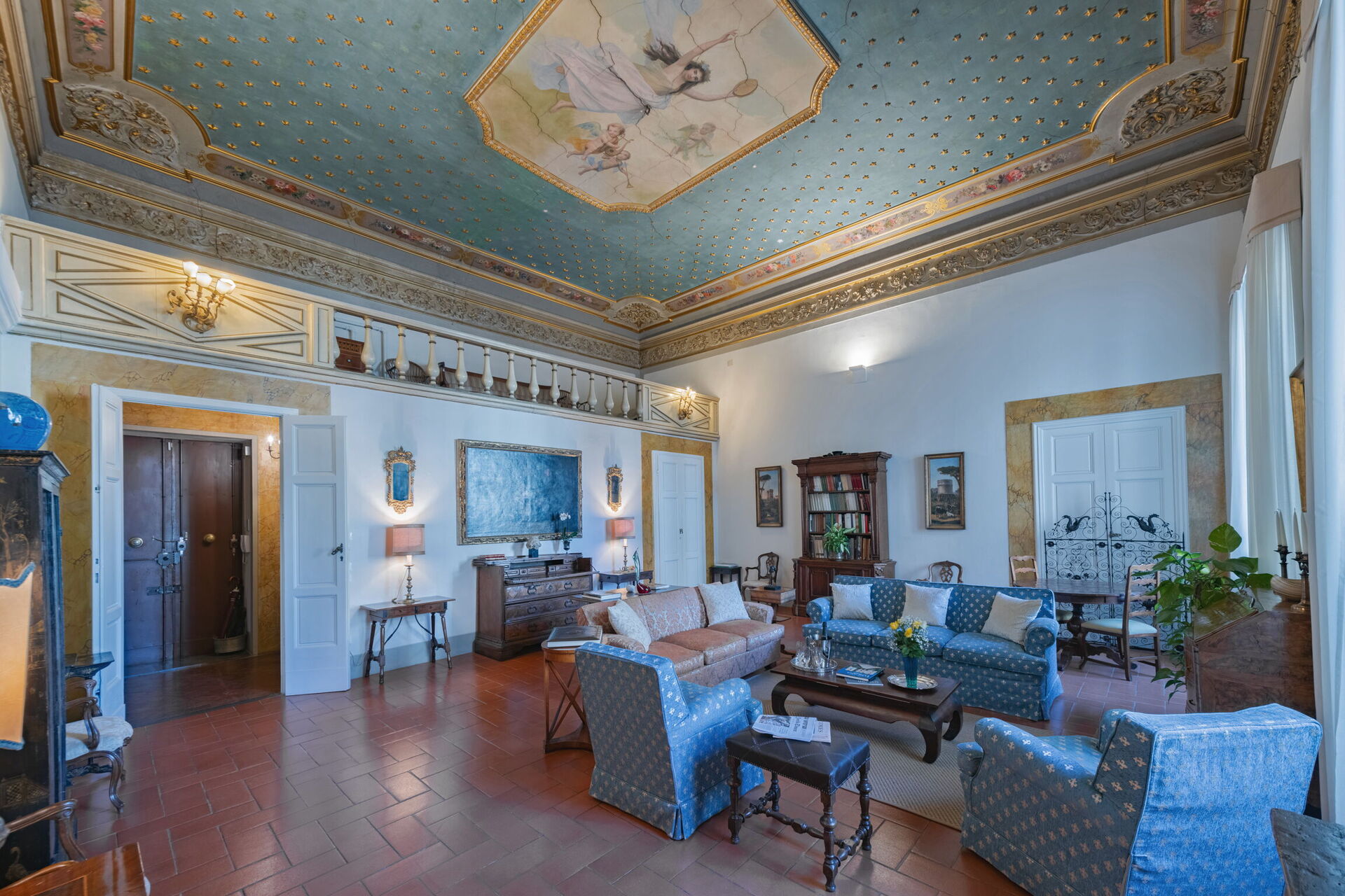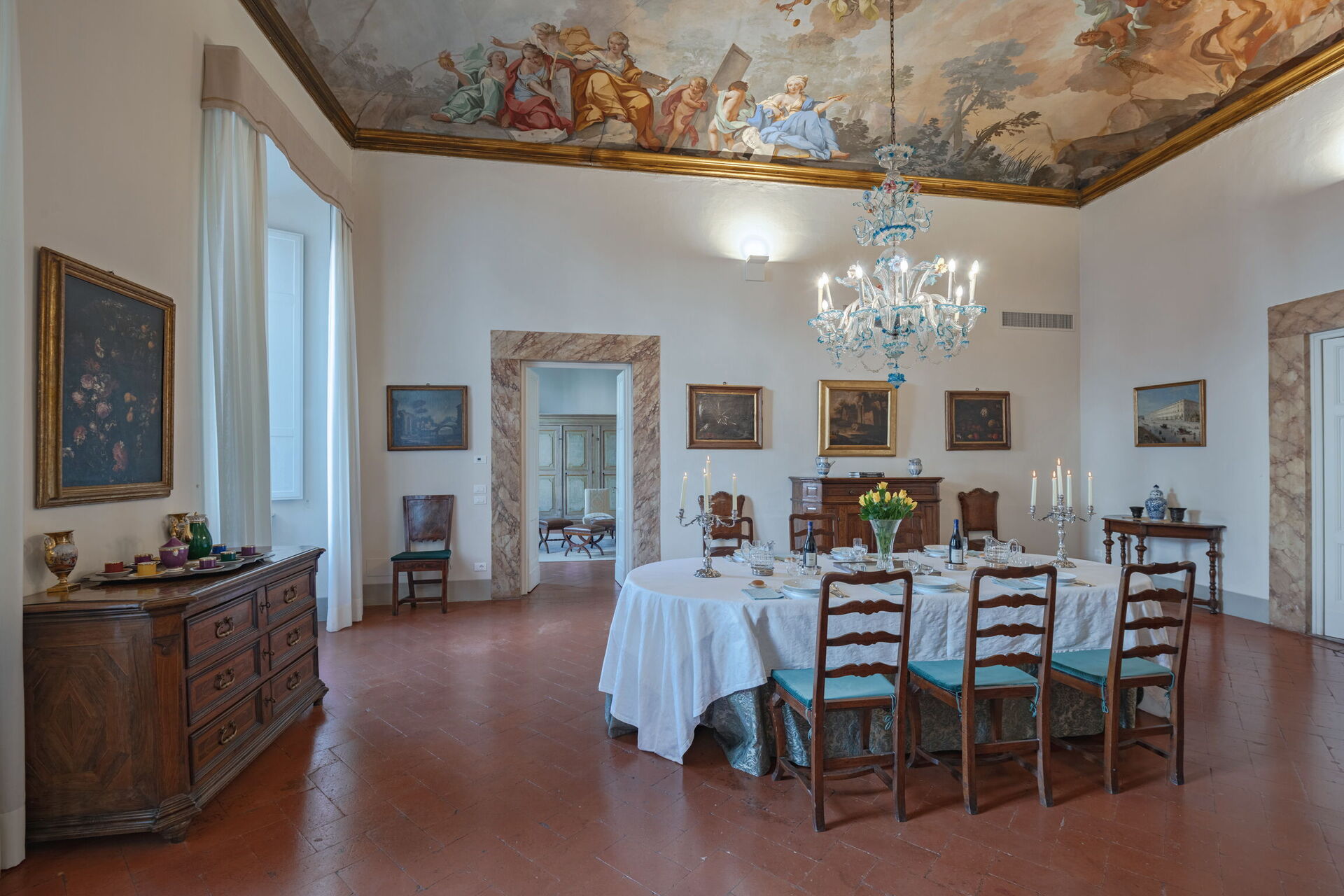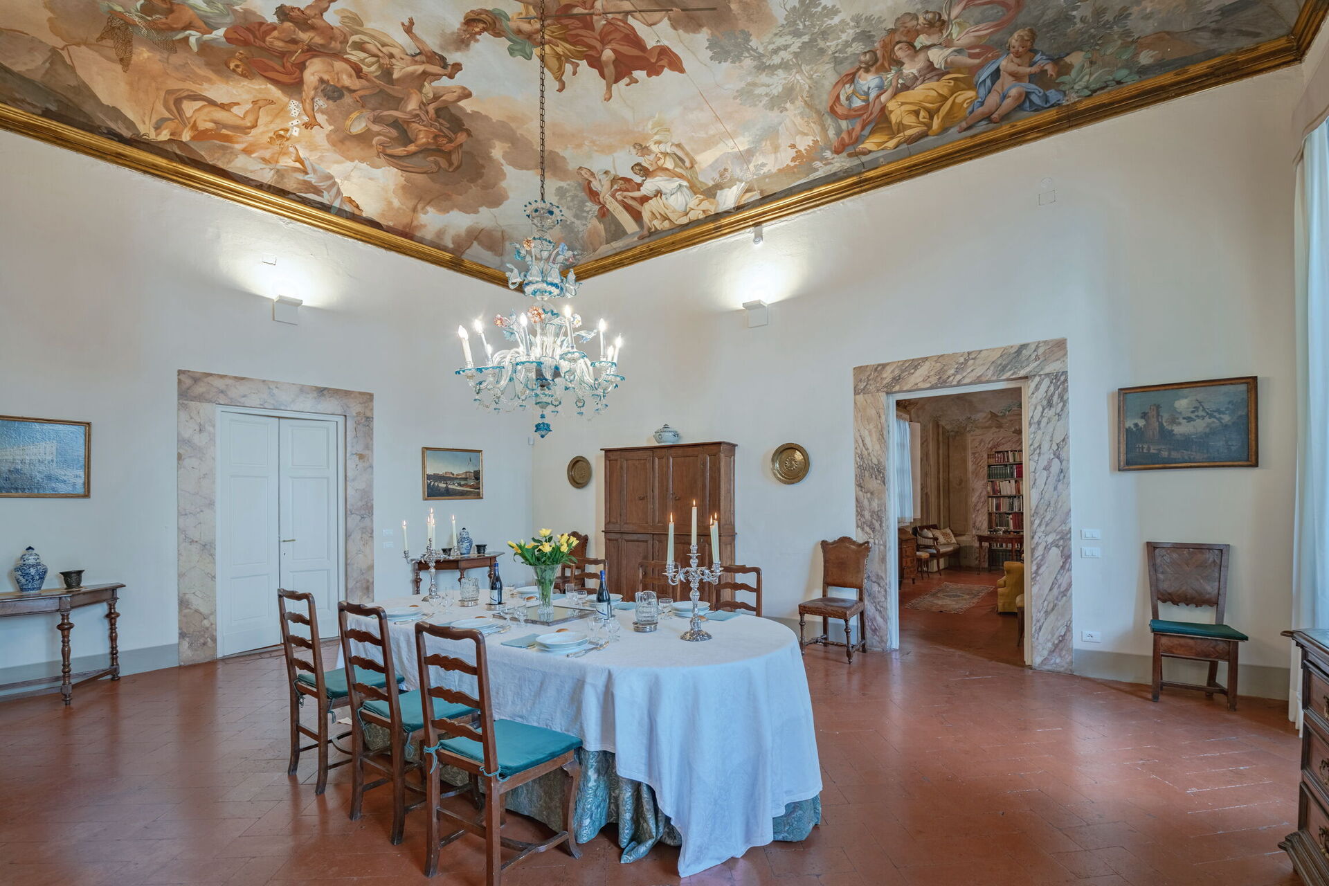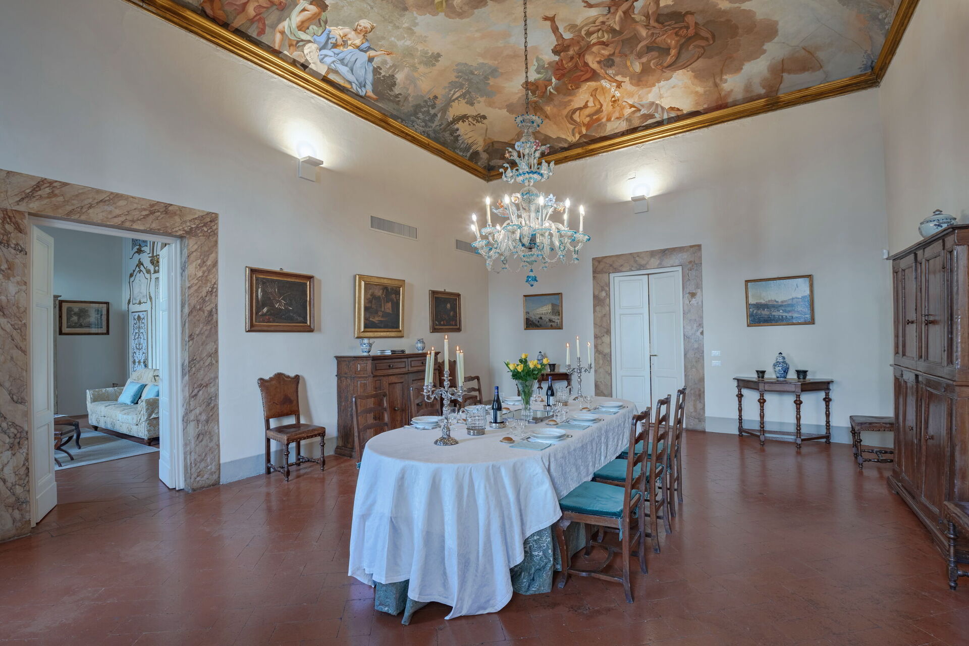 the Medici Chapels, this noble family belongs to a prominent Florentine family. From the front doors guests enter a hallway decorated in the nineteenth century: worthy of note the wrought iron gates and, facing the stairway, a doorway engraved with the coat arms of the family. On the first floor (the piano nobile) decorated with precious wall paintings, the private home is today one of the largest apartments in Florence for hire, and it's perfect for families and for those with a taste for Art and a central location.