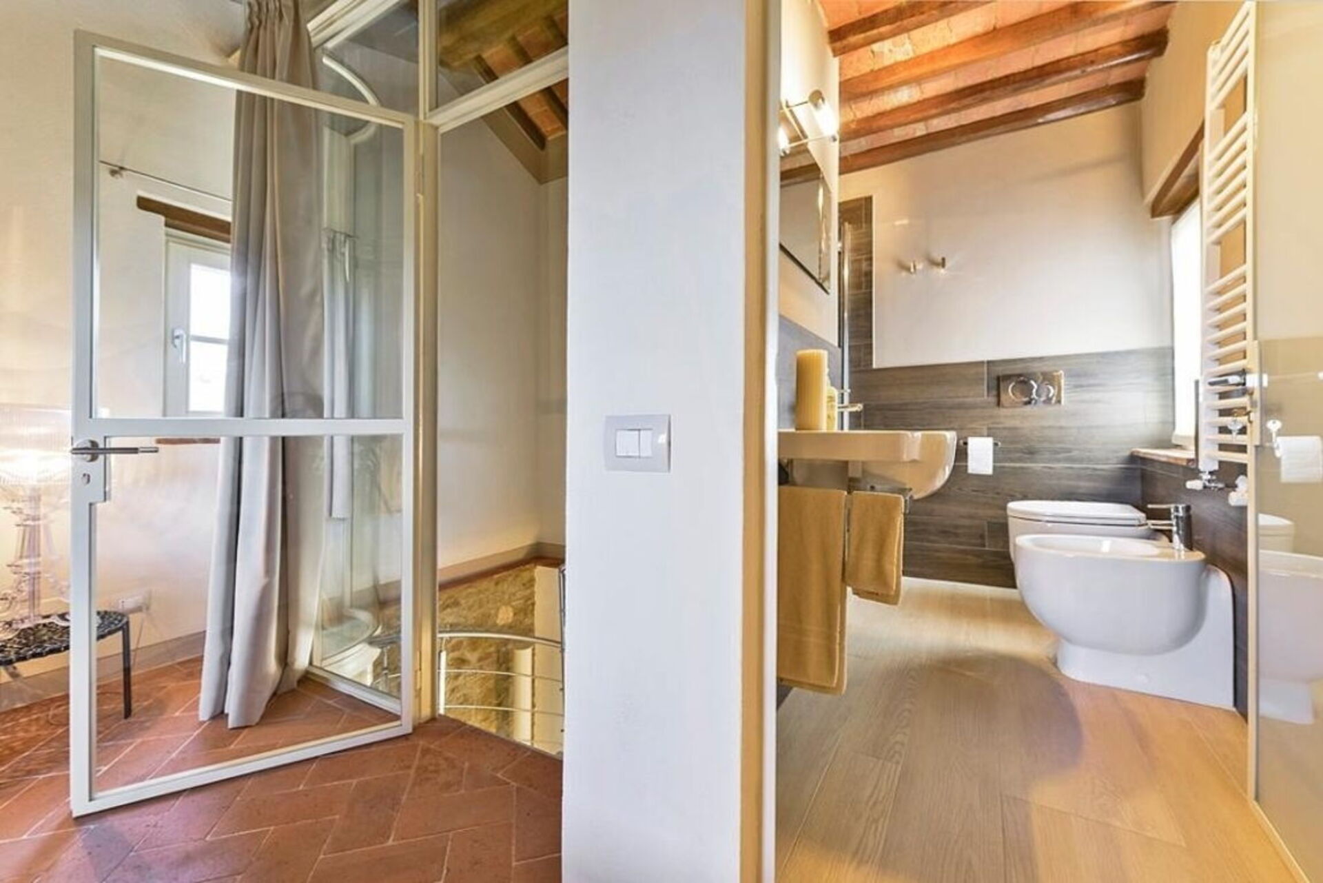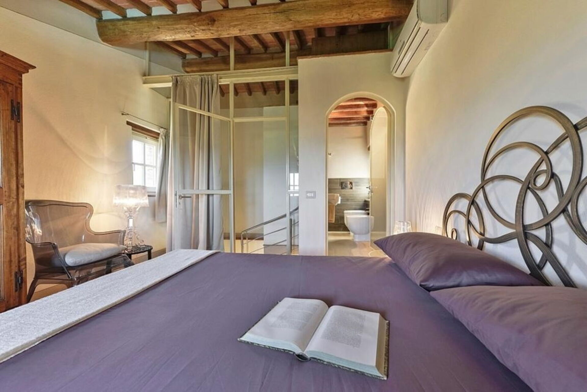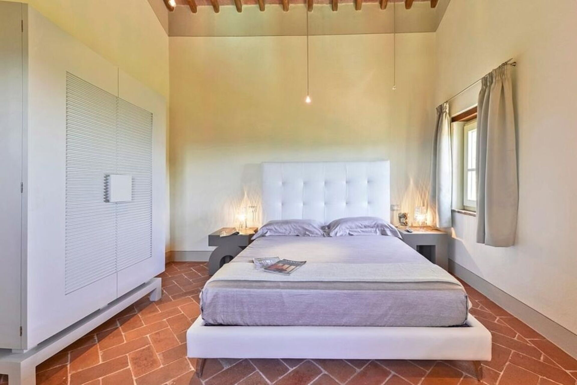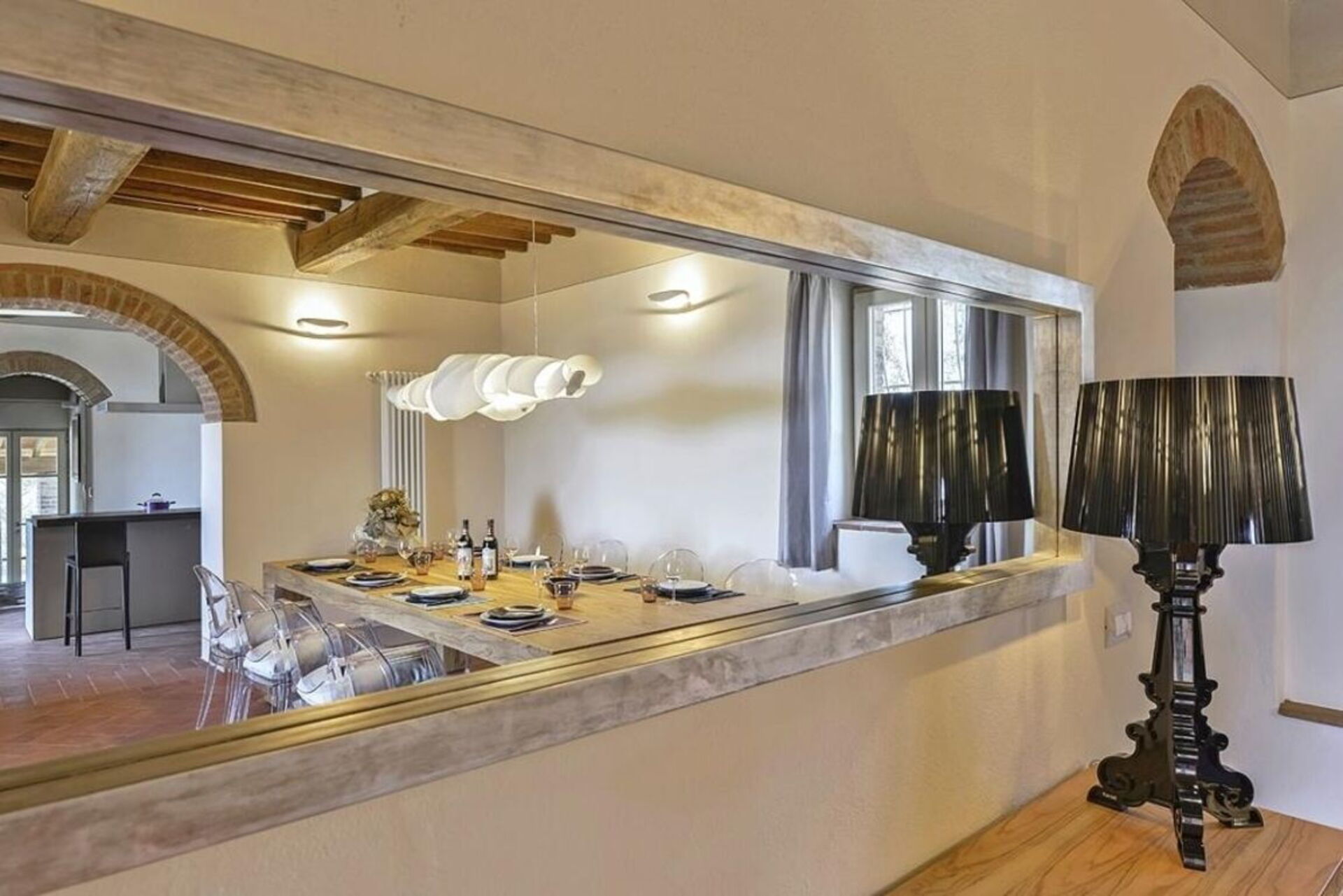 The villa, a masterfully restored work of art, welcomes you on two floors, culminating in a turret overlooking the hilly Tuscan landscape, seemingly painted by a divine brush.