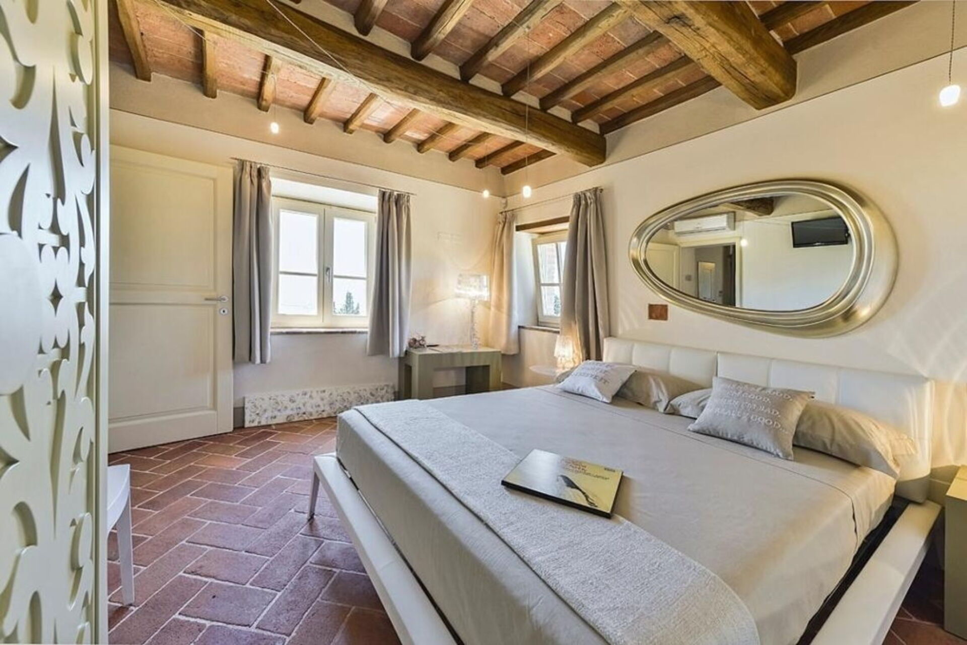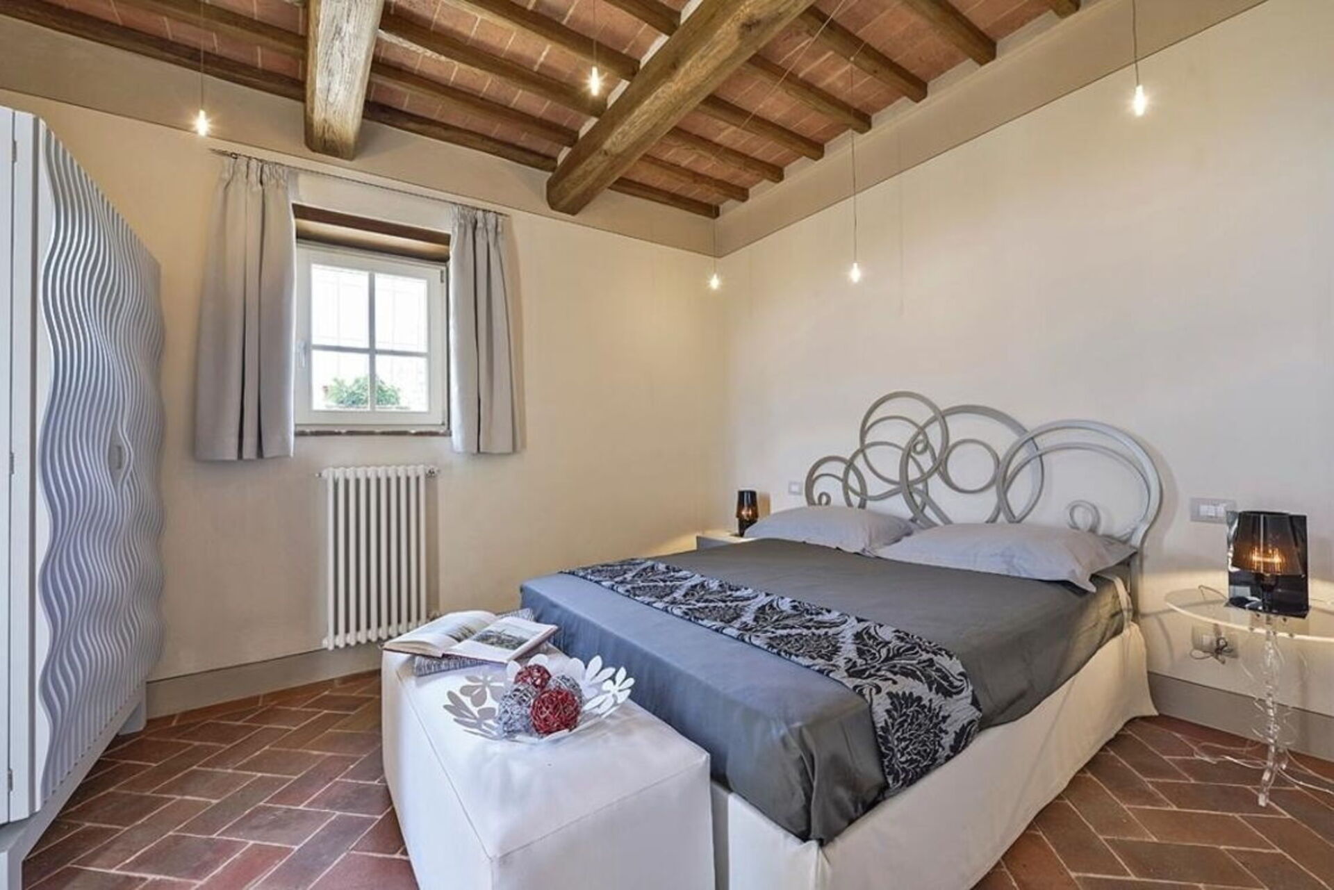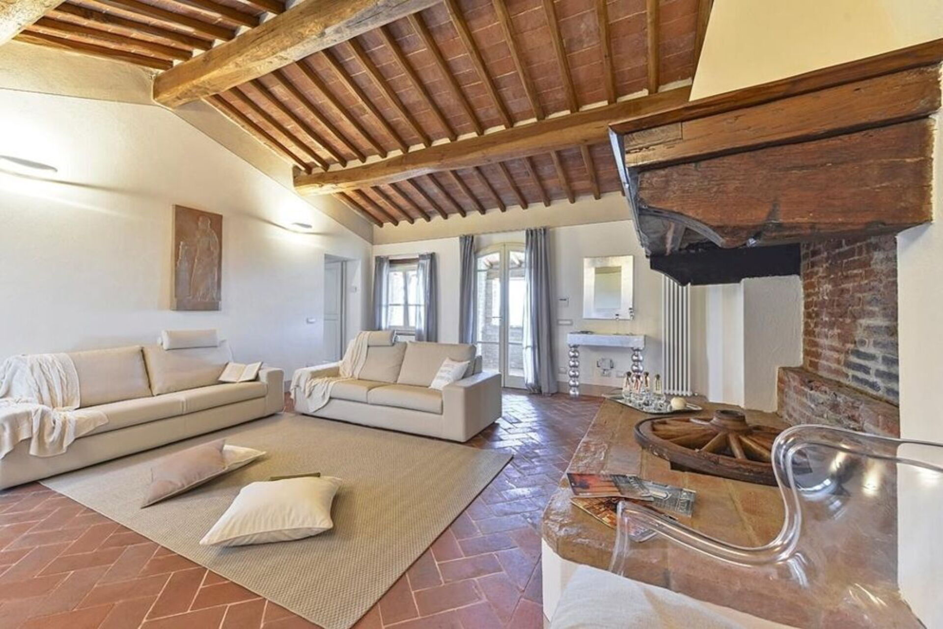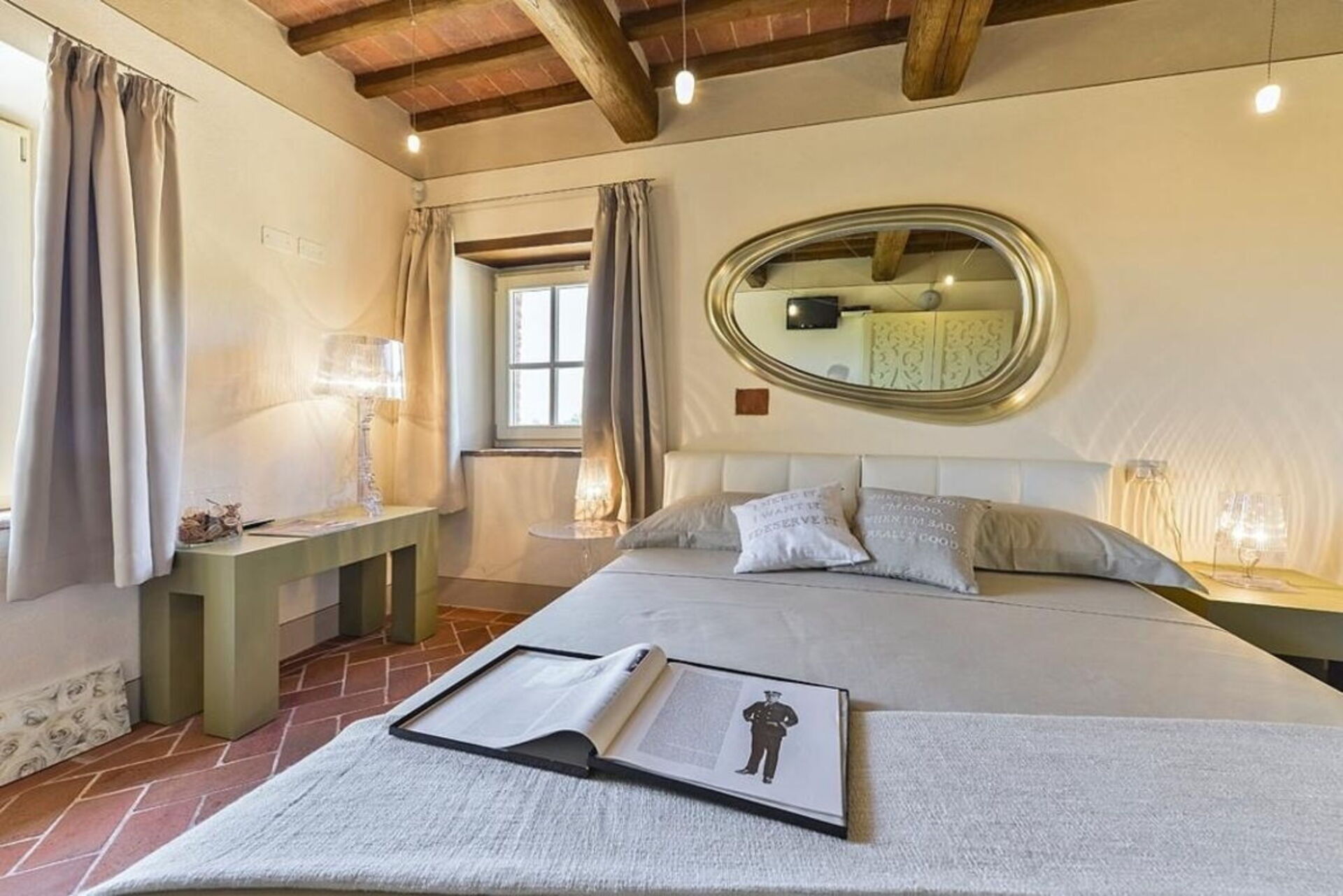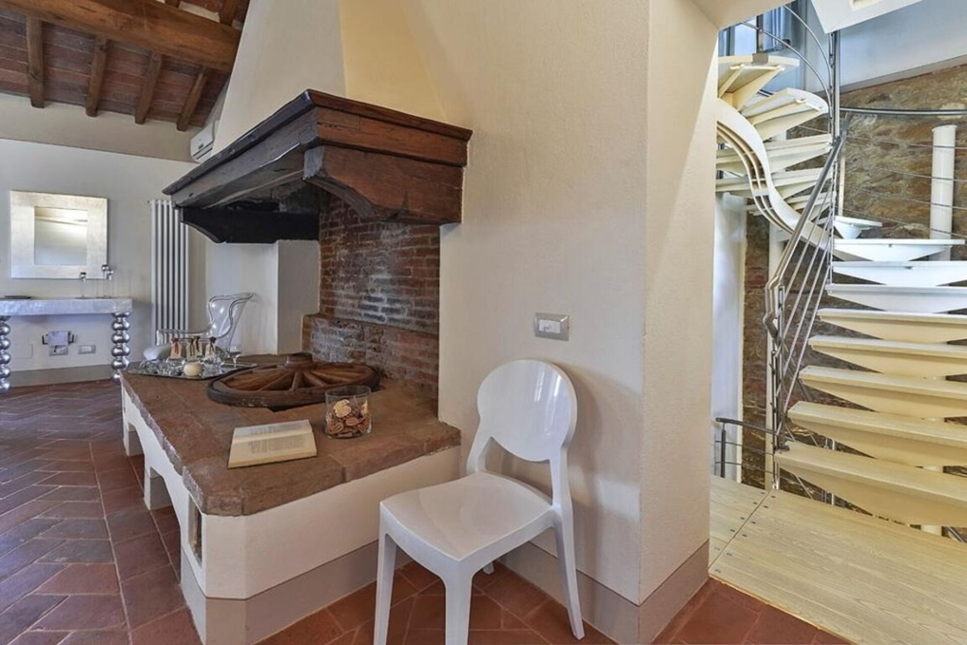 The villa, a masterfully restored work of art, welcomes you on two floors, culminating in a turret overlooking the hilly Tuscan landscape, seemingly painted by a divine brush.