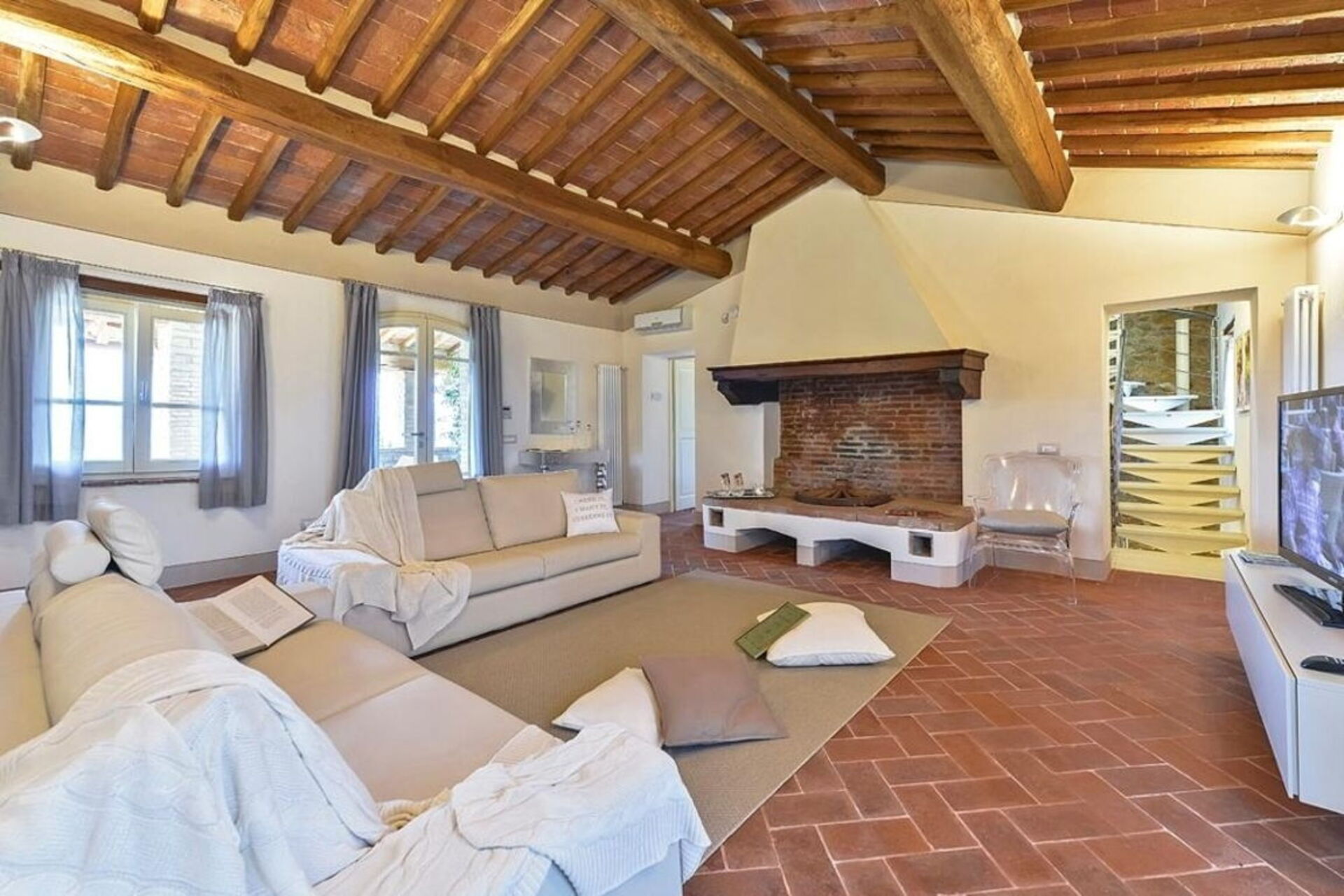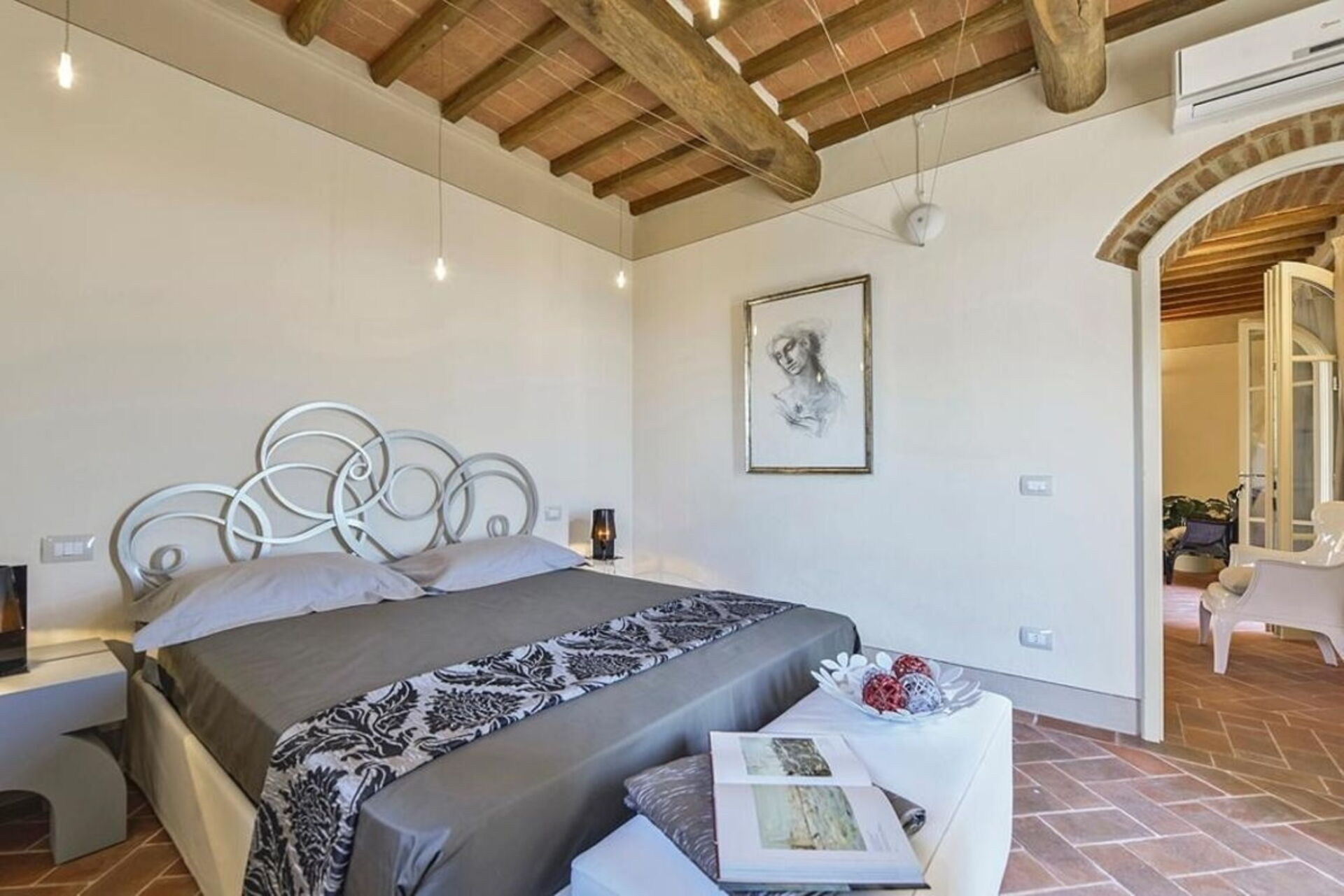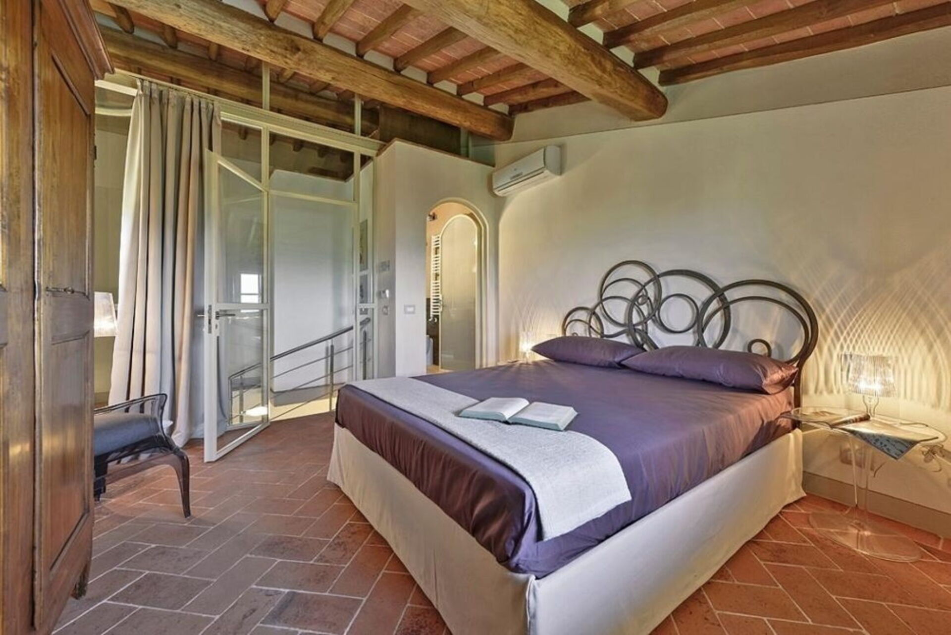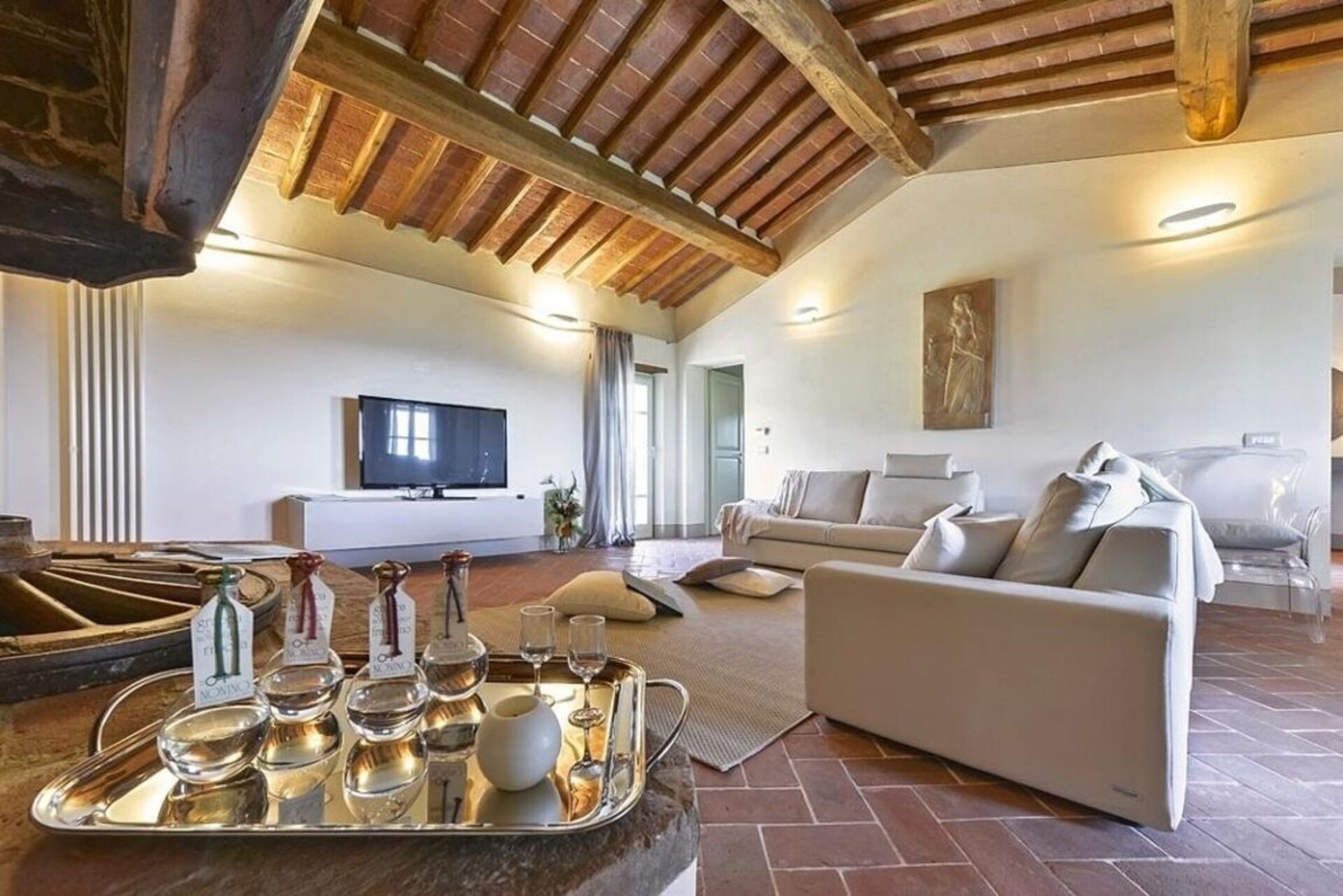 The villa, a masterfully restored work of art, welcomes you on two floors, culminating in a turret overlooking the hilly Tuscan landscape, seemingly painted by a divine brush.