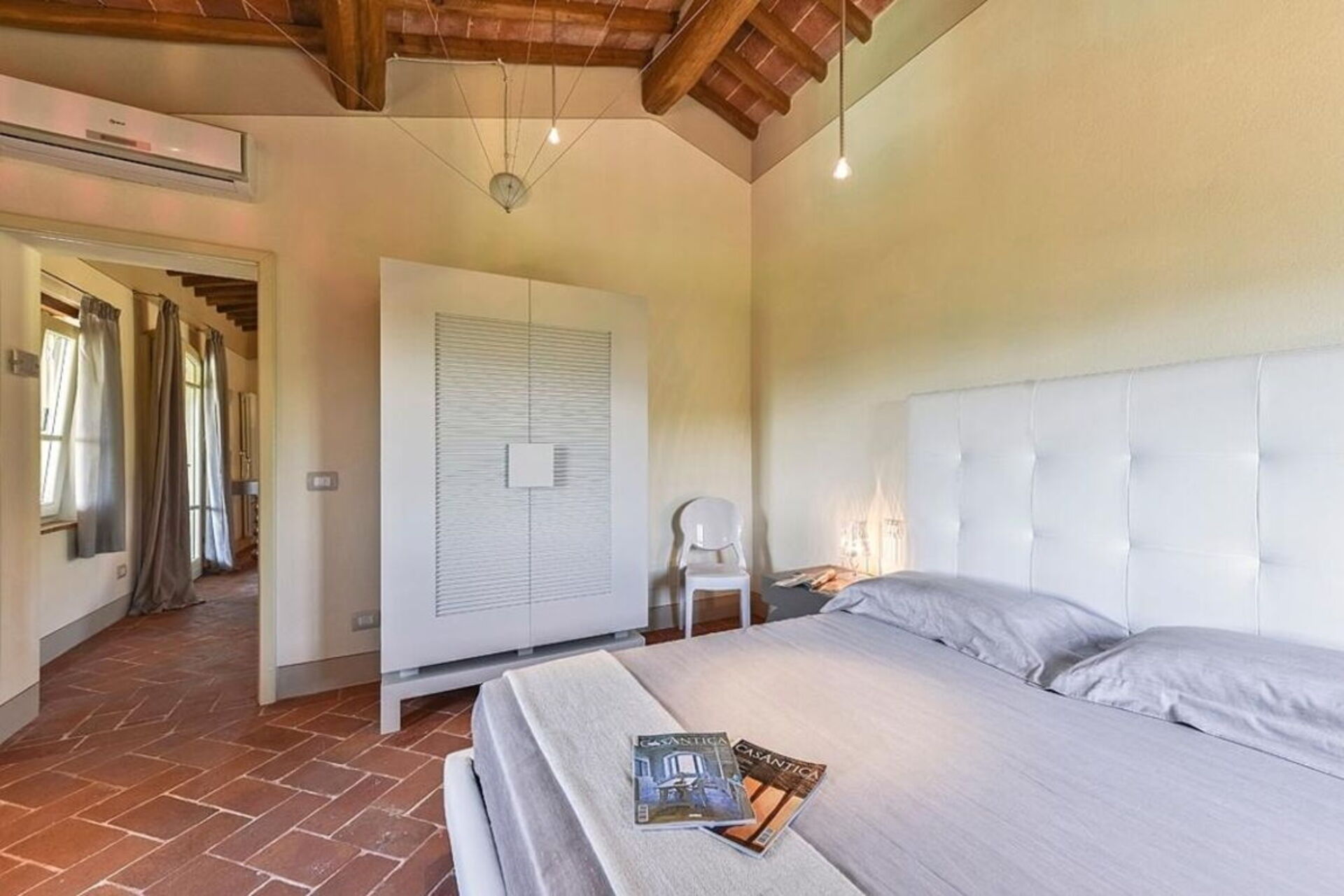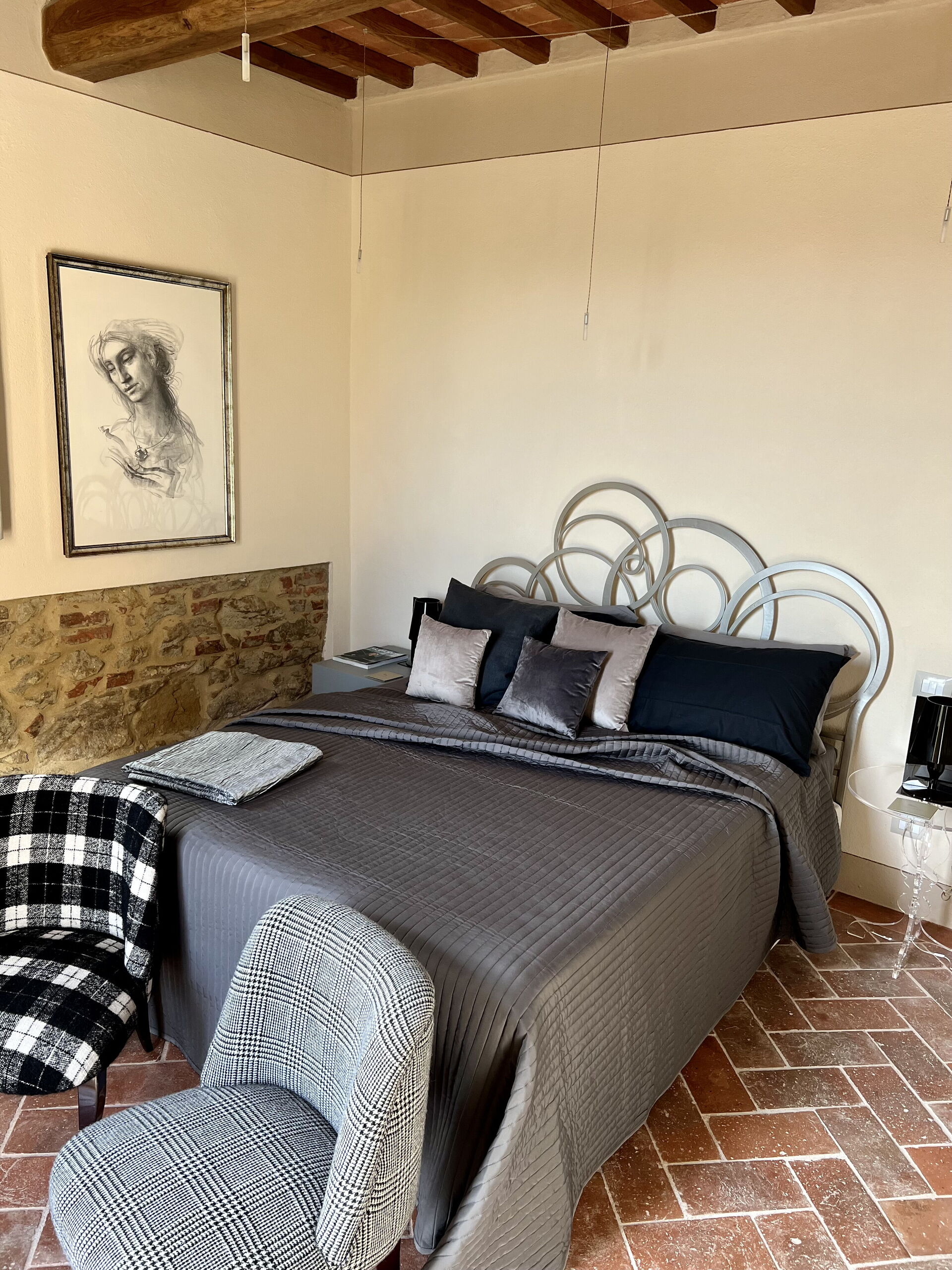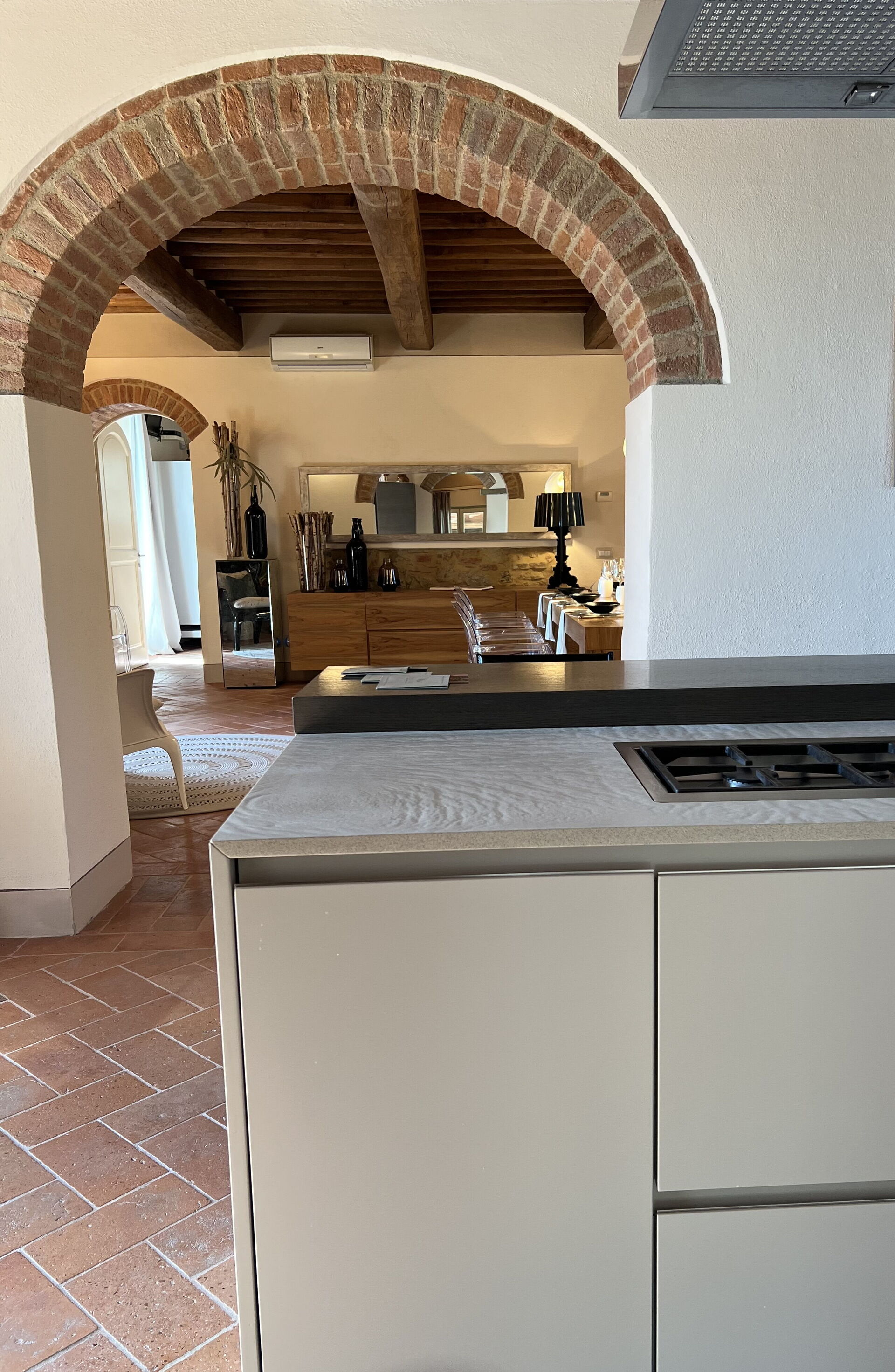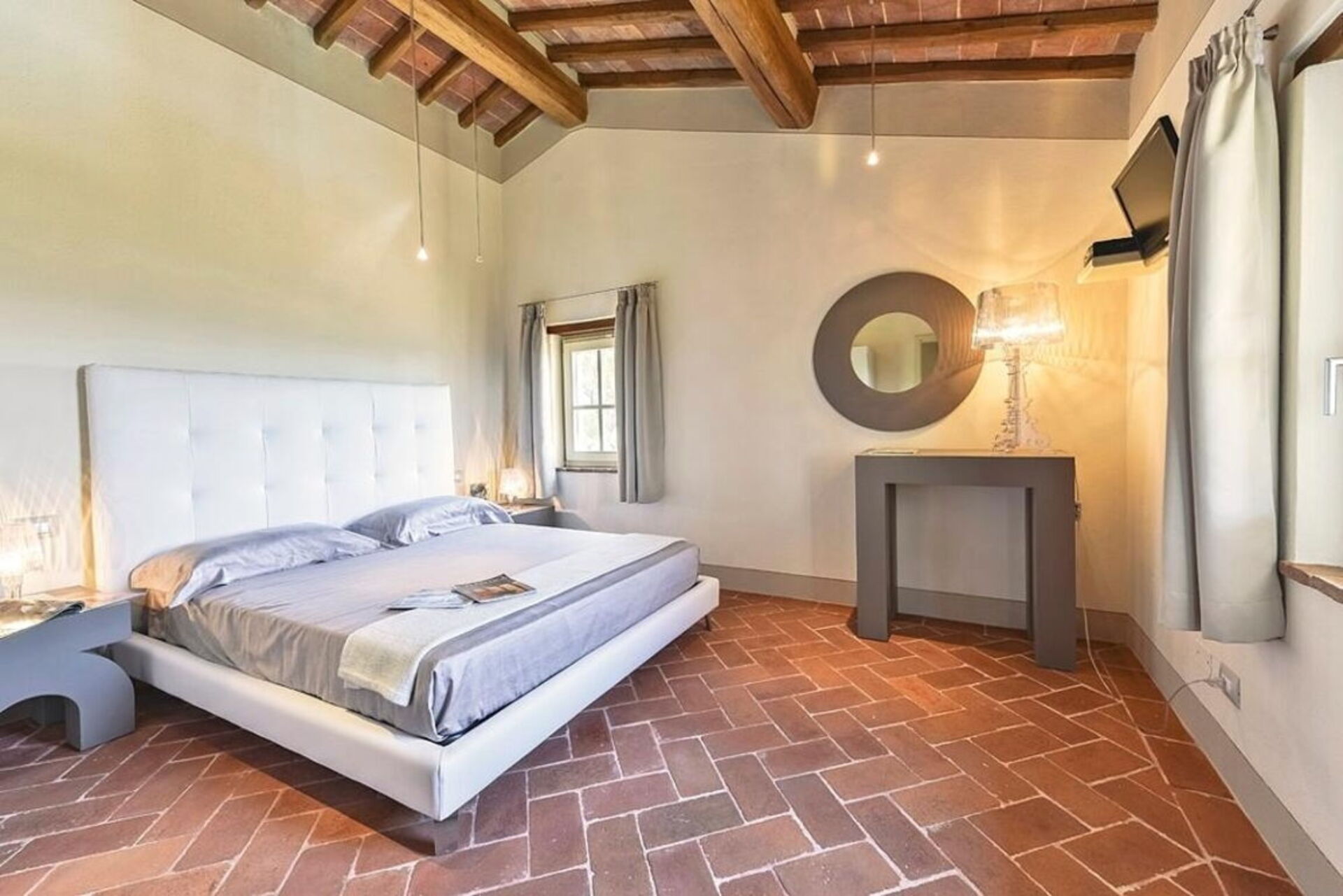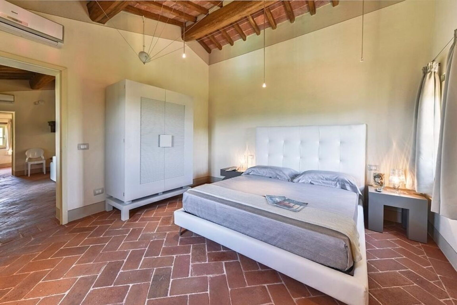 The villa, a masterfully restored work of art, welcomes you on two floors, culminating in a turret overlooking the hilly Tuscan landscape, seemingly painted by a divine brush.