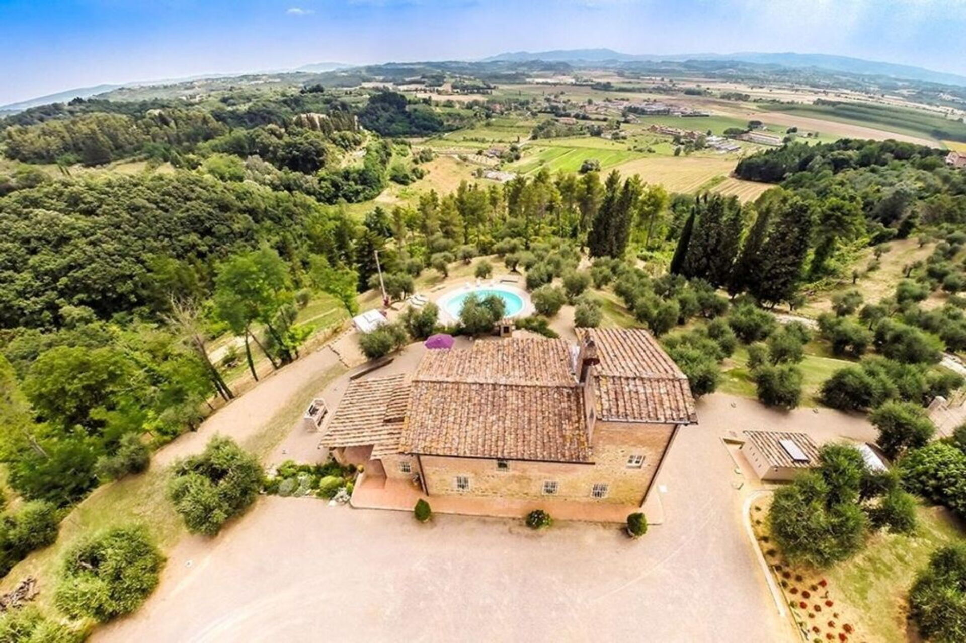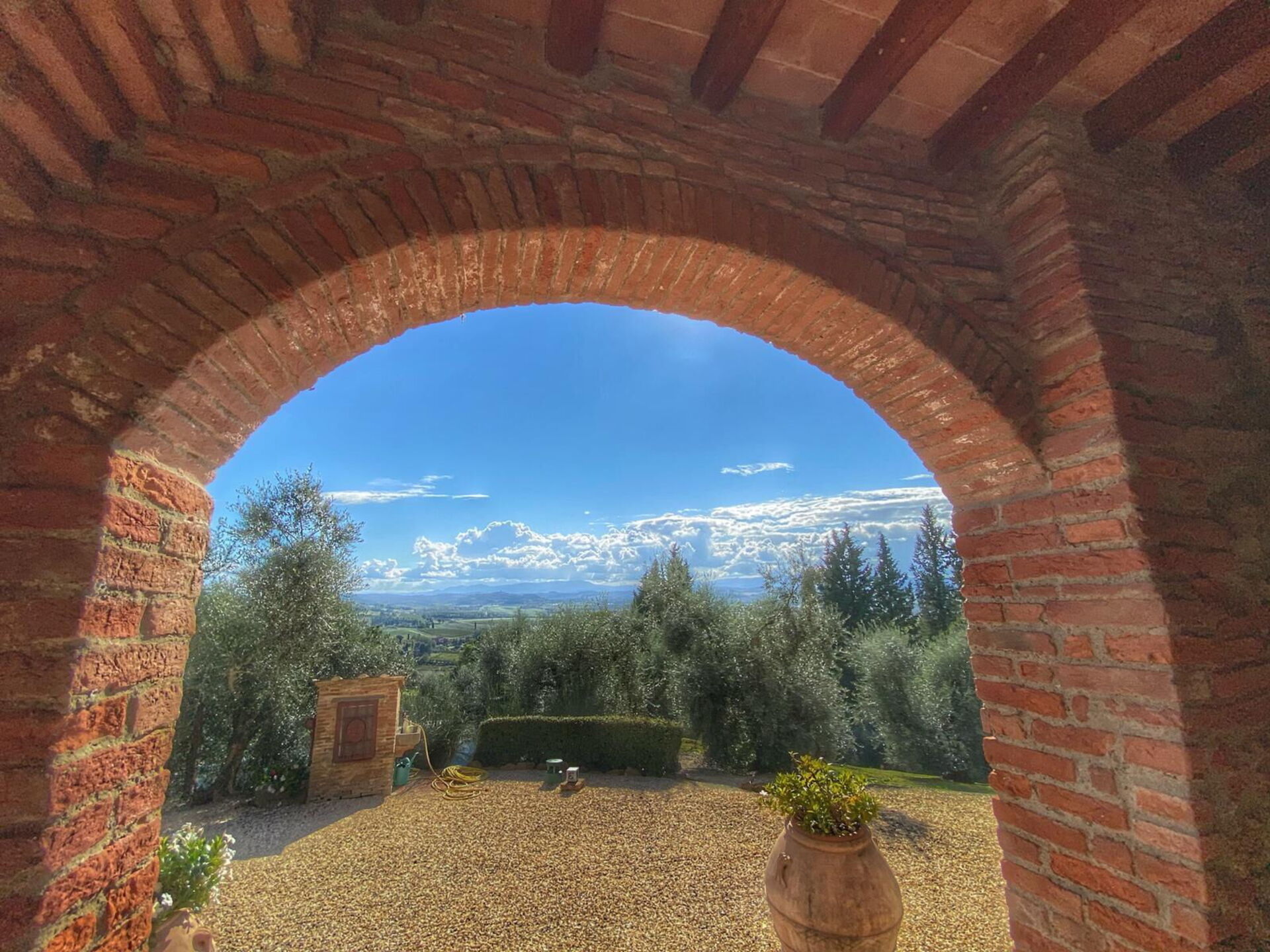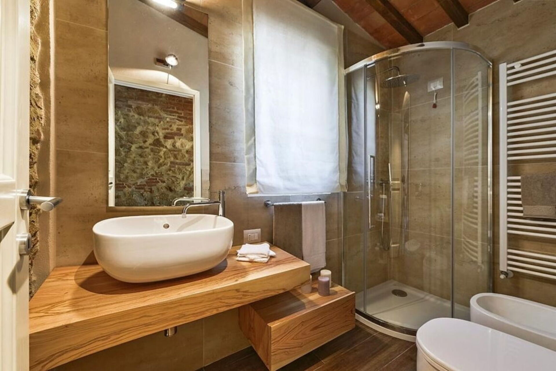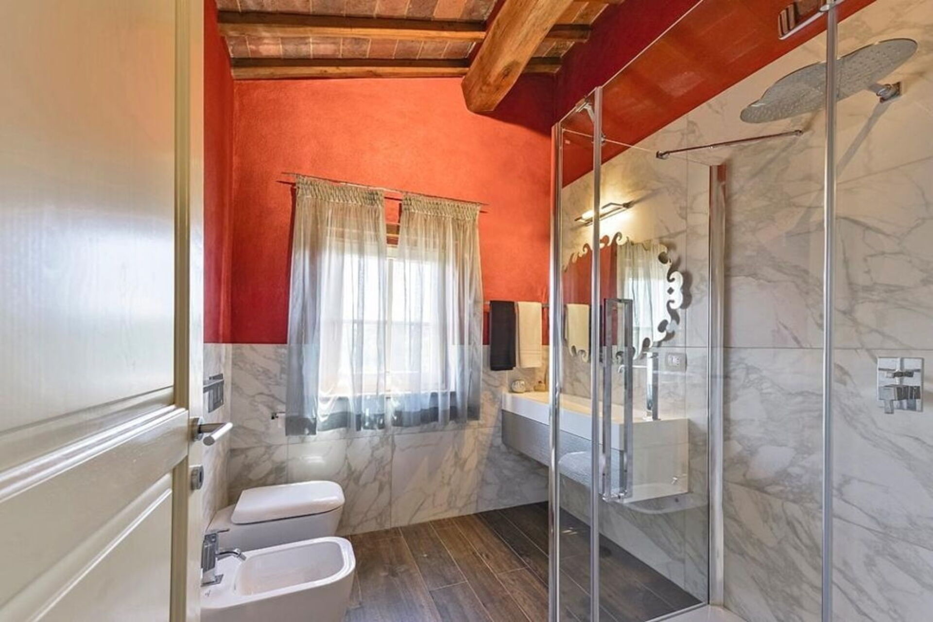The villa, a masterfully restored work of art, welcomes you on two floors, culminating in a turret overlooking the hilly Tuscan landscape, seemingly painted by a divine brush.