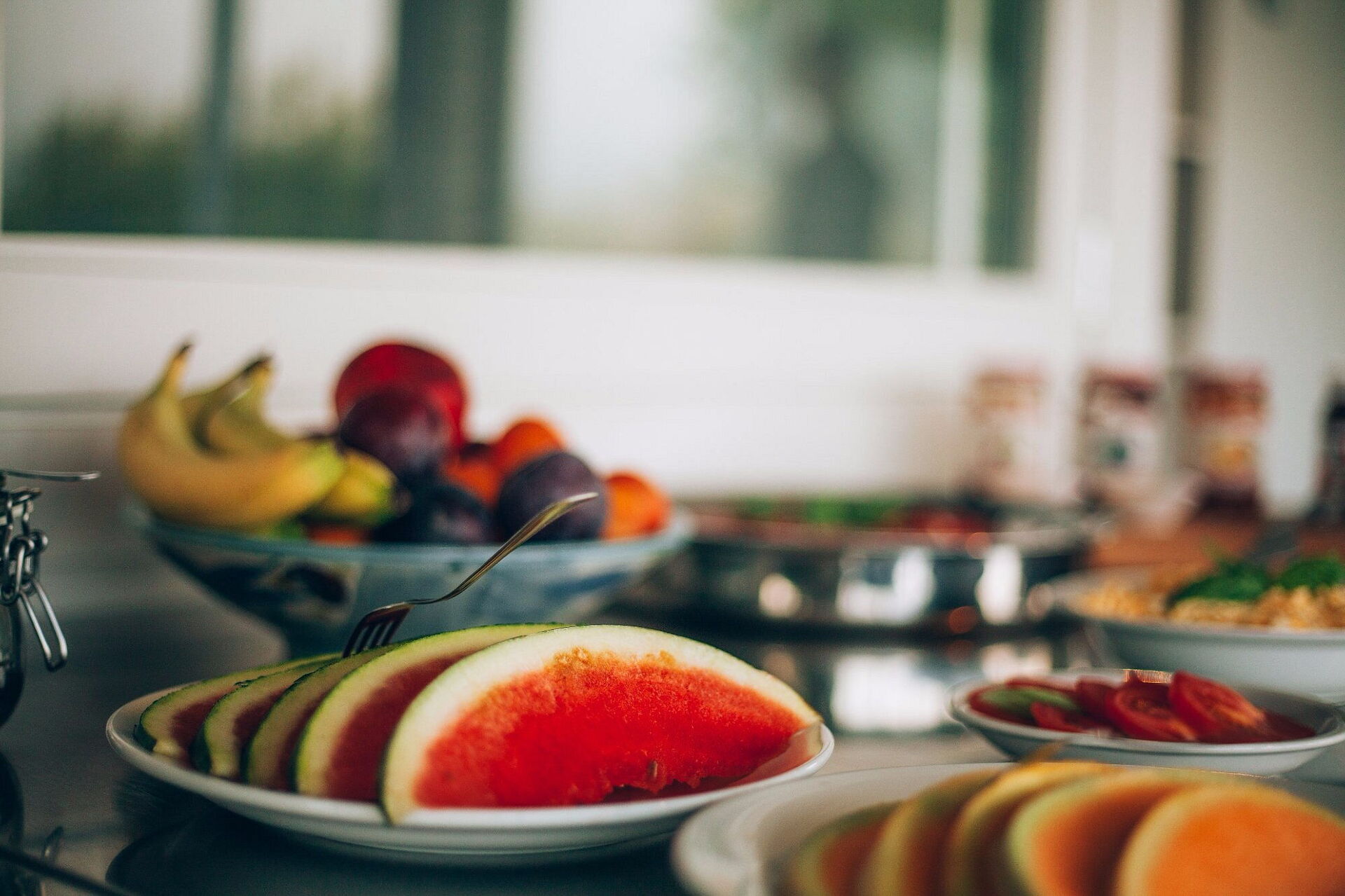Breakfast in the main kitchen with fresh local produce; water and coffee always available.