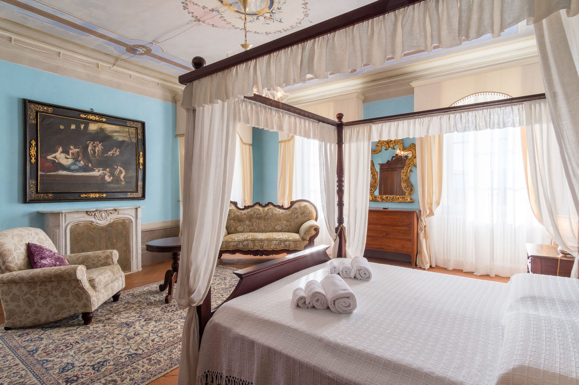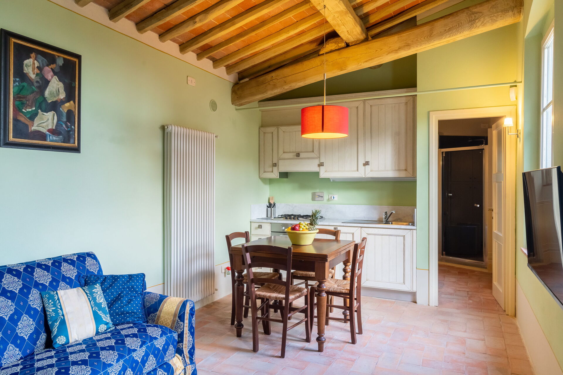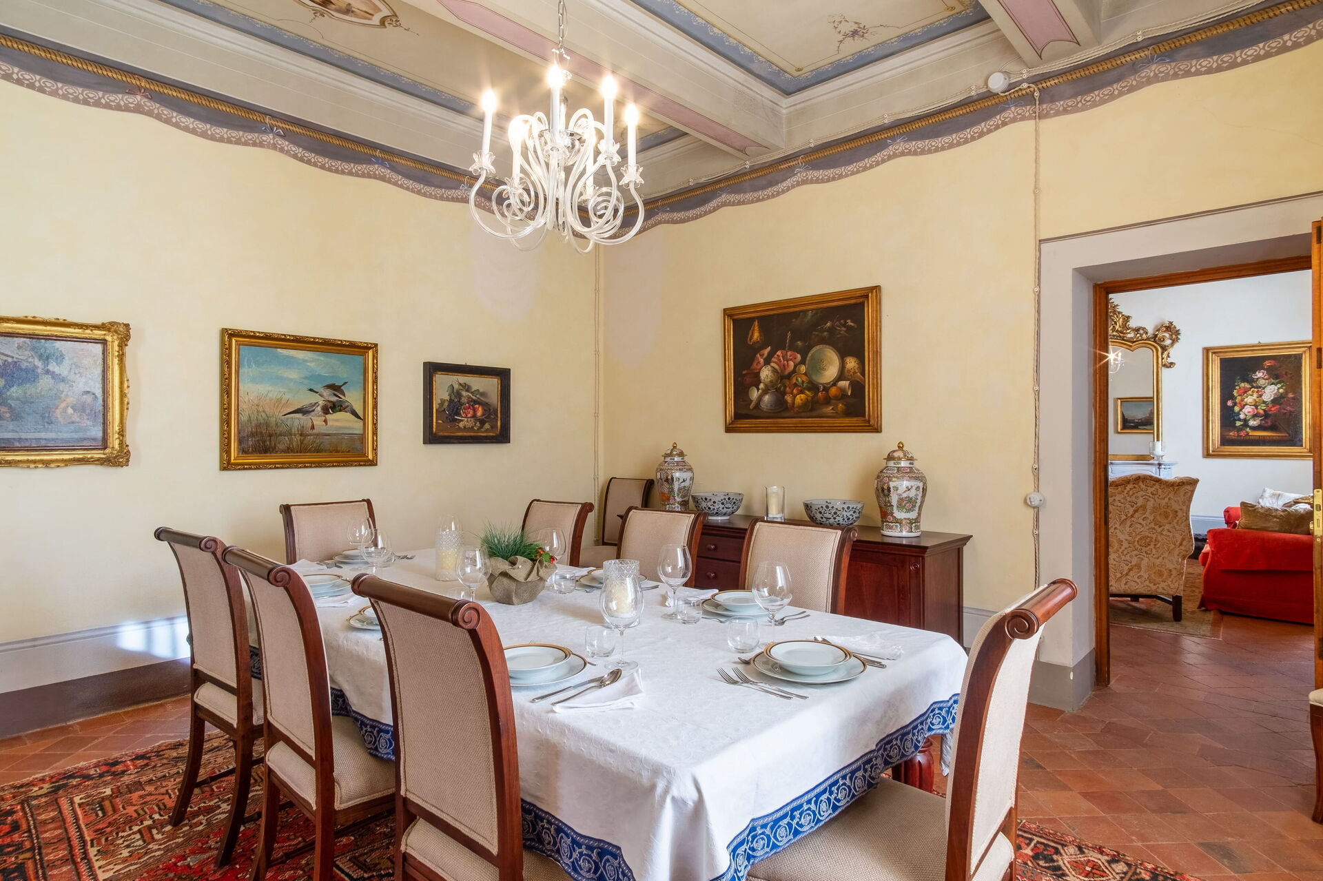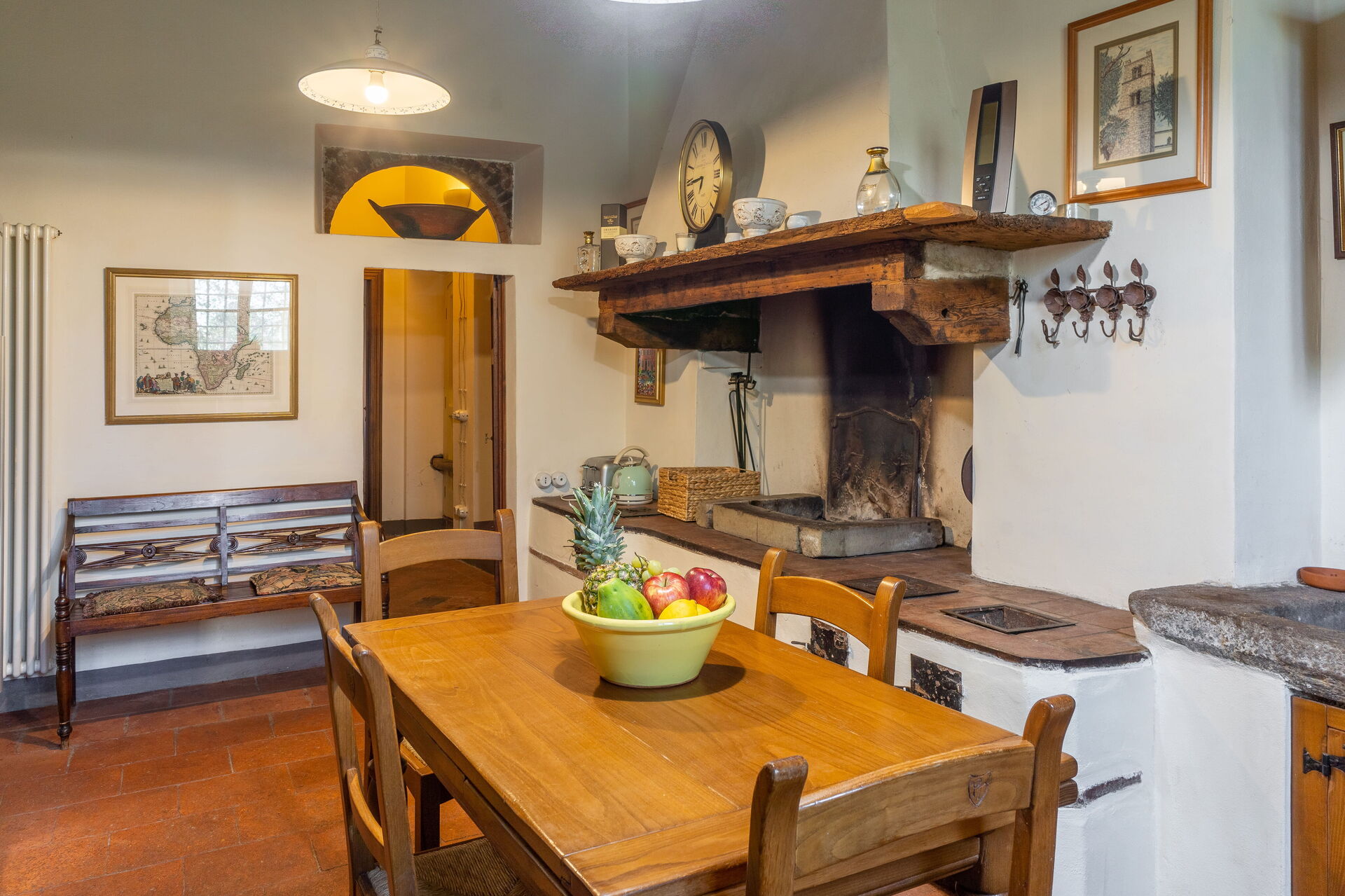 On the ground floor a large living room and a beautiful frescoed dining room welcome visitors, and then allow access to a well-equipped study and the beautiful original kitchen with with fireplace and equipped with all comforts.