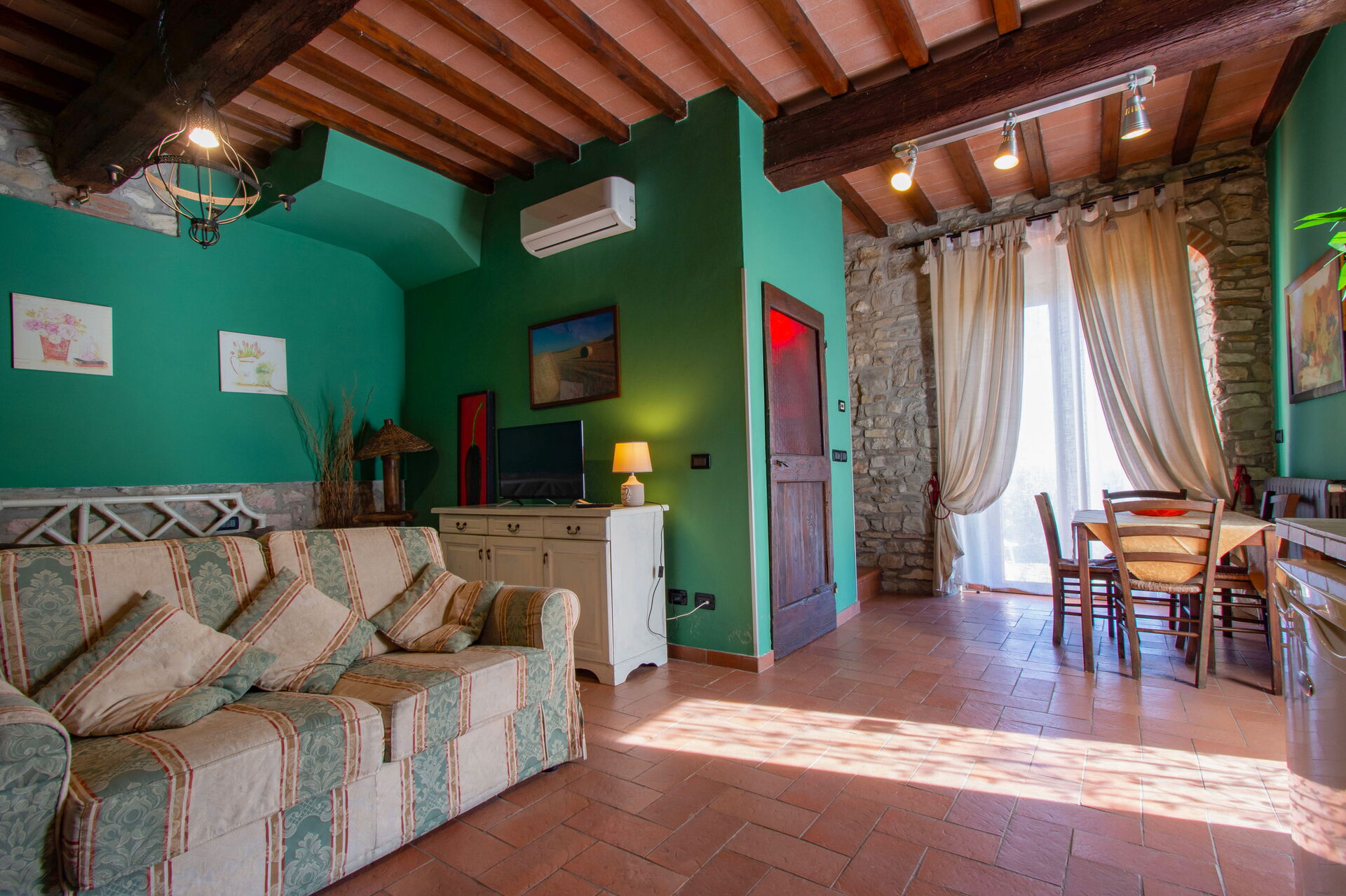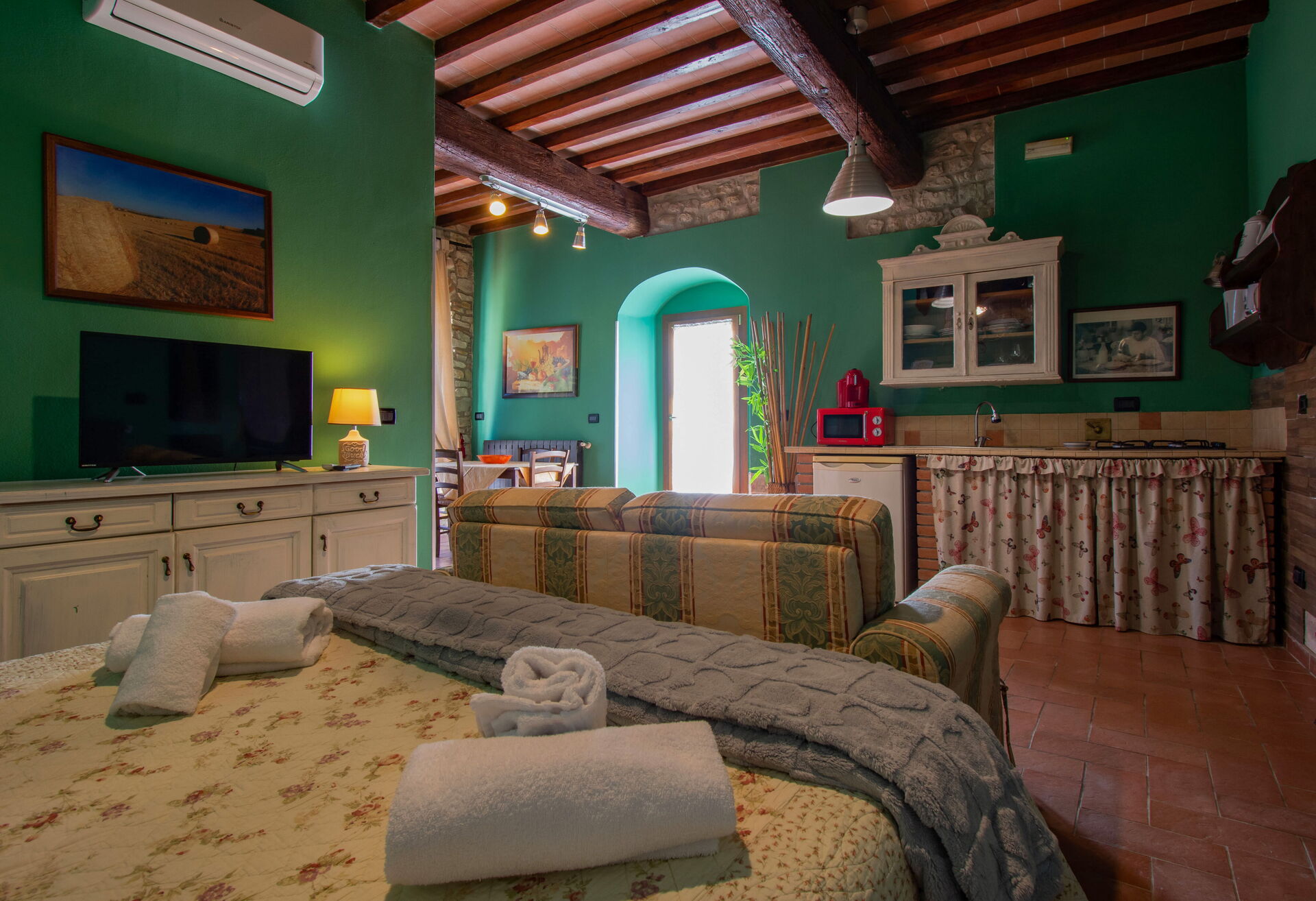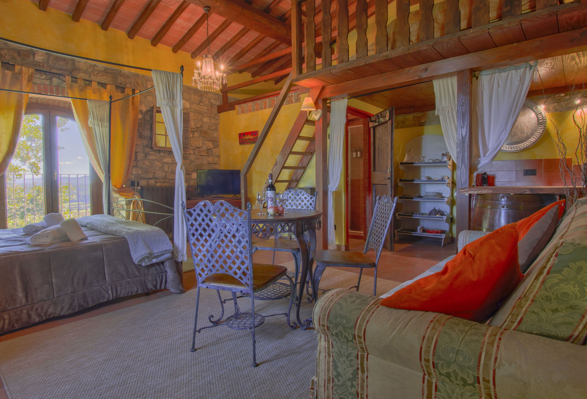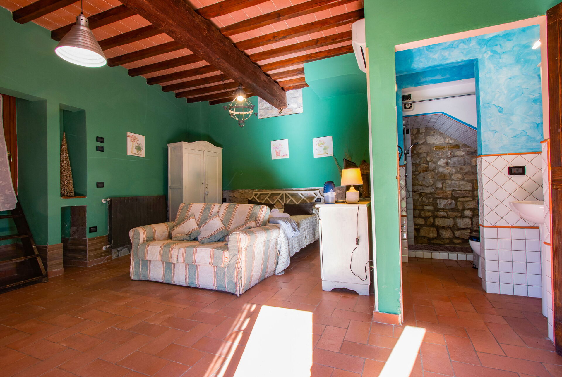 The two cottages consist of 4 apartments (two for each cottage) and can accommodate up to 14 people for a total of 6 bedrooms (including 2 loft rooms) and 4 bathrooms. Each apartment, internally characterized by exposed beams and Florentine terracotta flooring, is made up of 1 double bedroom, an equipped kitchen, a bathroom with shower and air conditioning. Moreover, two apartments also have 2 loft rooms (each with 3 single beds), while the other two apartments have a sofa bed (that can be used if necessary). Air conditioning has an extra cost. Pets are allowed at an extra cost.