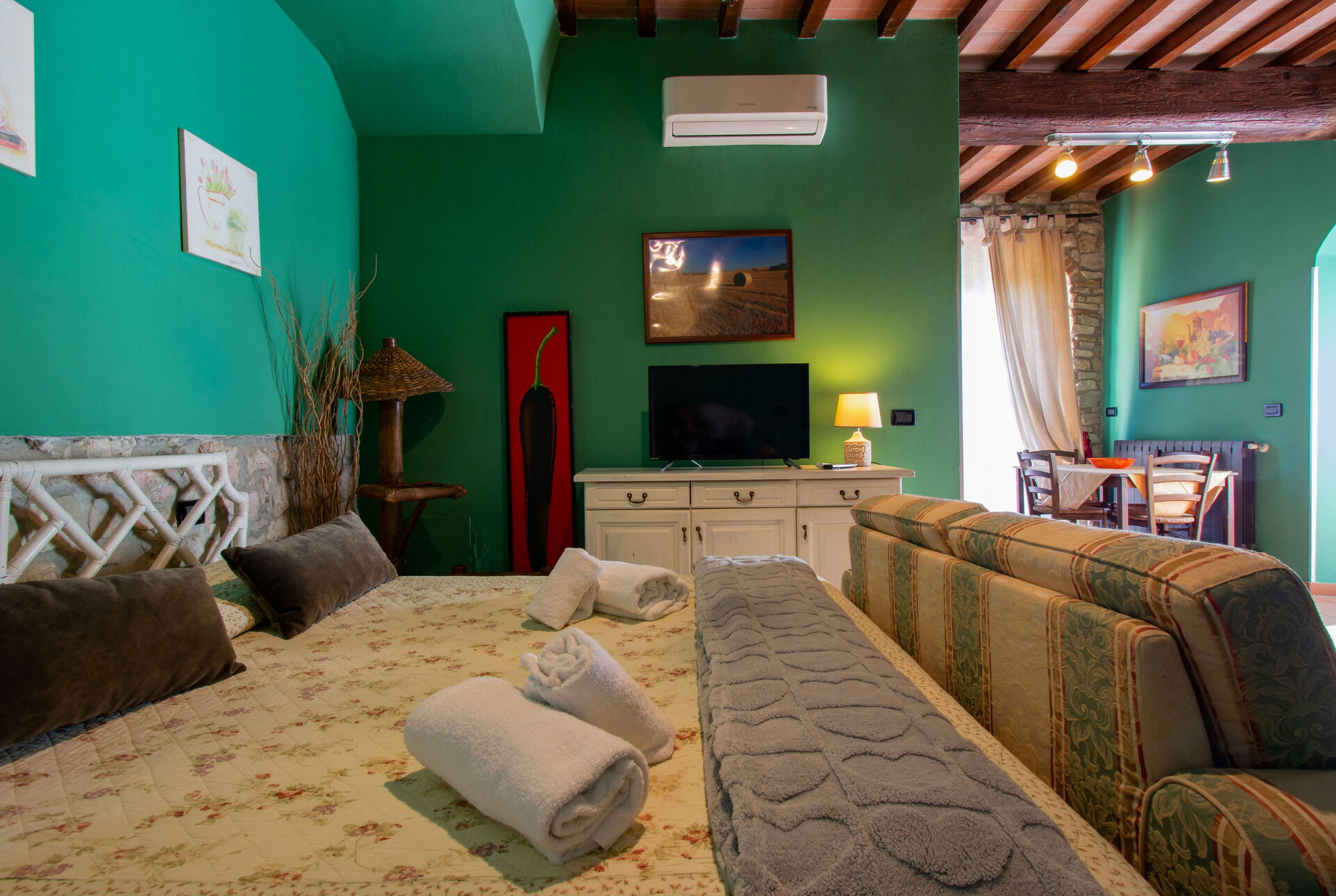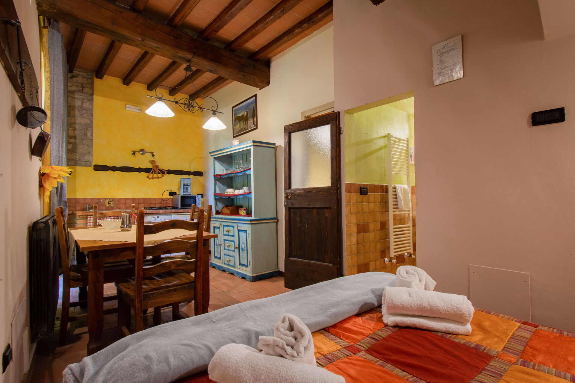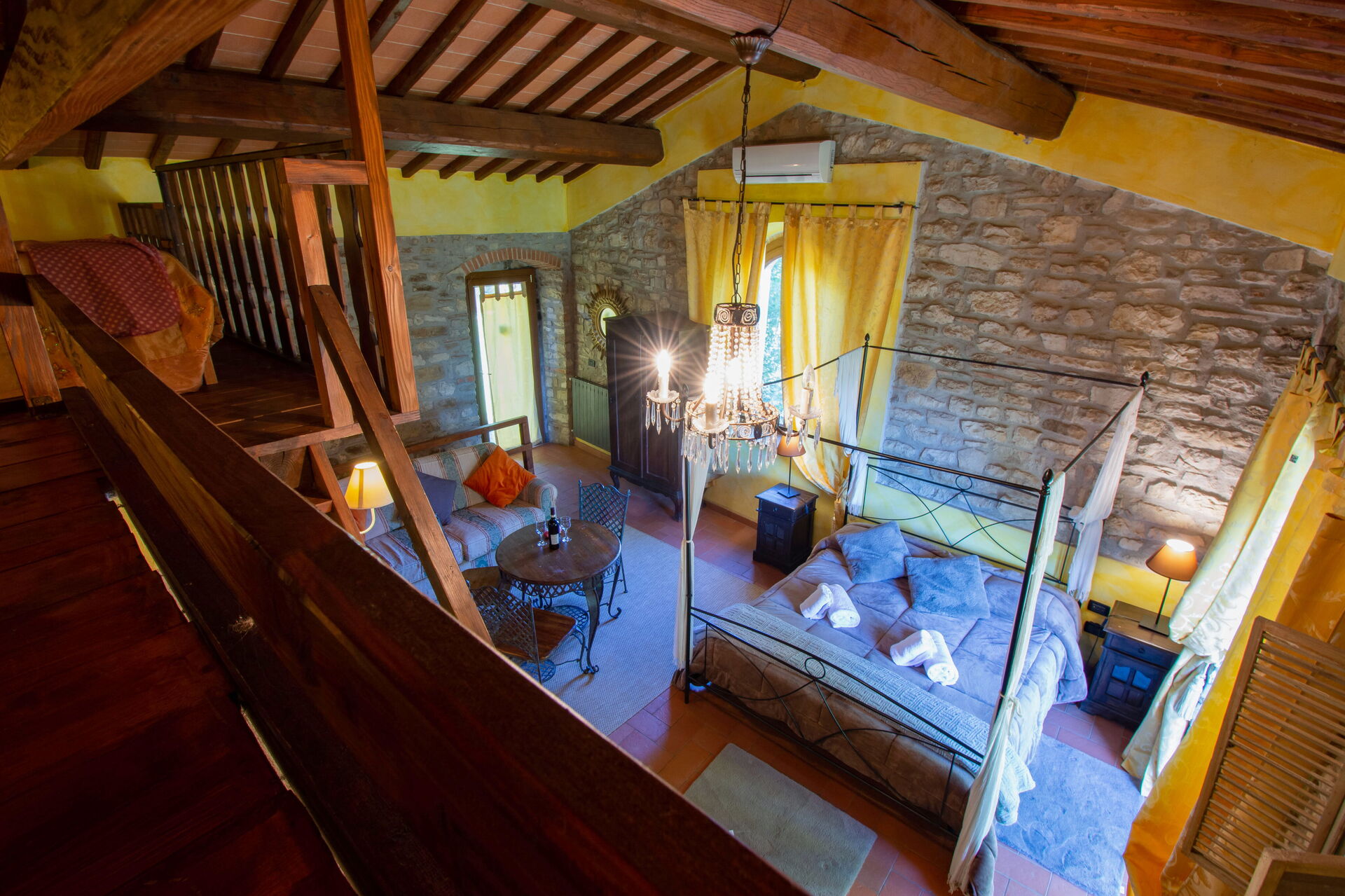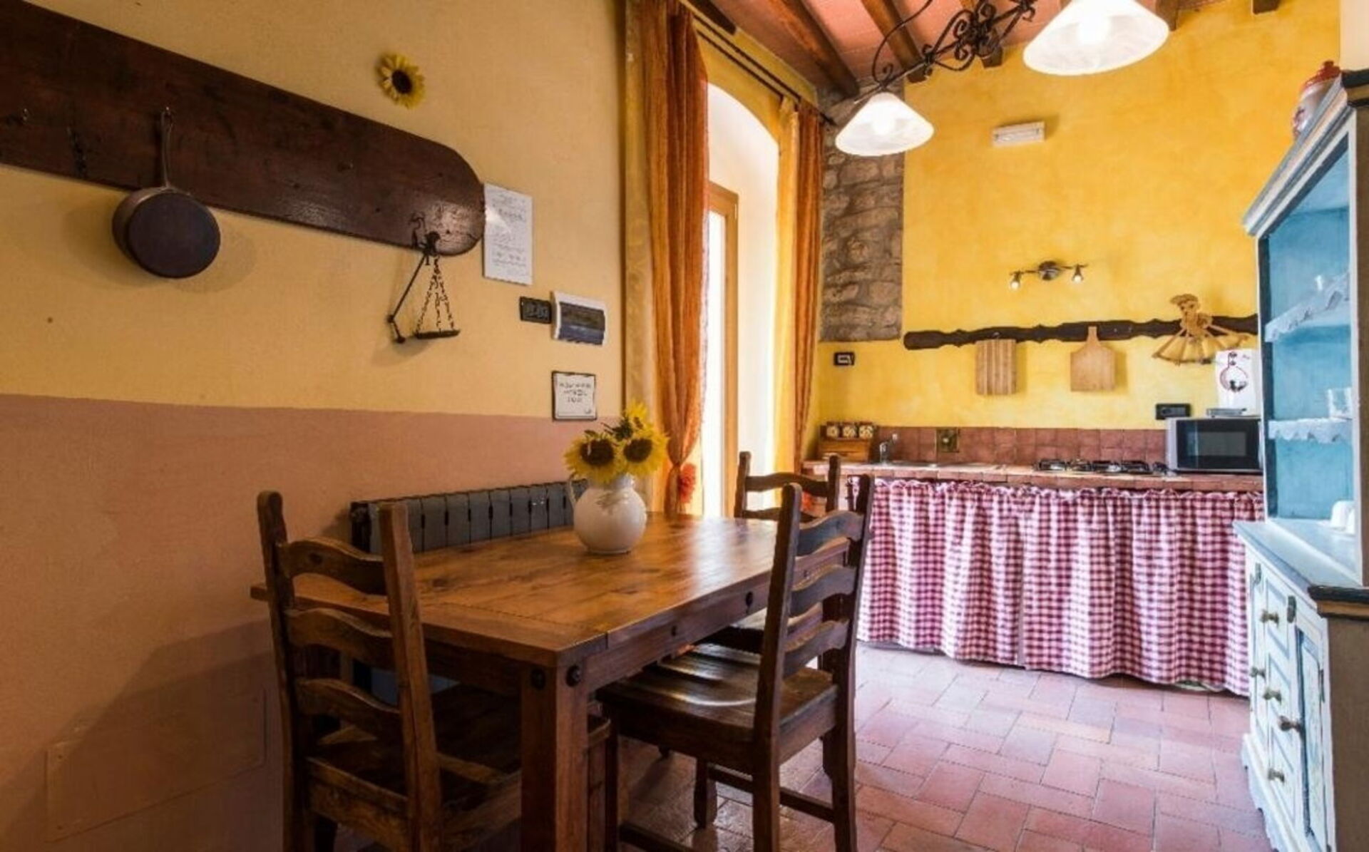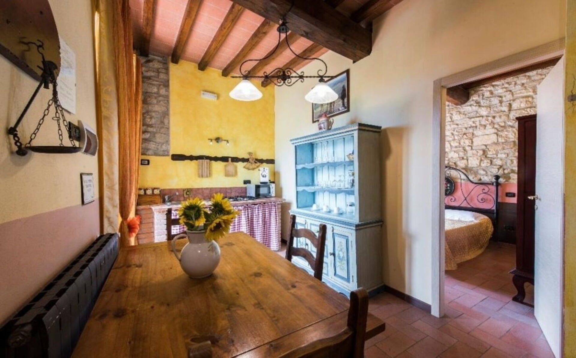 The two cottages consist of 4 apartments (two for each cottage) and can accommodate up to 14 people for a total of 6 bedrooms (including 2 loft rooms) and 4 bathrooms. Each apartment, internally characterized by exposed beams and Florentine terracotta flooring, is made up of 1 double bedroom, an equipped kitchen, a bathroom with shower and air conditioning. Moreover, two apartments also have 2 loft rooms (each with 3 single beds), while the other two apartments have a sofa bed (that can be used if necessary). Air conditioning has an extra cost. Pets are allowed at an extra cost.