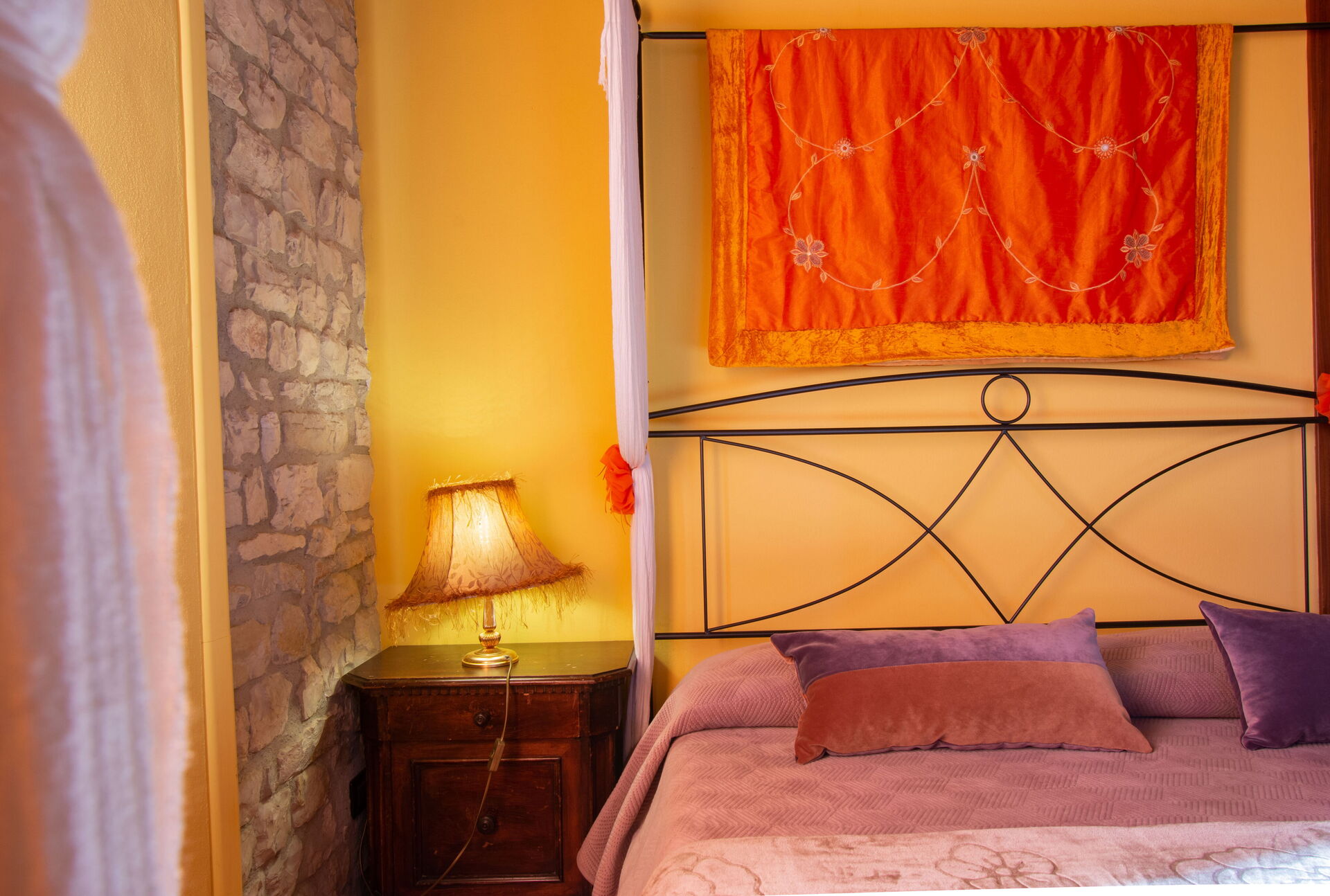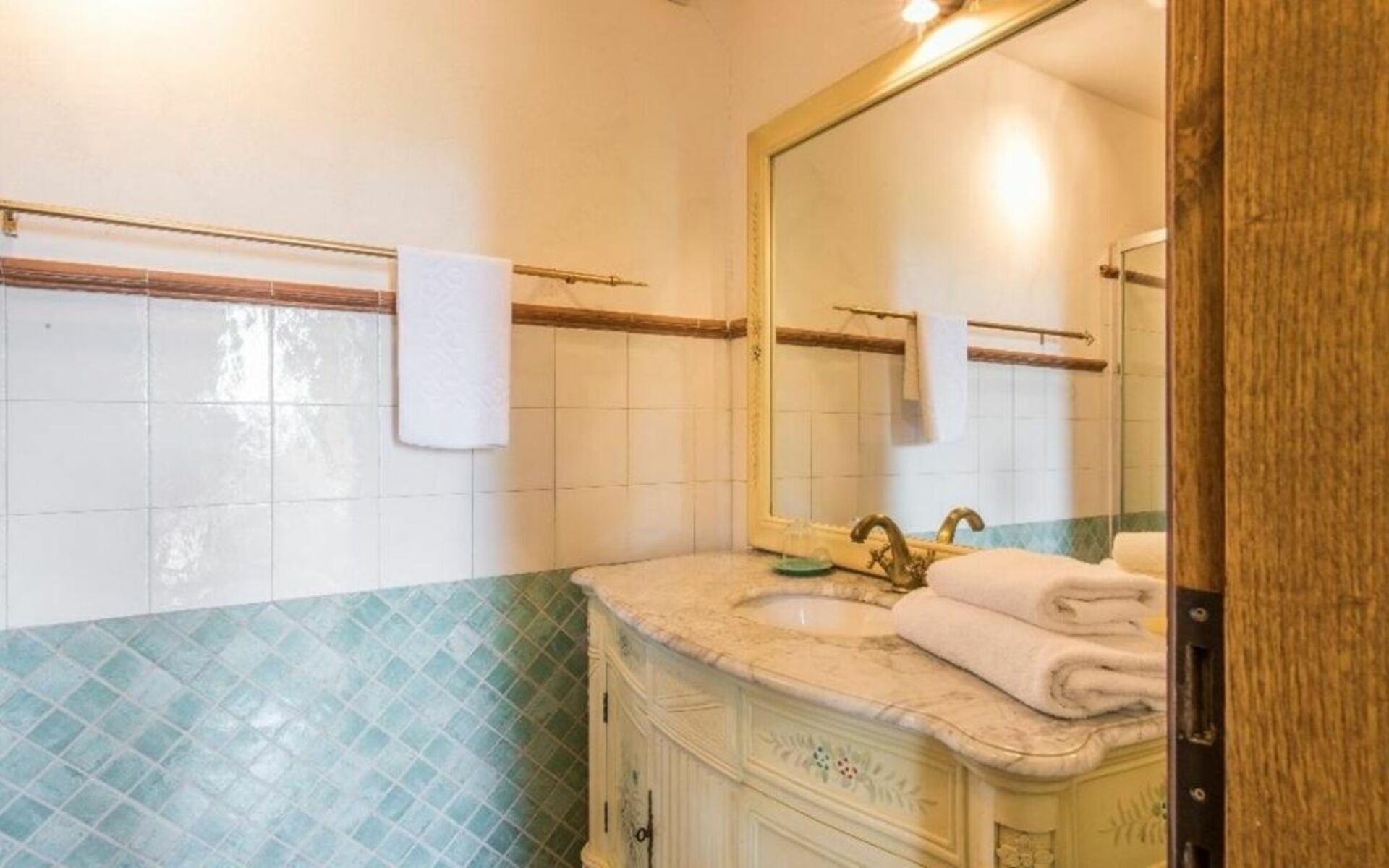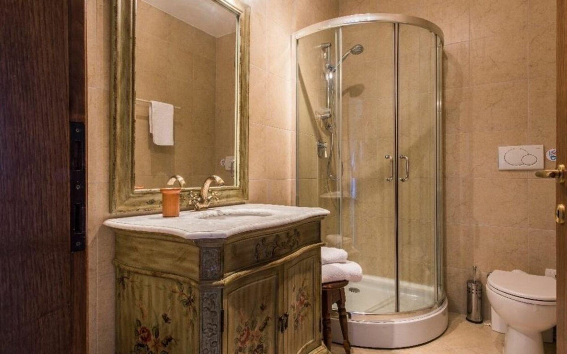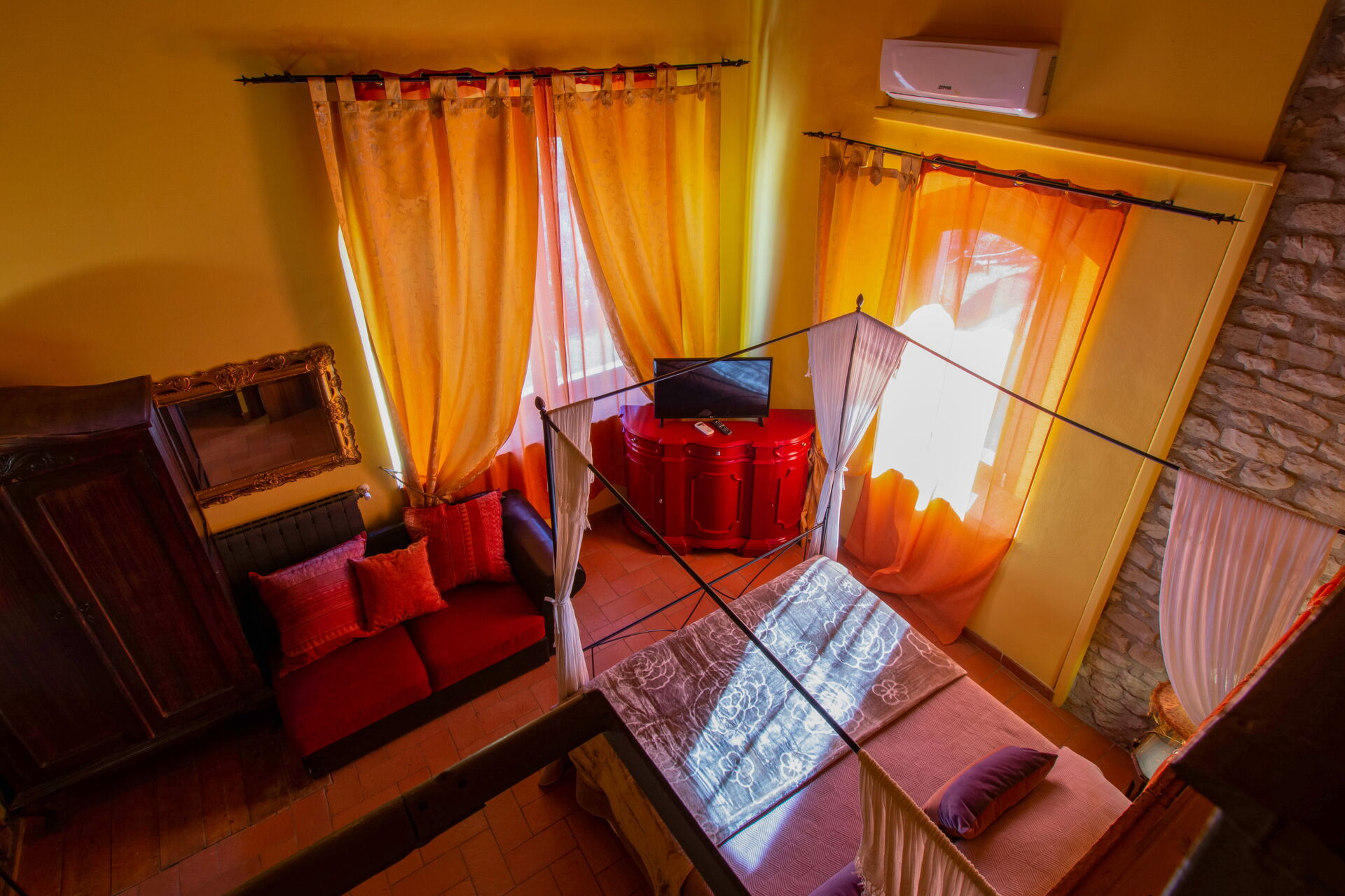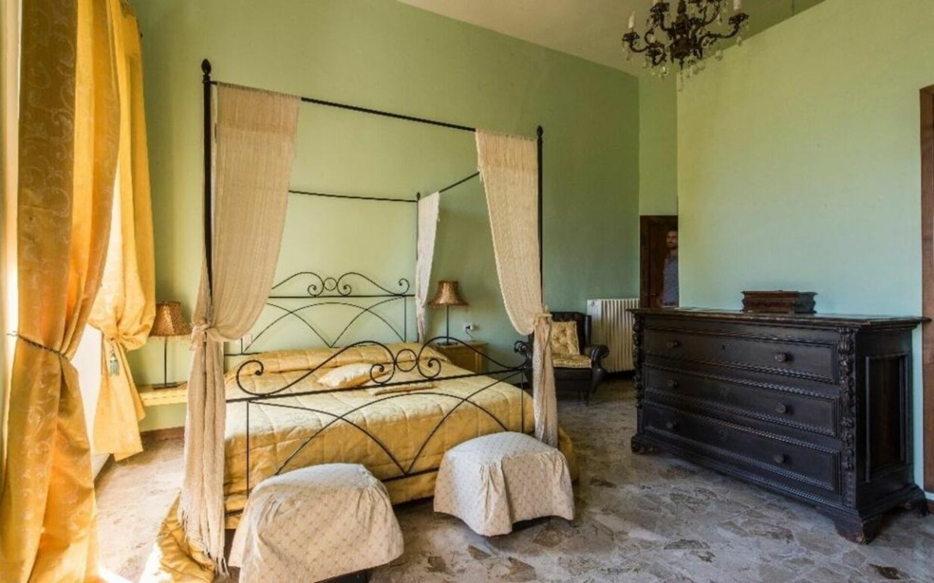 Ground floor: two double bedrooms: one with four-poster bed and bathroom with shower; the other one with a small balcony and bathroom with shower.